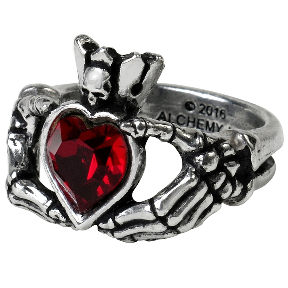 Bague en étain représentant une version gothique du Claddagh irlandais; deux mains squelettiques encerclant le doigt et tenant un coeur en cristal Swarovski rouge surmonté d'une couronne avec un minuscule crâne.