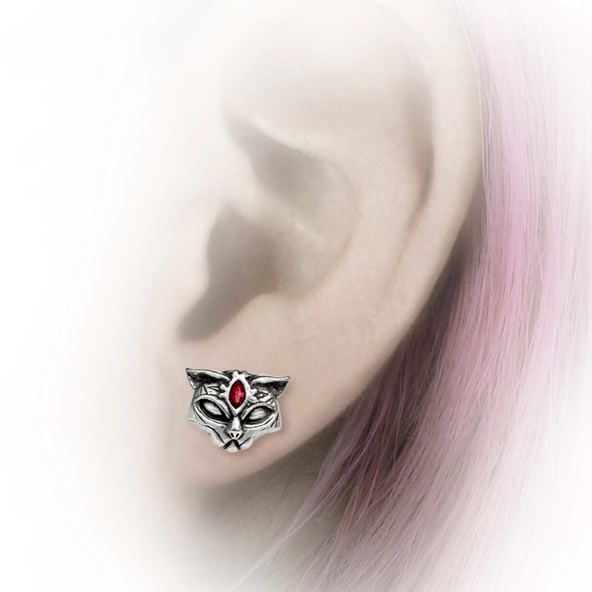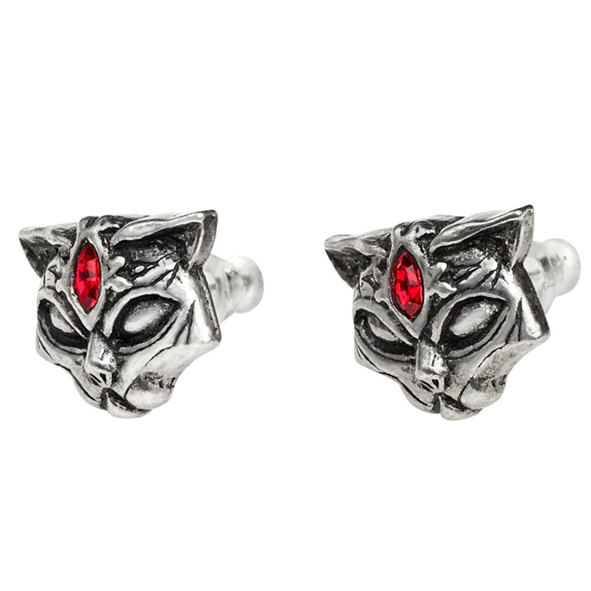 • Une paire de clous d'oreilles têtes de chat en étain vieilli avec de petits cristaux d'ellips autrichiens rouges sur le front.