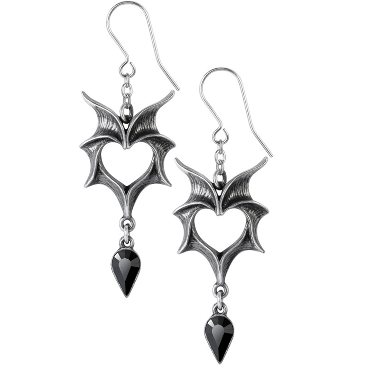 • Une paire de boucles d'oreilles en forme d'ailes de chauve-souris stylisées formant un espace ouvert en forme de cœur au centre, et avec un petit compte-gouttes en cristal autrichien en dessous ; sur chaîne courte et fils d'oreille en acier chirurgical.
