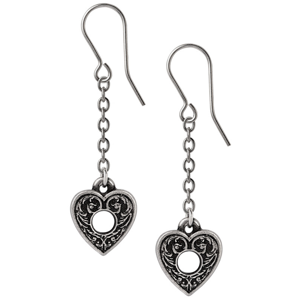 Amour gothique des créatures les plus sombres de la nuit. • Une paire de boucles d'oreilles en forme d'ailes de chauve-souris stylisées formant un espace ouvert en forme de cœur au centre, et avec...