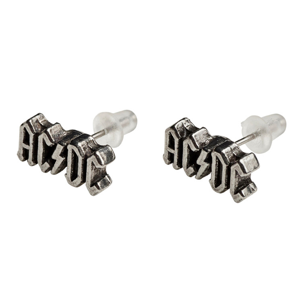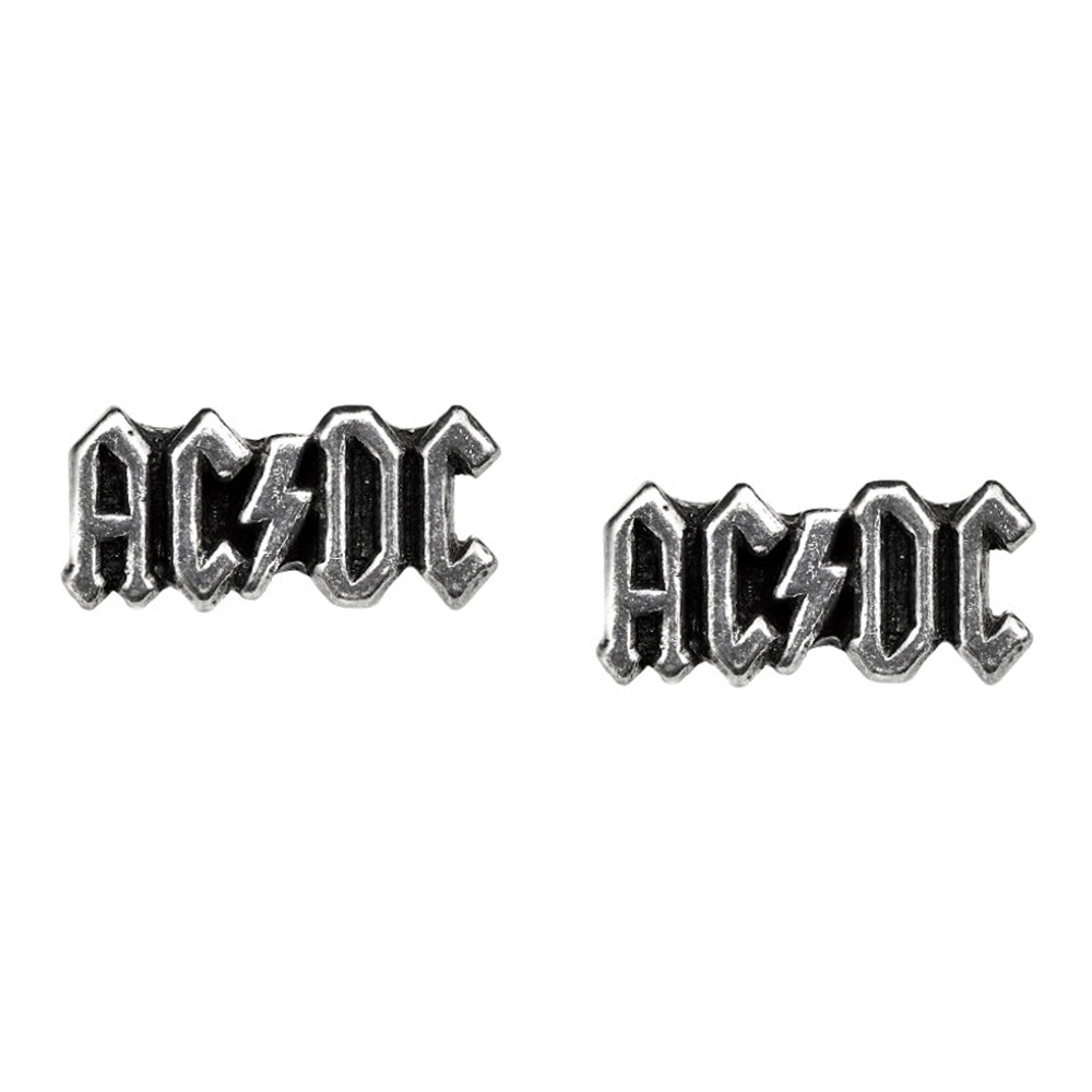 • Une paire de boucles d'oreilles à tige en étain anglais arborant le logo classique en forme d'éclair d'AC/DC.