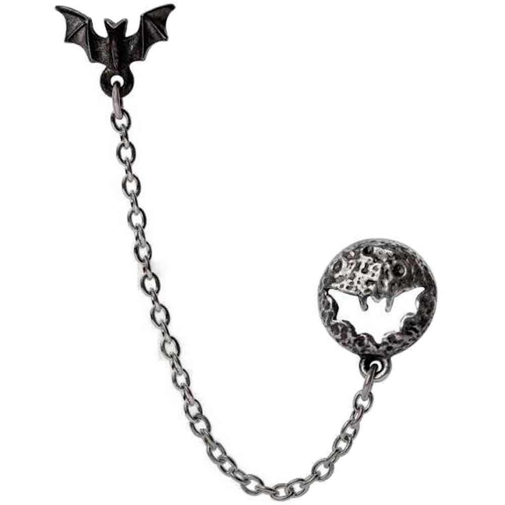 • Fabriqué à la main à partir d'étain anglais vieilli fin, ce design enchanteur présente une lune avec une silhouette de chauve-souris découpée gracieusement liée à une chauve-souris noircie par une chaîne délicate.