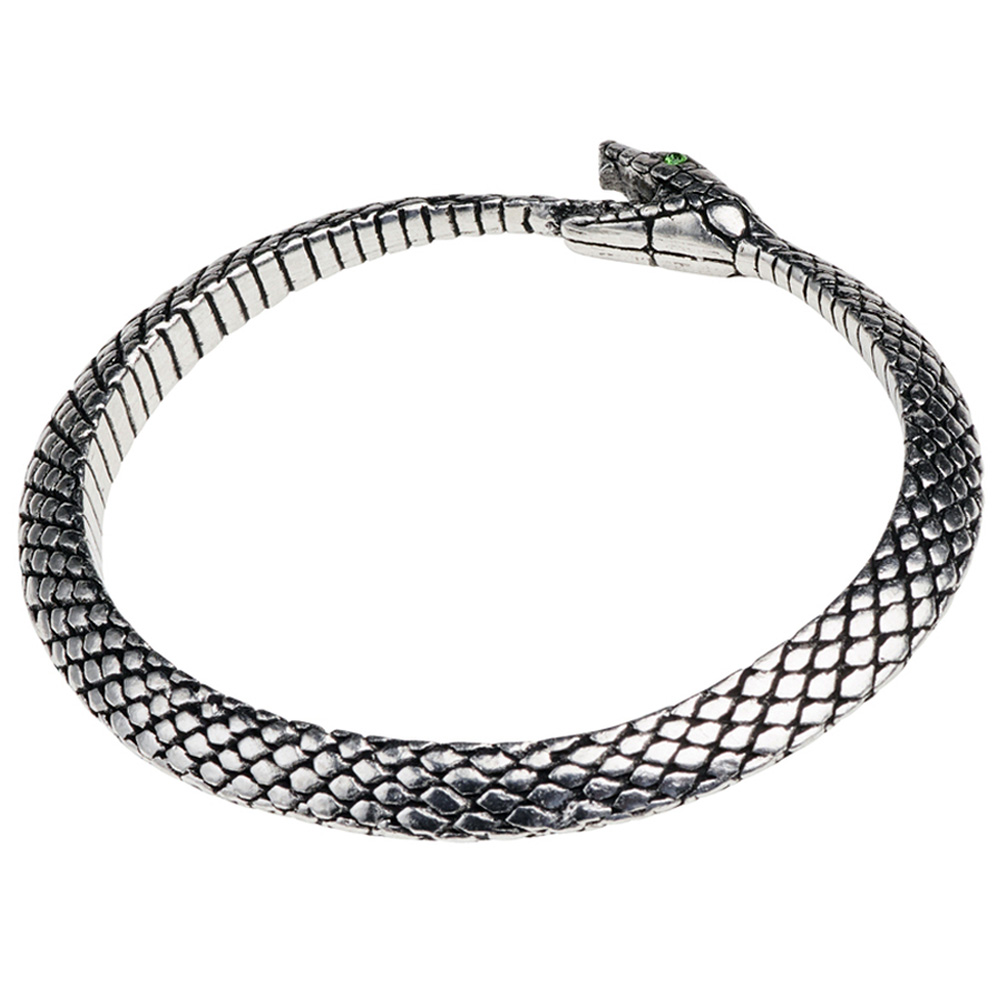 • Un bracelet en serpent massif en étain moulé détaillé (pas de réglage), avec de petits cristaux Swarovski verts incrustés dans ses yeux.