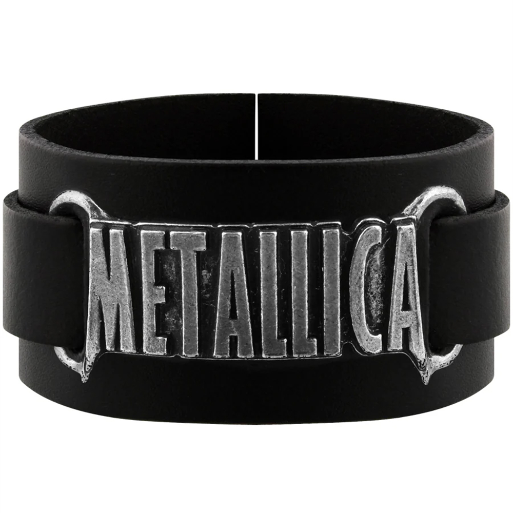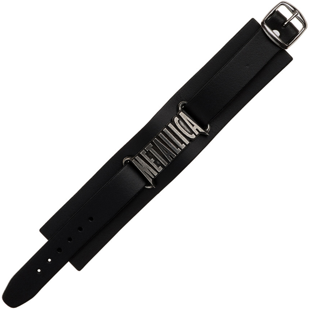 • Un bracelet en cuir noir de 38 mm de large avec une plaque à maillons en étain anglais antique moulé du logo Metallica ; longueur réglable, fermée par une boucle en acier.