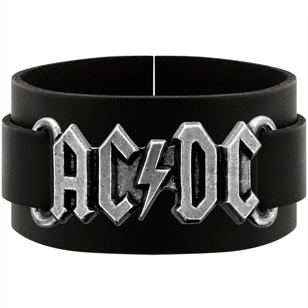 • Un bracelet en cuir noir de 38 mm de large avec une plaque à maillons en étain anglais antique moulé du logo classique d'AC/DC de 1977 ; longueur réglable, fermée par une boucle en acier.