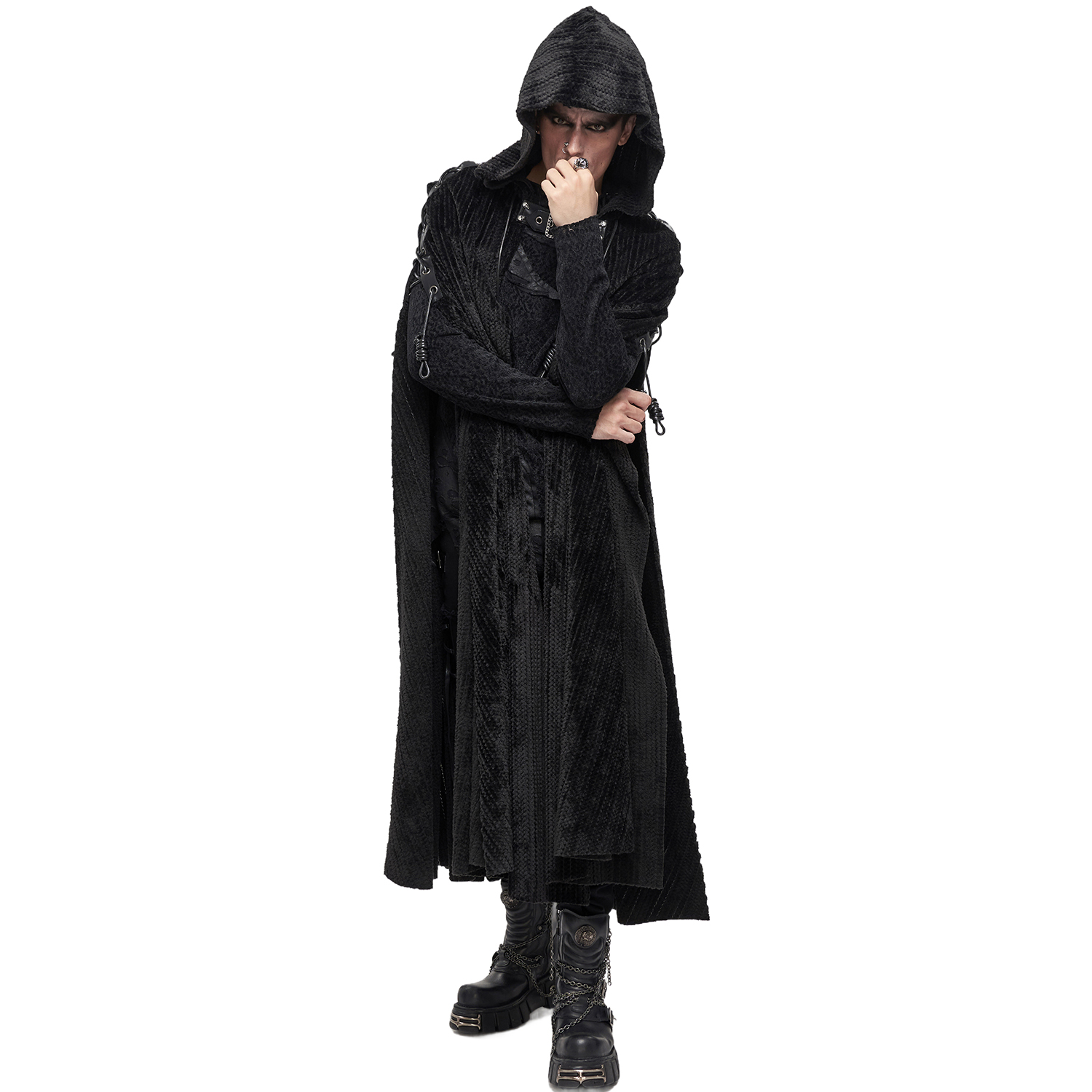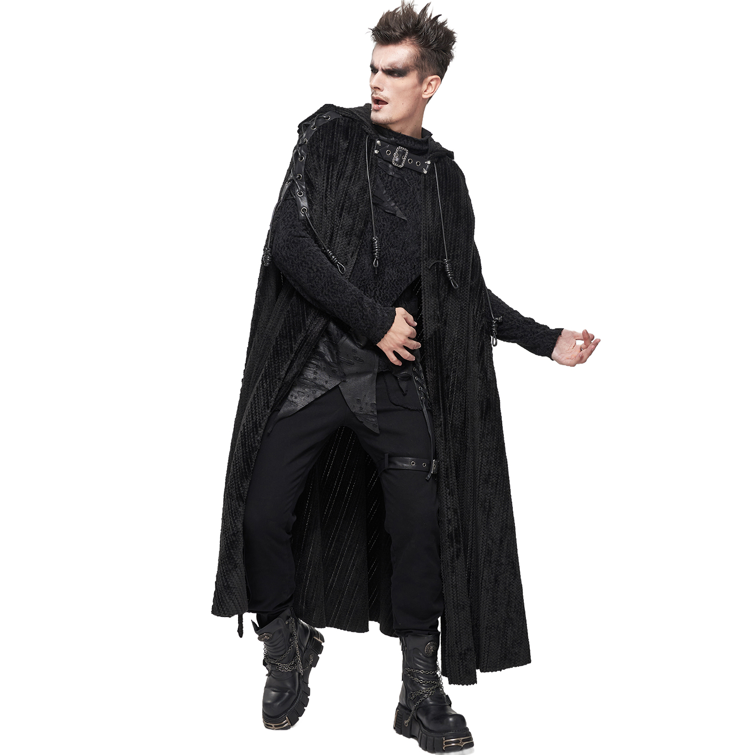 Superbe vêtement vampirique pour hommes de style gothique victorien composé d'un long manteau ajusté en velours noir avec un imprimé cachemire en relief, et d'une cape extérieure pleine longueur en...