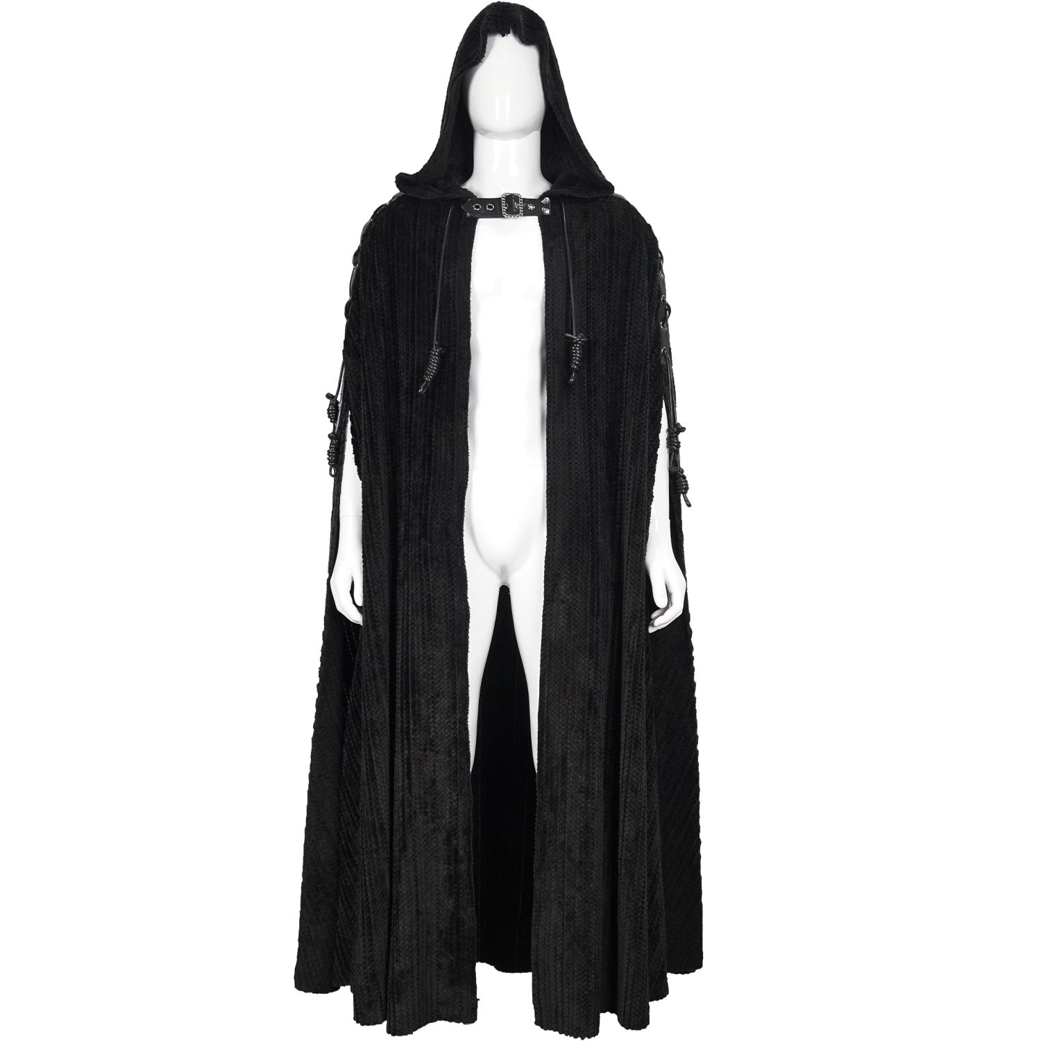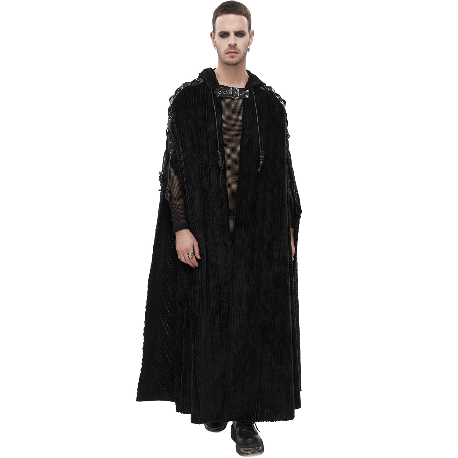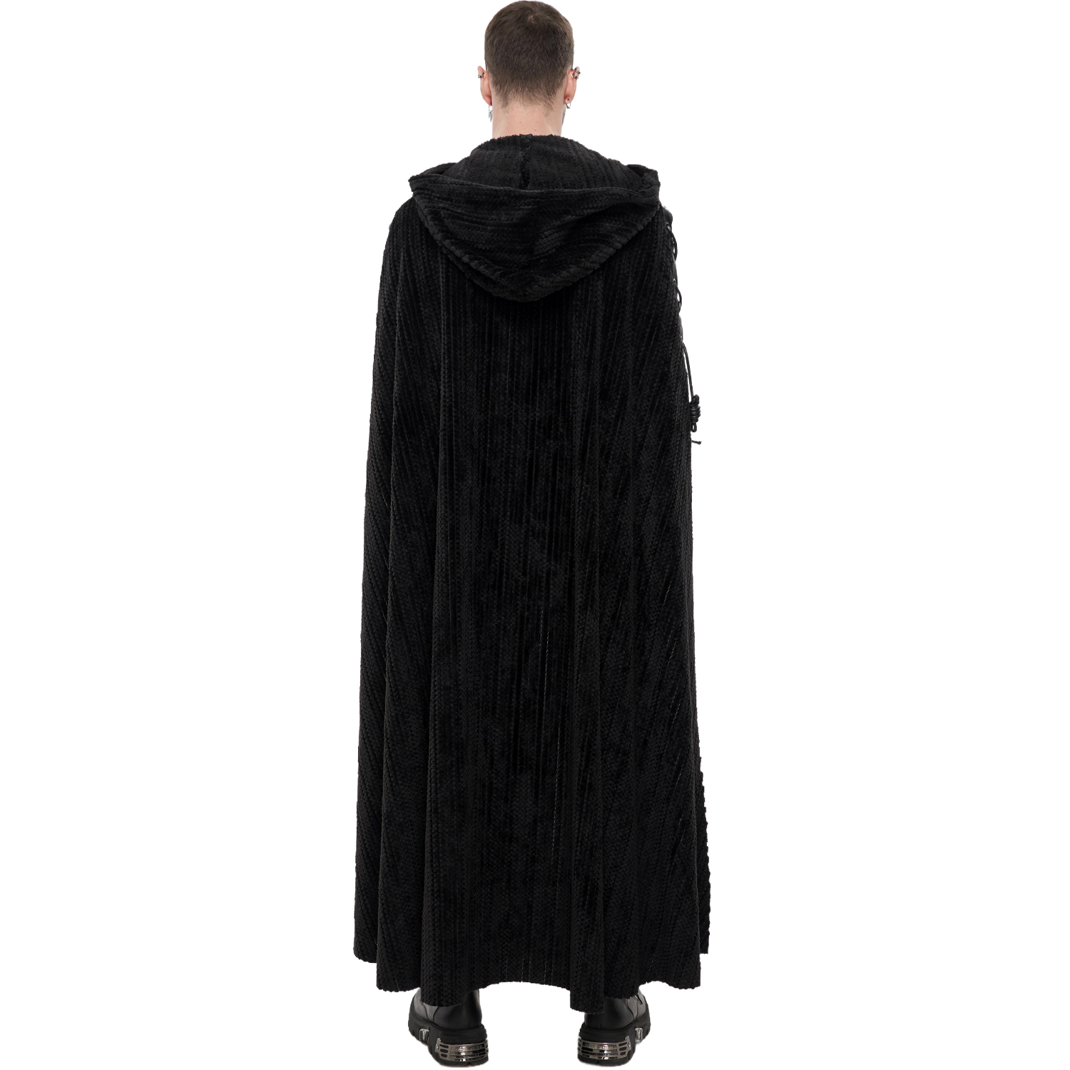• Longue cape gothique en imitation lin • Grand col montant à armature métallique • Ourlet effiloché • Épaulettes en tissu imprimé doux, aspect nubuck vieilli • Se ferme par ruban à nouer sur le...