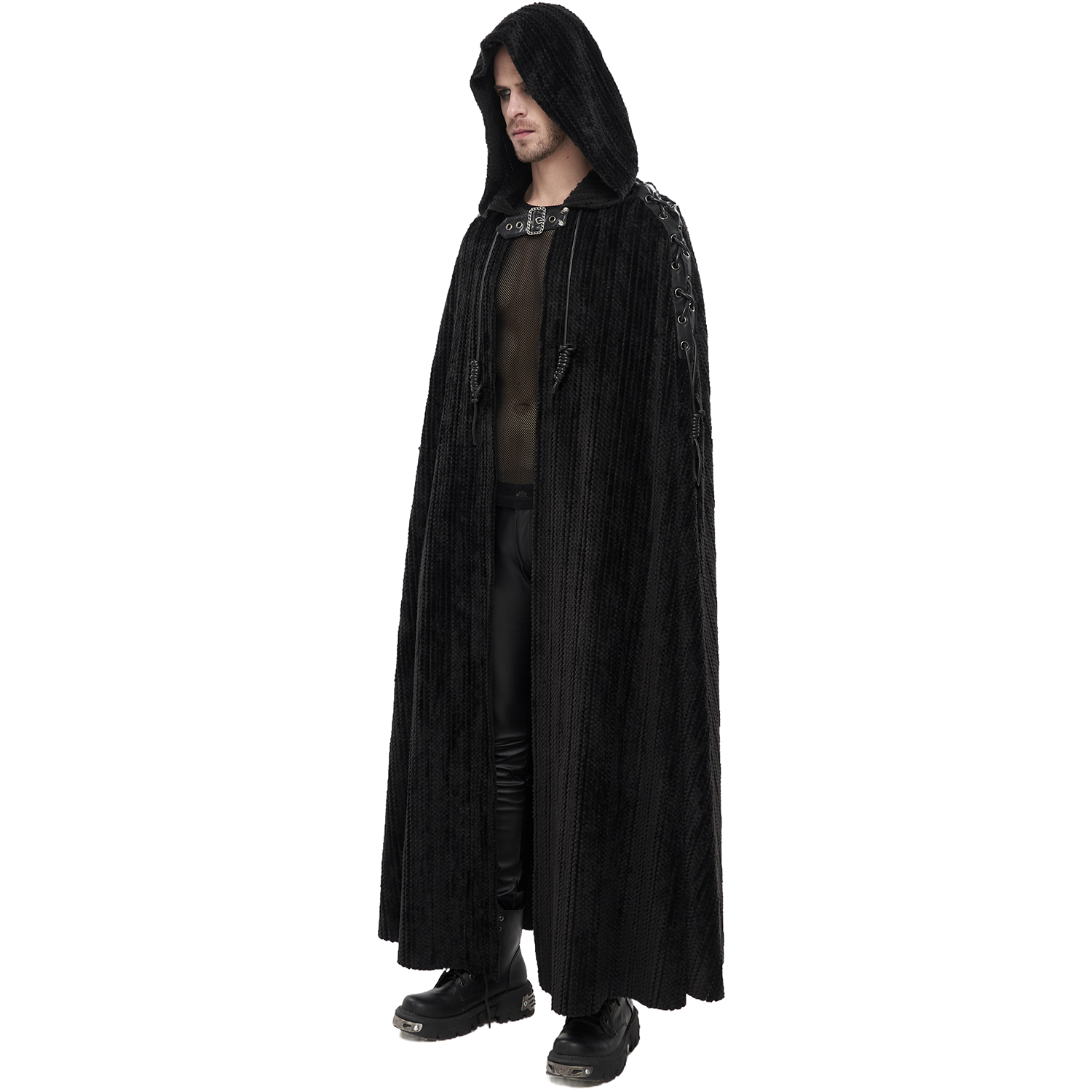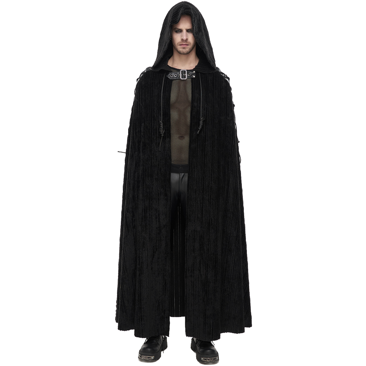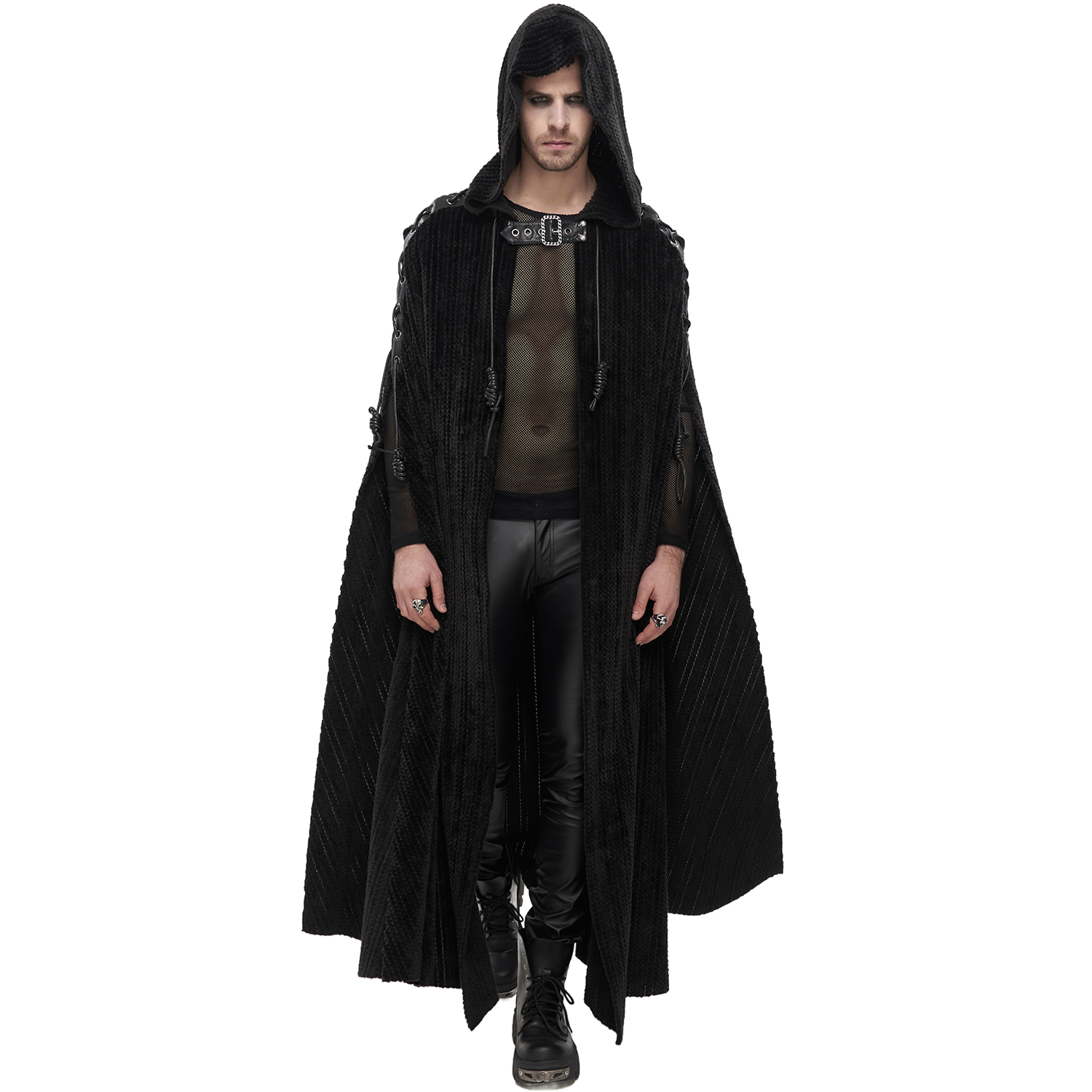 • Longue cape gothique en imitation lin • Grand col montant à armature métallique • Ourlet effiloché • Épaulettes en tissu imprimé doux, aspect nubuck vieilli • Se ferme par ruban à nouer sur le...