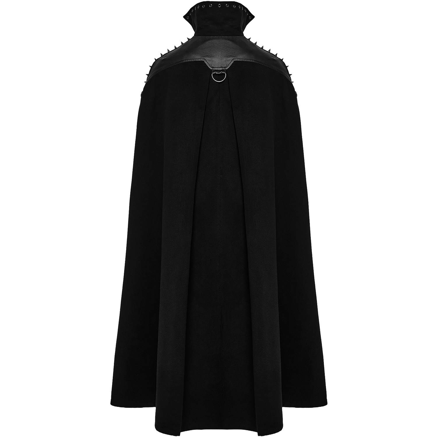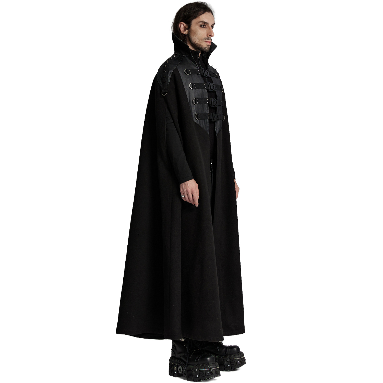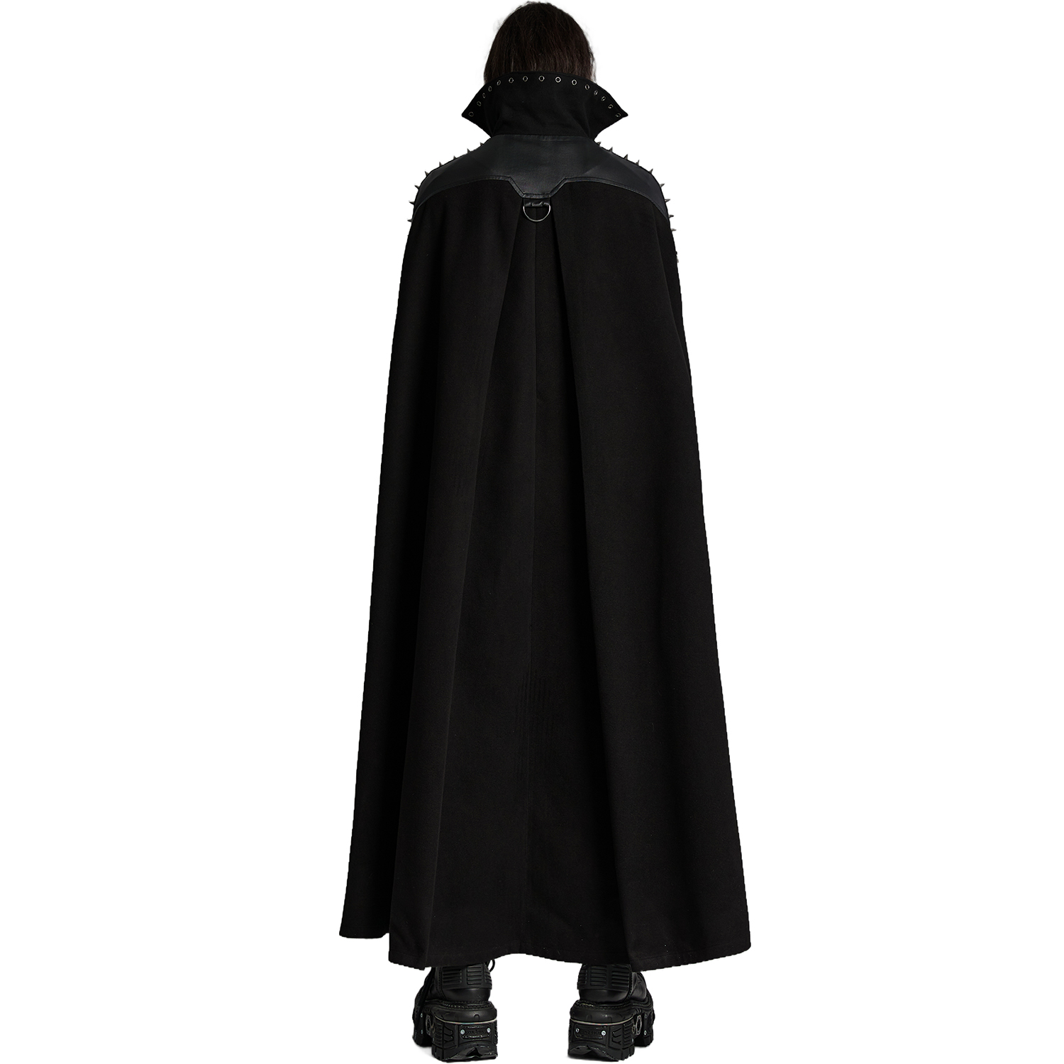 Superbe cape-manteau gothique en simili cuir et brocart. Cape: • En polyester jacquard satiné noir • Motif damassé de style Régence • Simili cuir noir effet vieilli • Col haut structuré...
