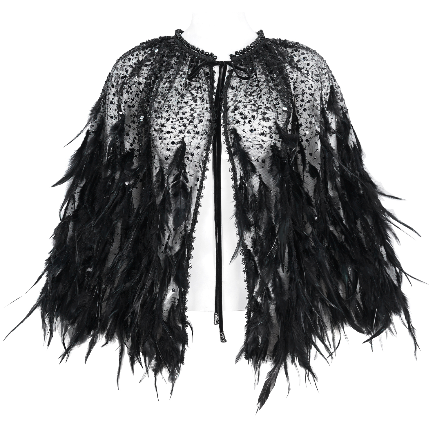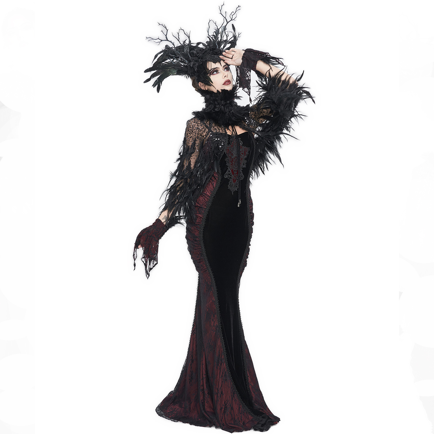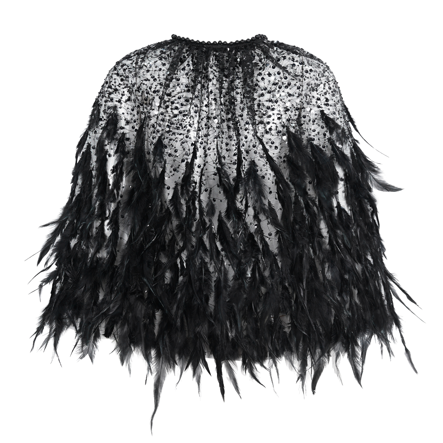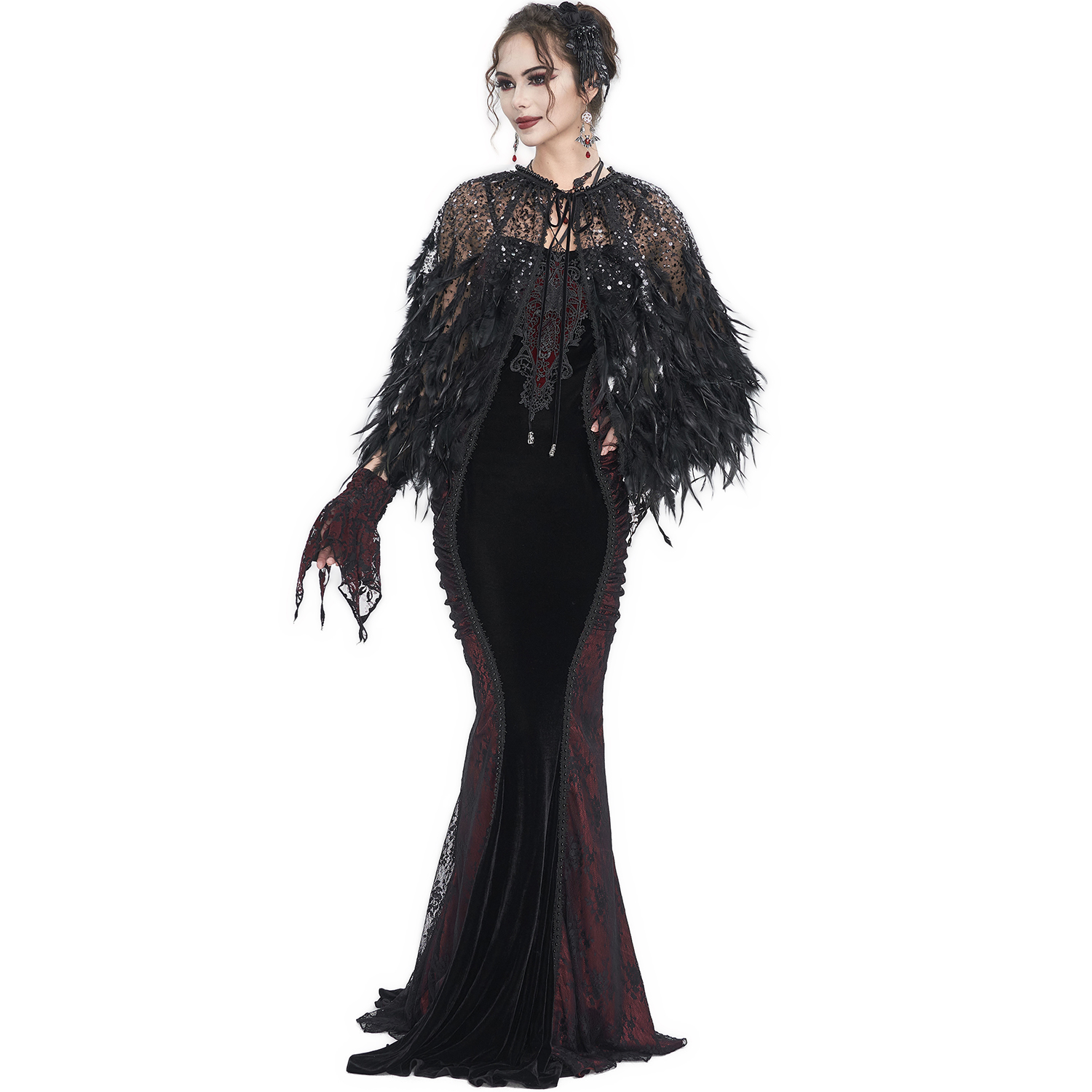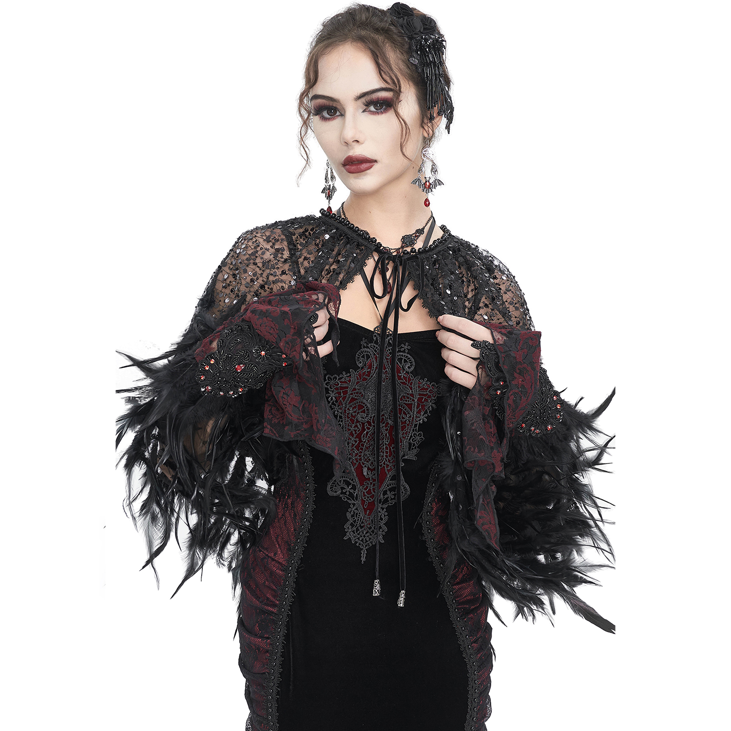 • Demi cape asymétrique en daim noir • Plumes noires sur l'épaule • Doublure en tissu bordeaux • Col haut en dentelle perlée noire • Boutons en métal gravé sur le côté gauche du col • Sangle...