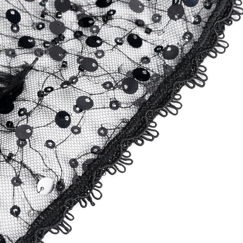 • En tulle noir avec un dégradé de paillettes et de plumes • Bordure en dentelle noire • Se noue avec un cordon en velours sur le devant • Capuche sur dimensionnée en tulle bordée de dentelle •...