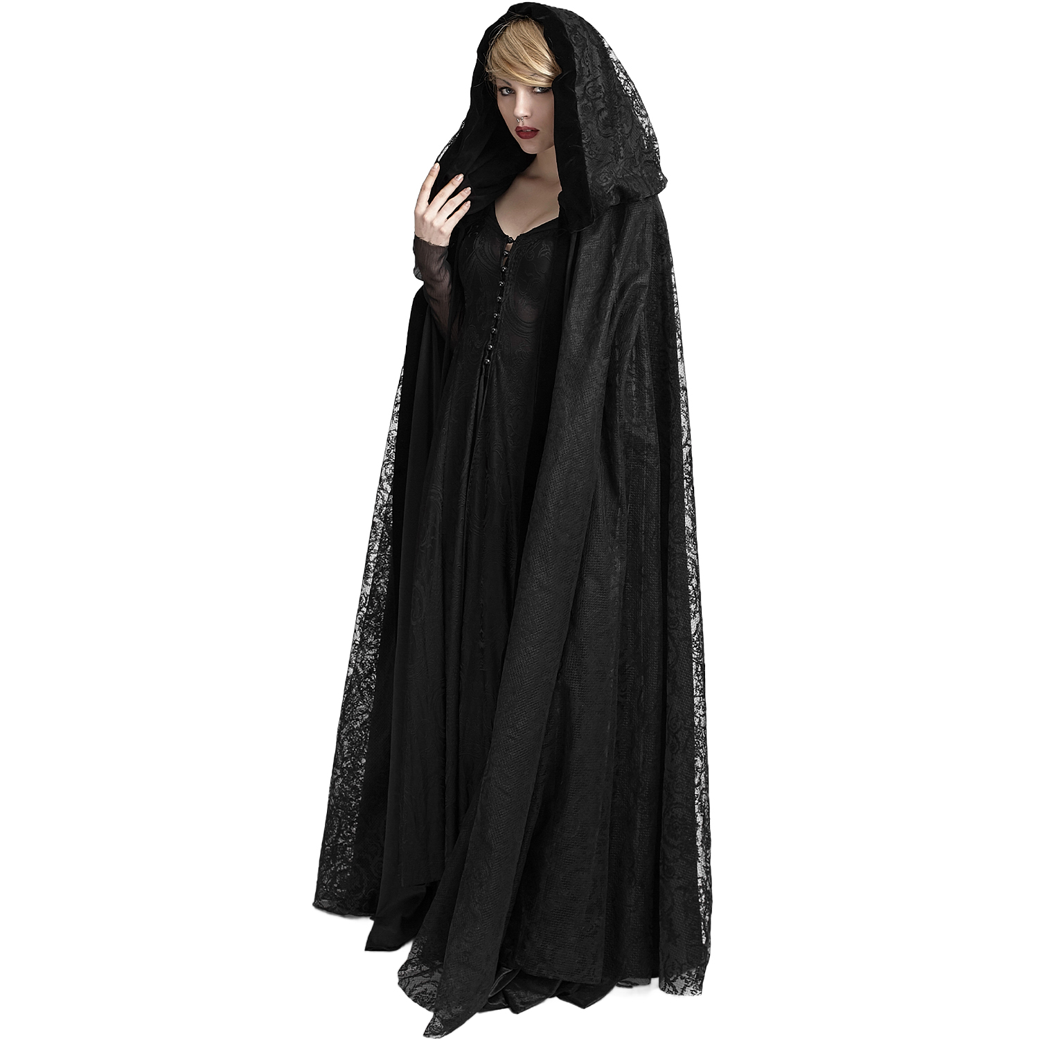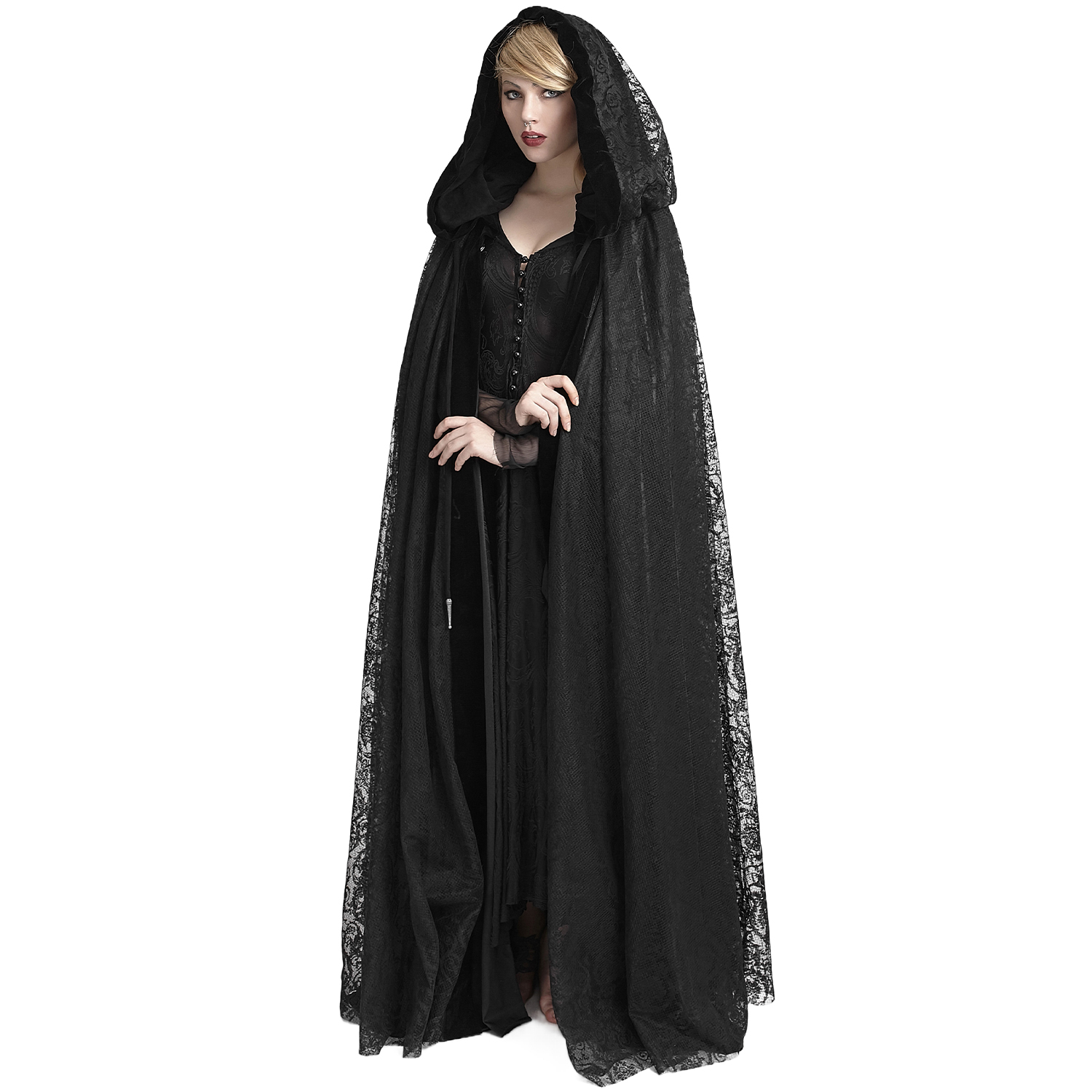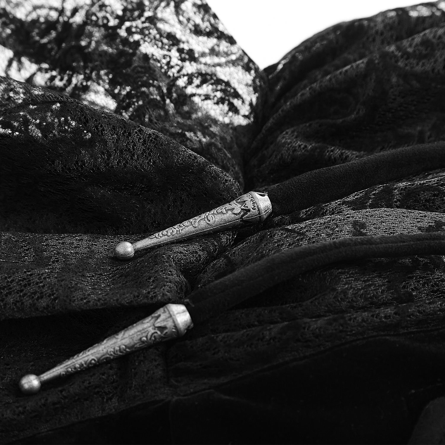 • Cape a capuche • Motif toile d'araignée subtil en velours noir • Ourlet chauve souris avec frange en dentelle • Volants en tulle ornés de rubans de velours, de roses et de perles noires • Se...