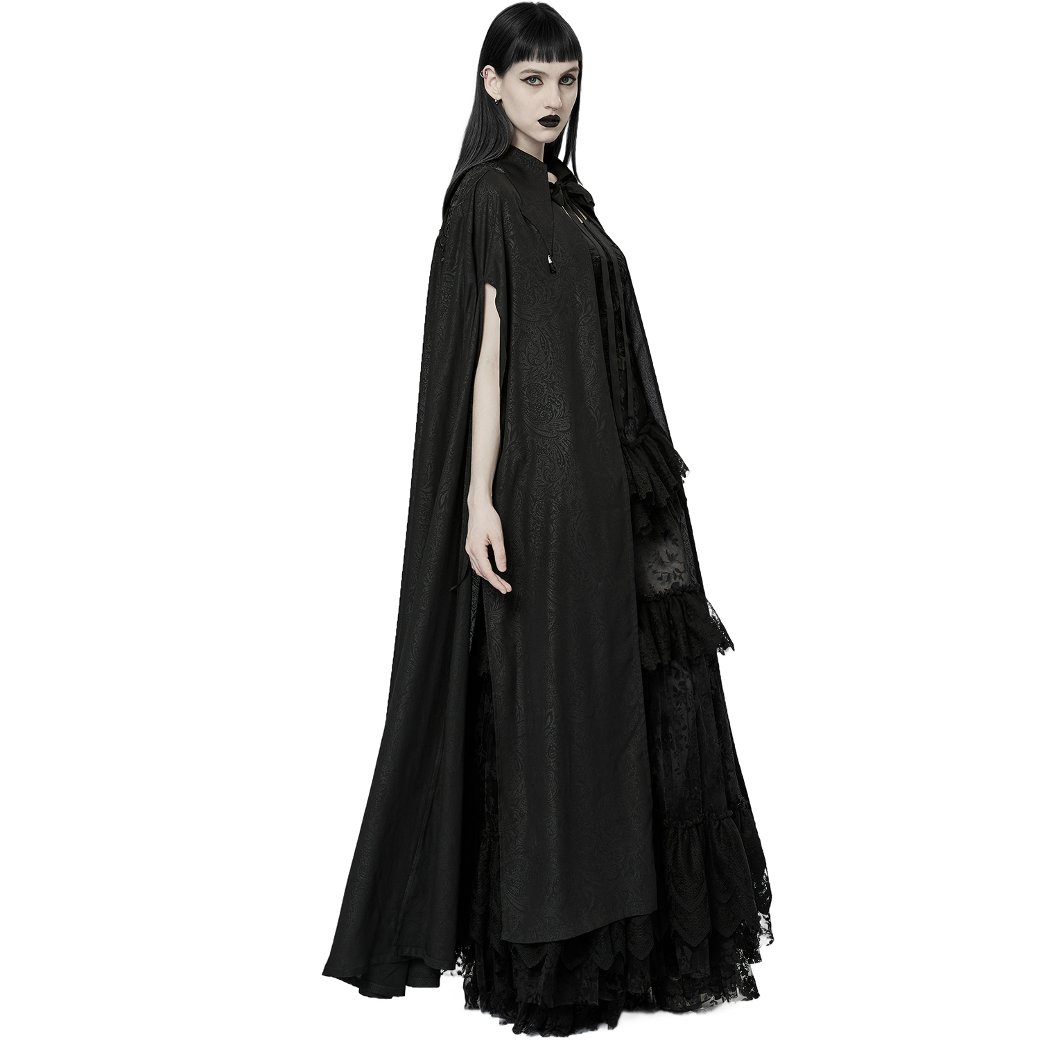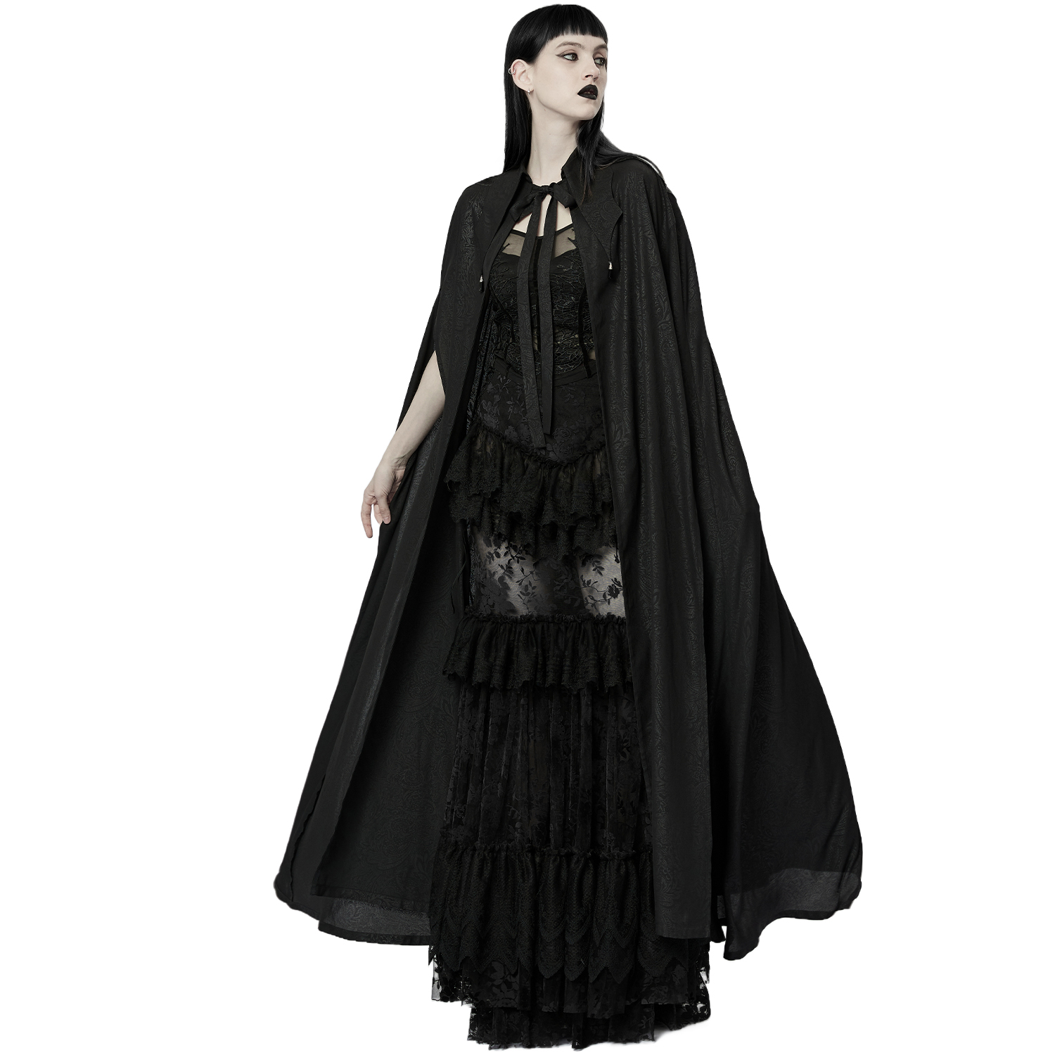 • Cape a capuche • Motif toile d'araignée subtil en velours noir • Ourlet chauve souris avec frange en dentelle • Volants en tulle ornés de rubans de velours, de roses et de perles noires • Se...