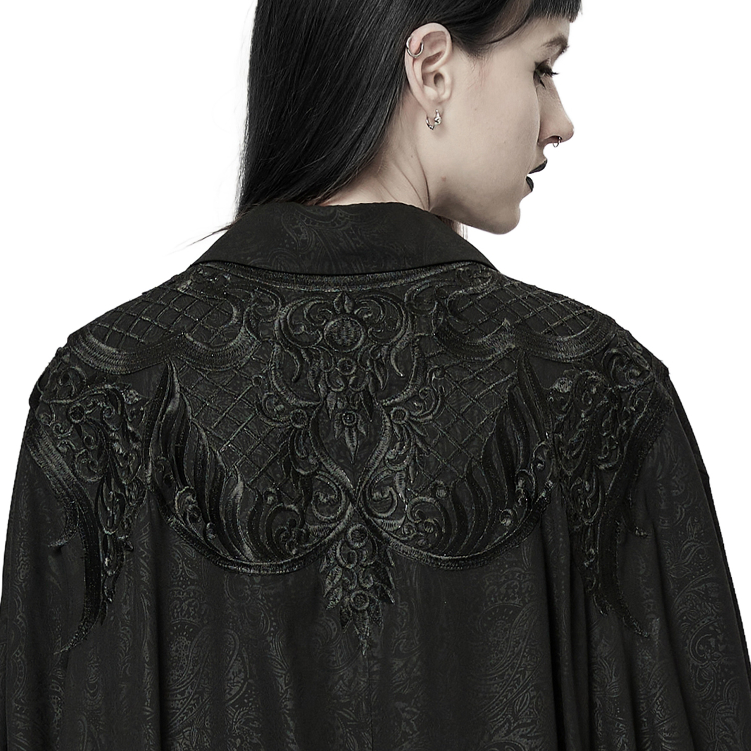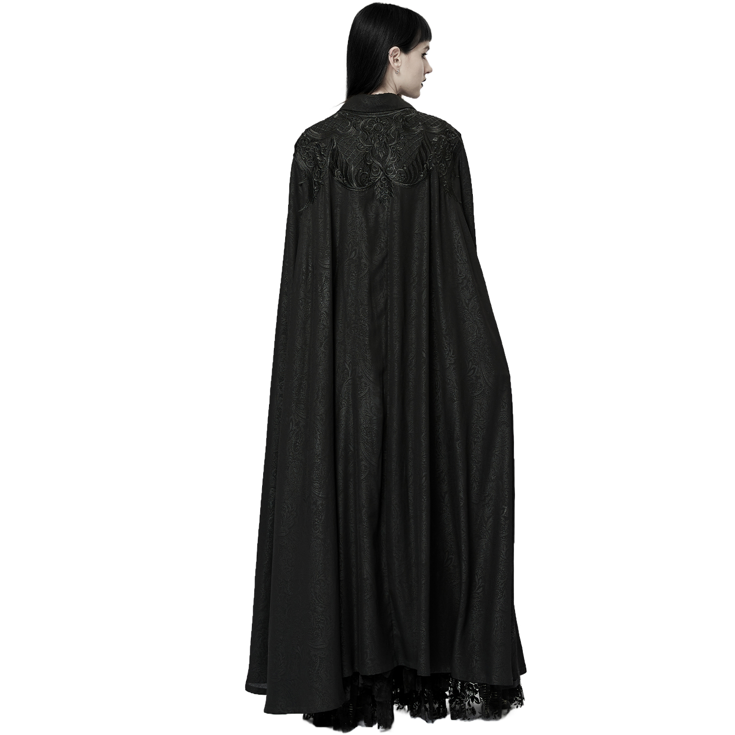 Magnifique cape gothique lolita damassée • En velours noir avec un imprimé à motif damassé victorien gris • Entièrement doublée de bordures en fausse fourrure • Sans manches et d'inspiration...
