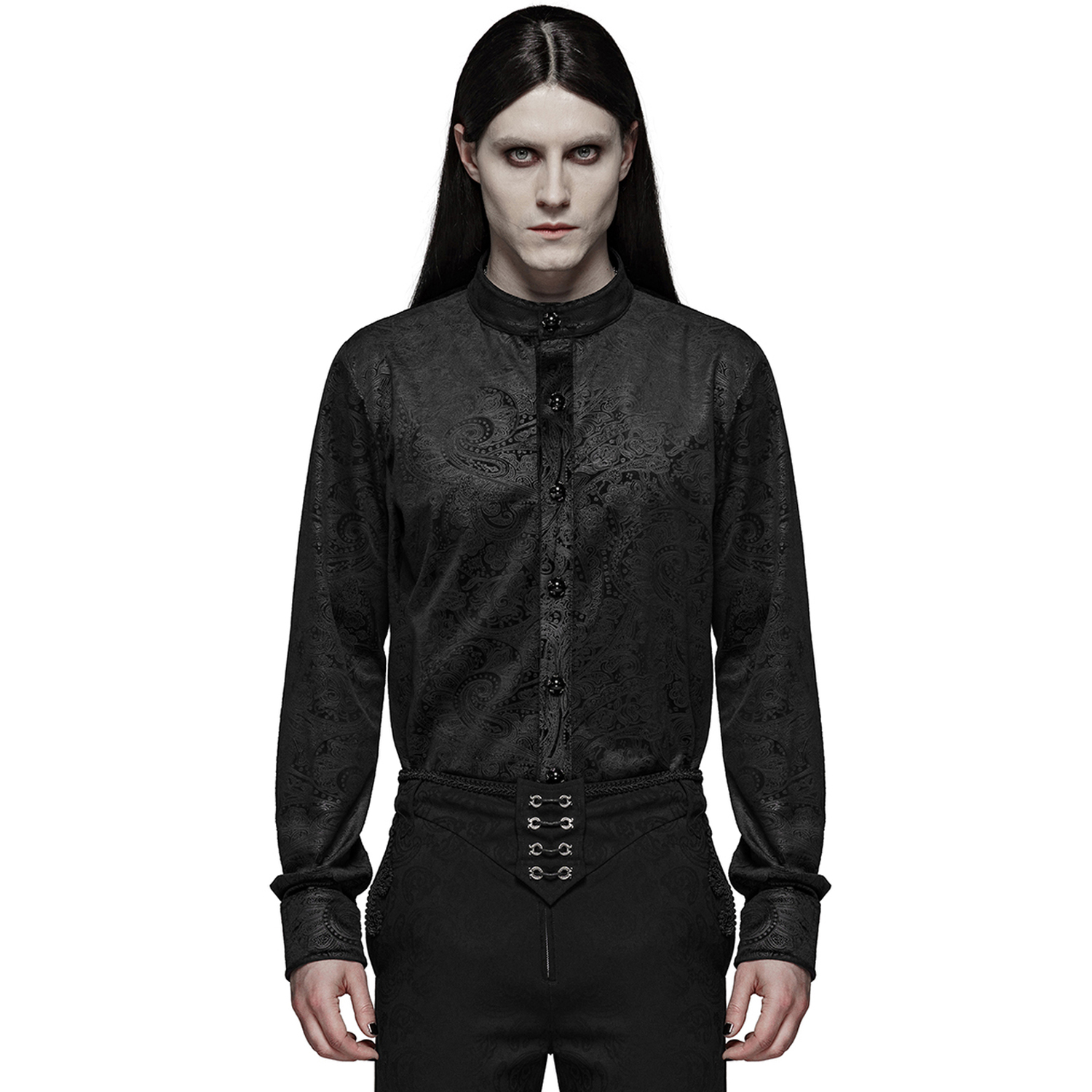Superbe chemise pour hommes de style gothique. • Fabriquée dans un mélange de polycoton noir avec un motif damassé victorien en brocart tissé dans un design néo-gothique exclusif. • Ourlet...