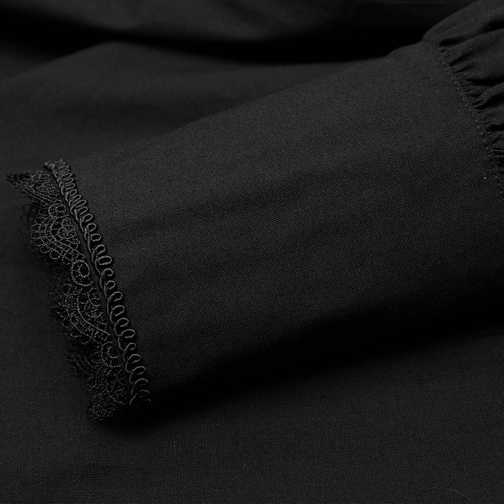 • En mousseline noire plissée à col montant et dentelle • Col montant • Boutonnée sur le devant • Volants sur la poitrine • Manches longues bouffantes • Poignets élastiqués pour un confort...