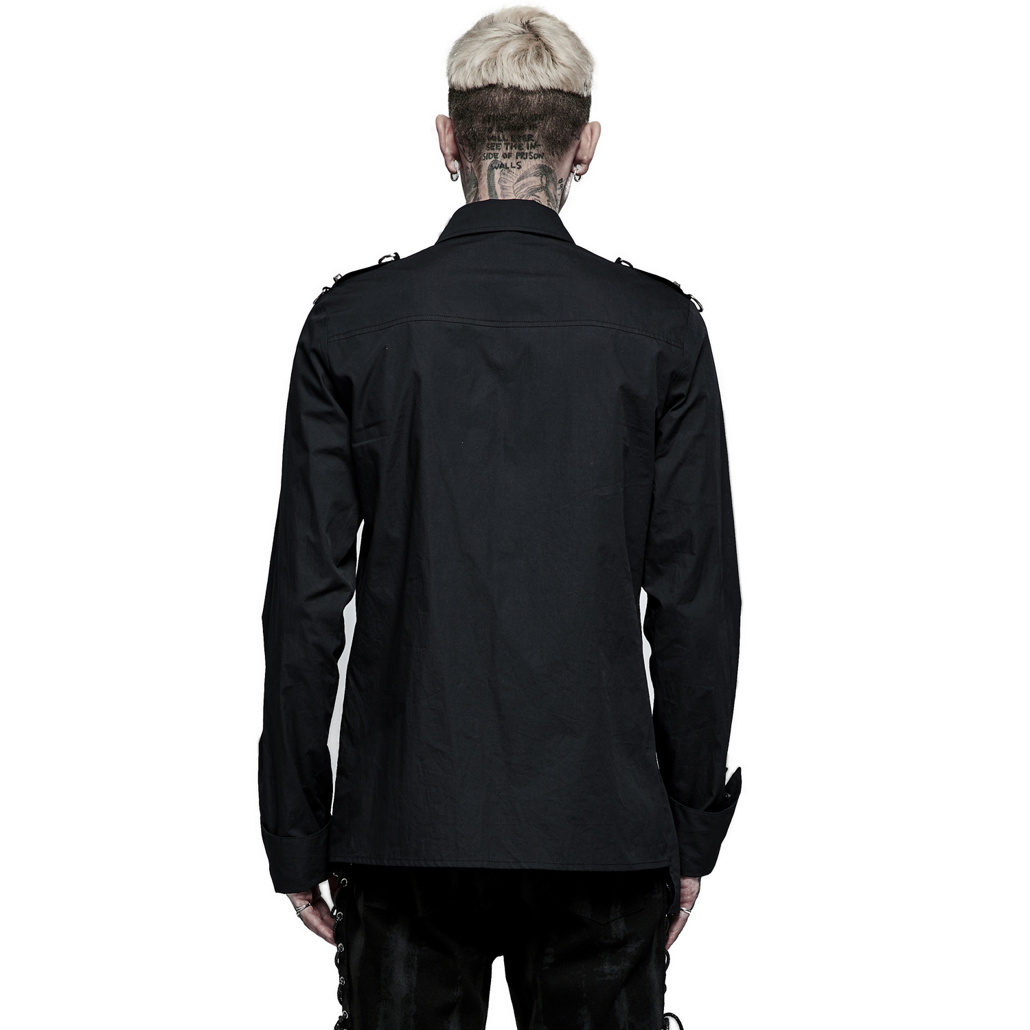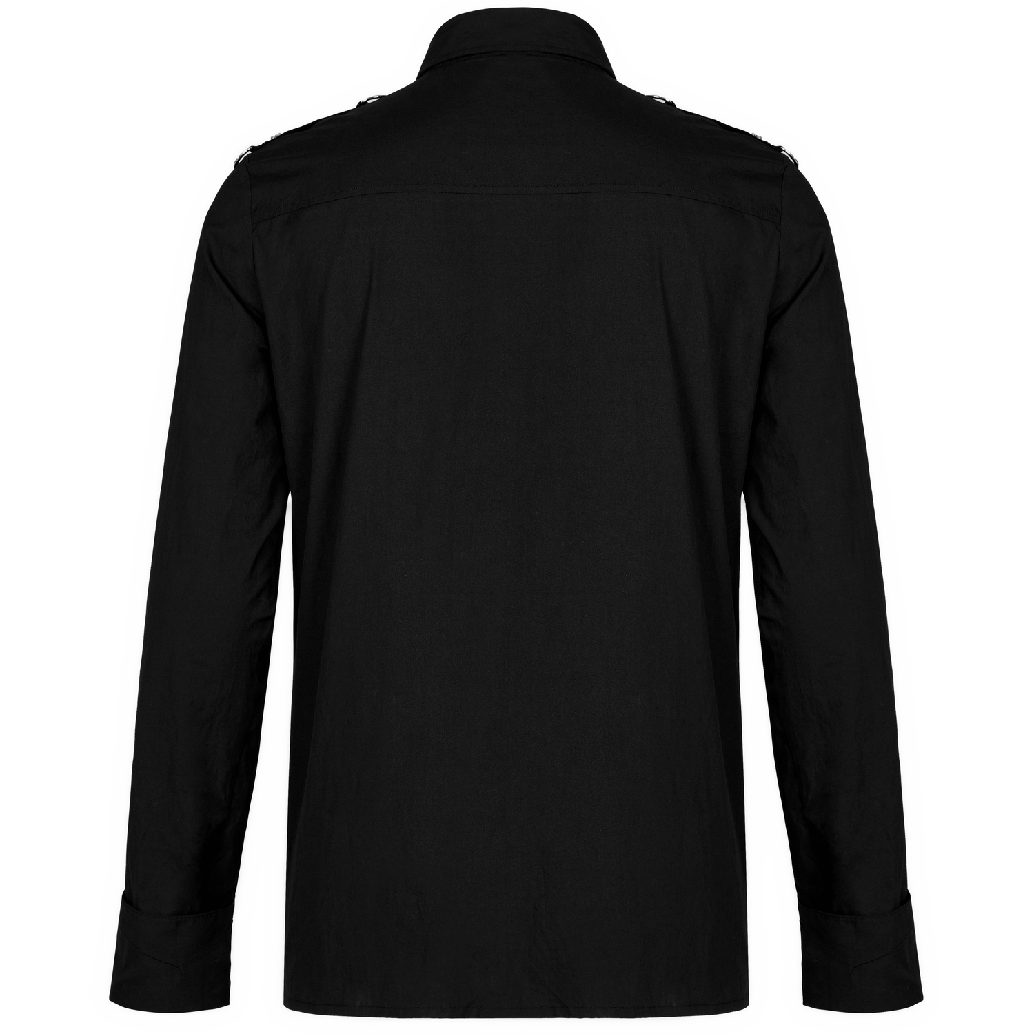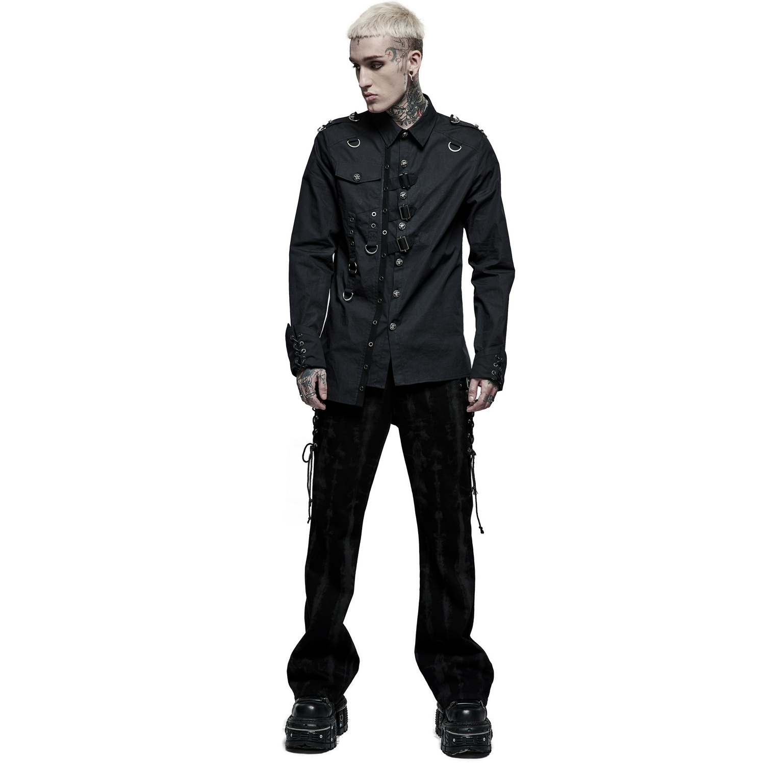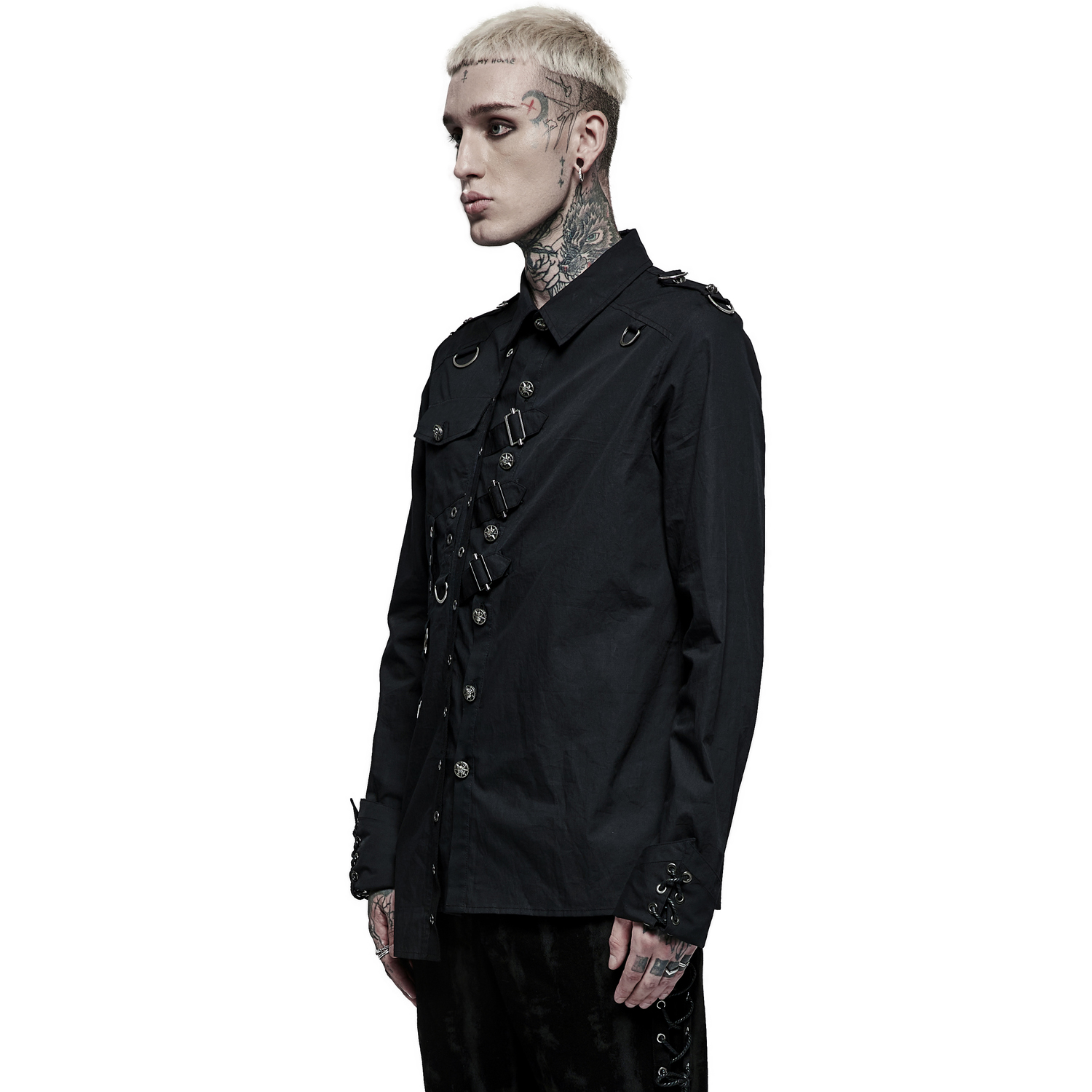 Chemise homme noire à manches longues avec sangles • En coton doux et confortable • Col décoré d'œillets • Boutons gravés • Une poche à l'avant agrémentée d'un spike décoratif • Sangles sur les...