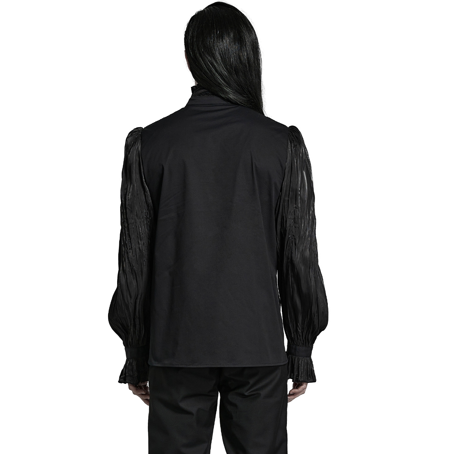 • En mousseline noire plissée à col montant et dentelle • Col montant • Boutonnée sur le devant • Volants sur la poitrine • Manches longues bouffantes • Poignets élastiqués pour un confort...