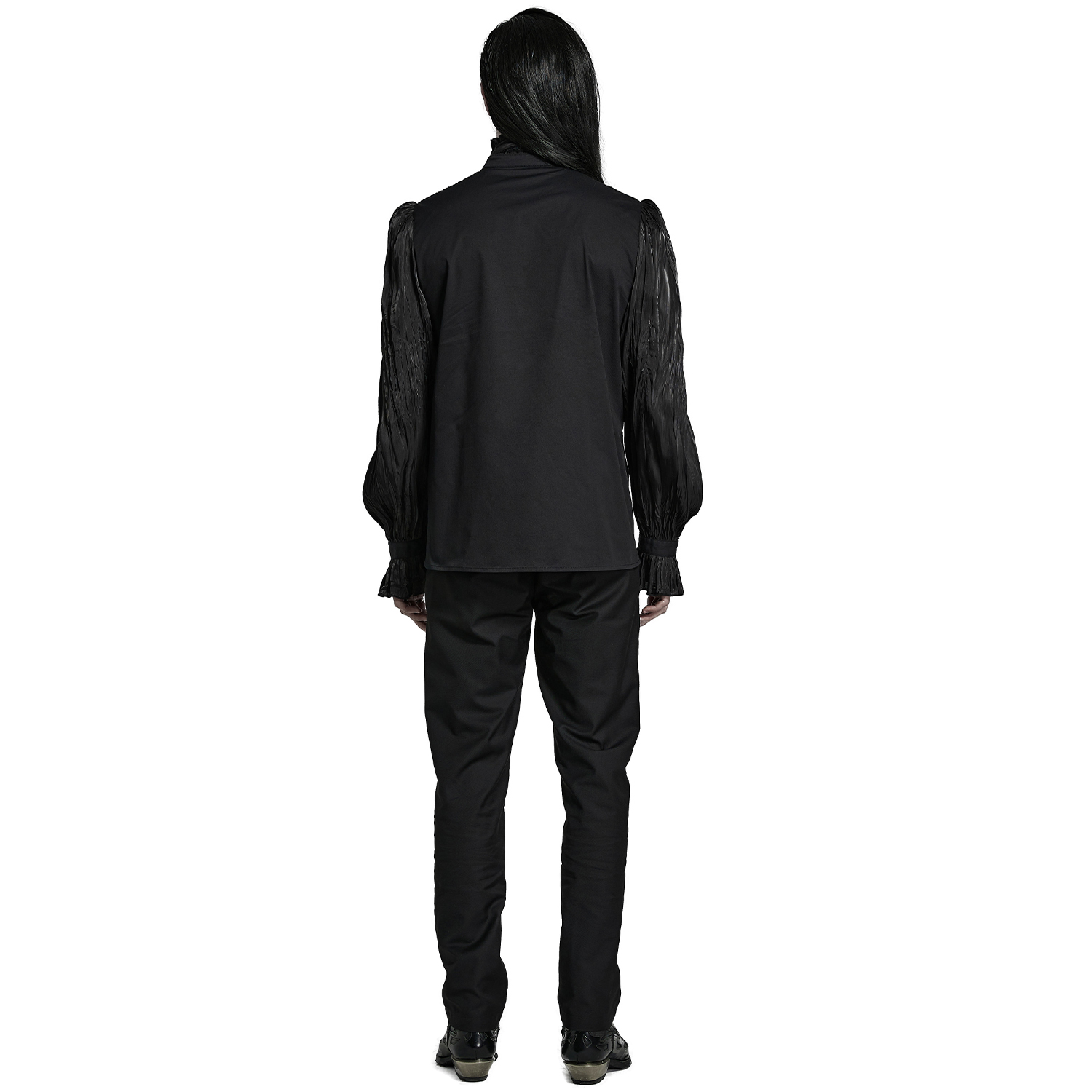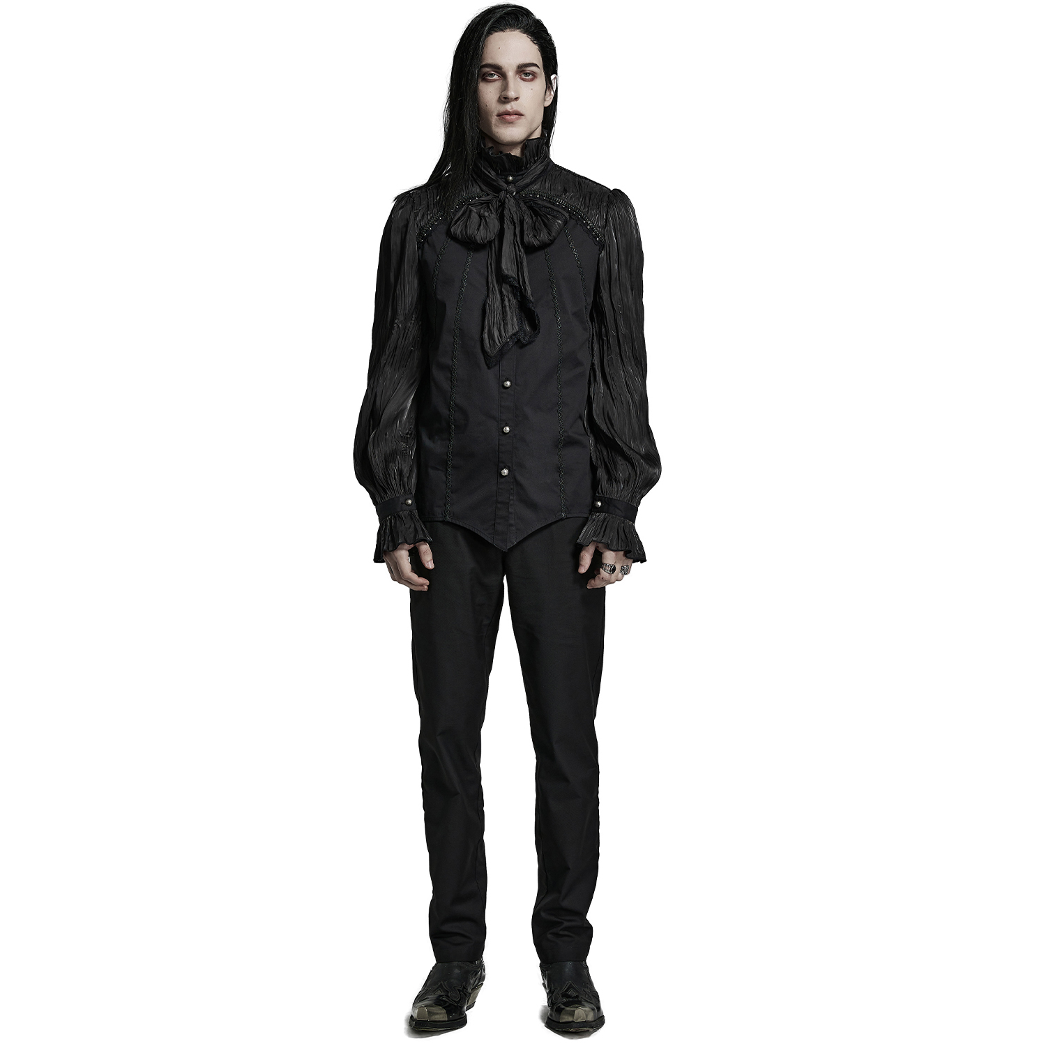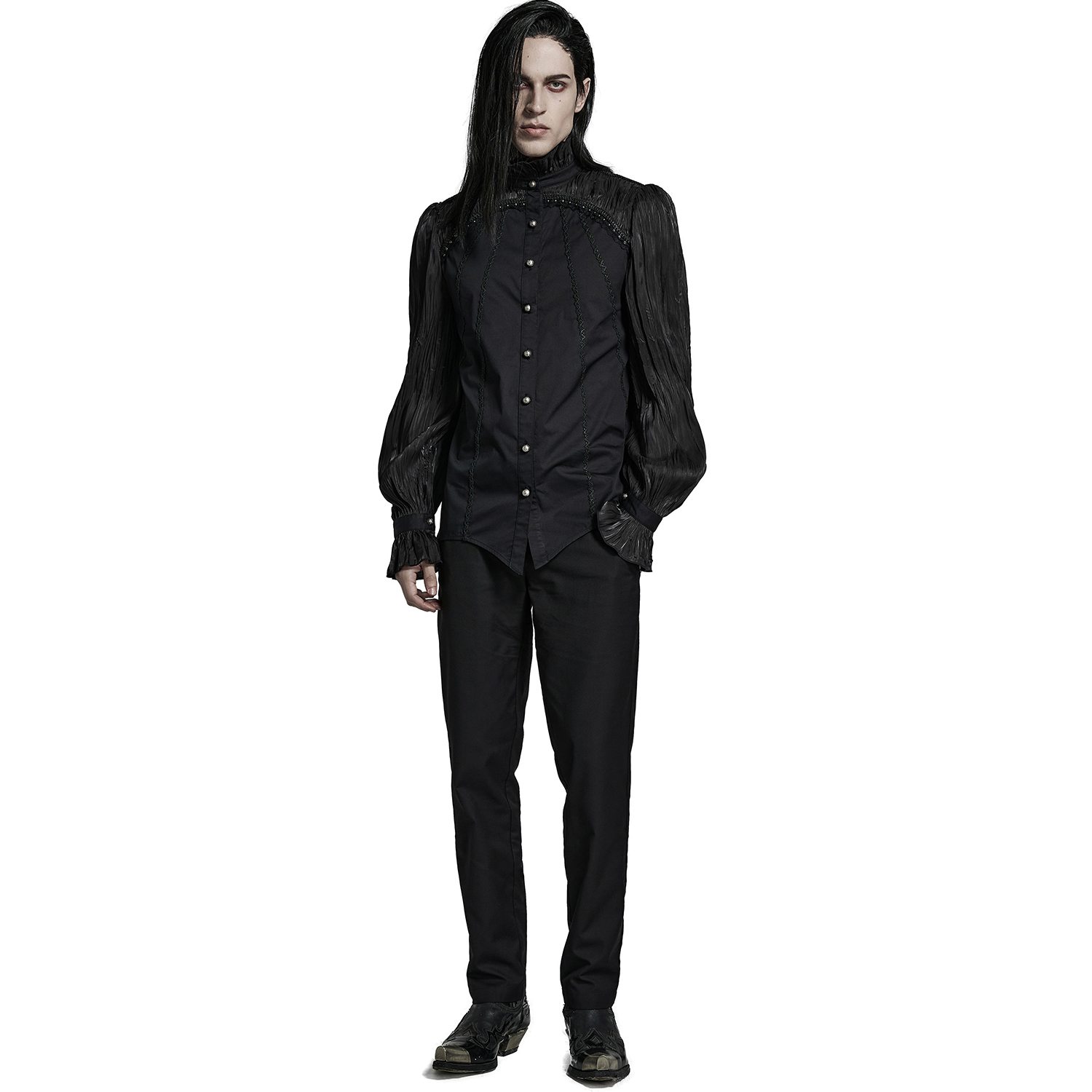 • Chemise gothique à manches longues pour hommes • En polyester noir doux, léger et semi-transparent • Dentelle noire à volants • Fermeture sur le devant par boutons personnalisés • Col mandarin...