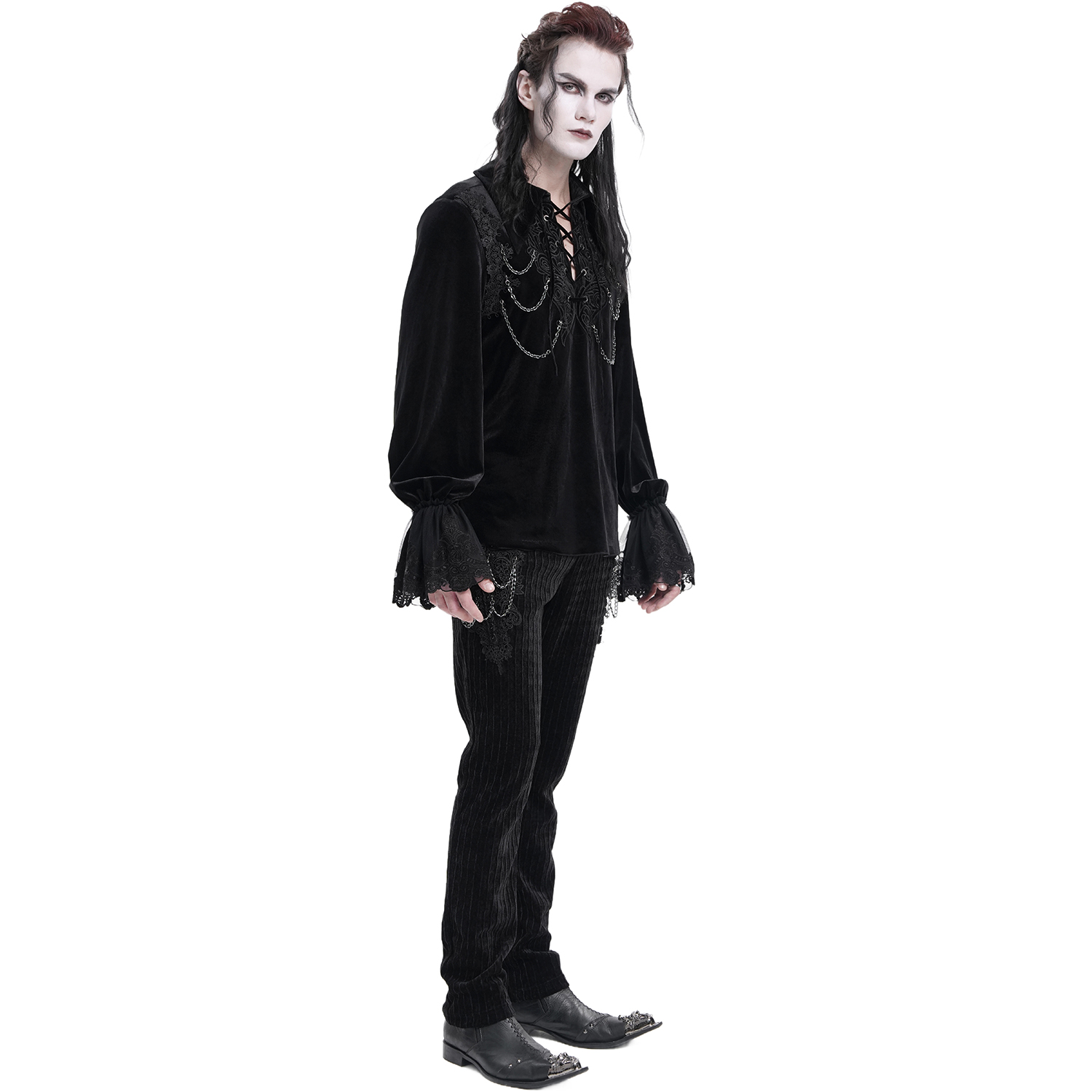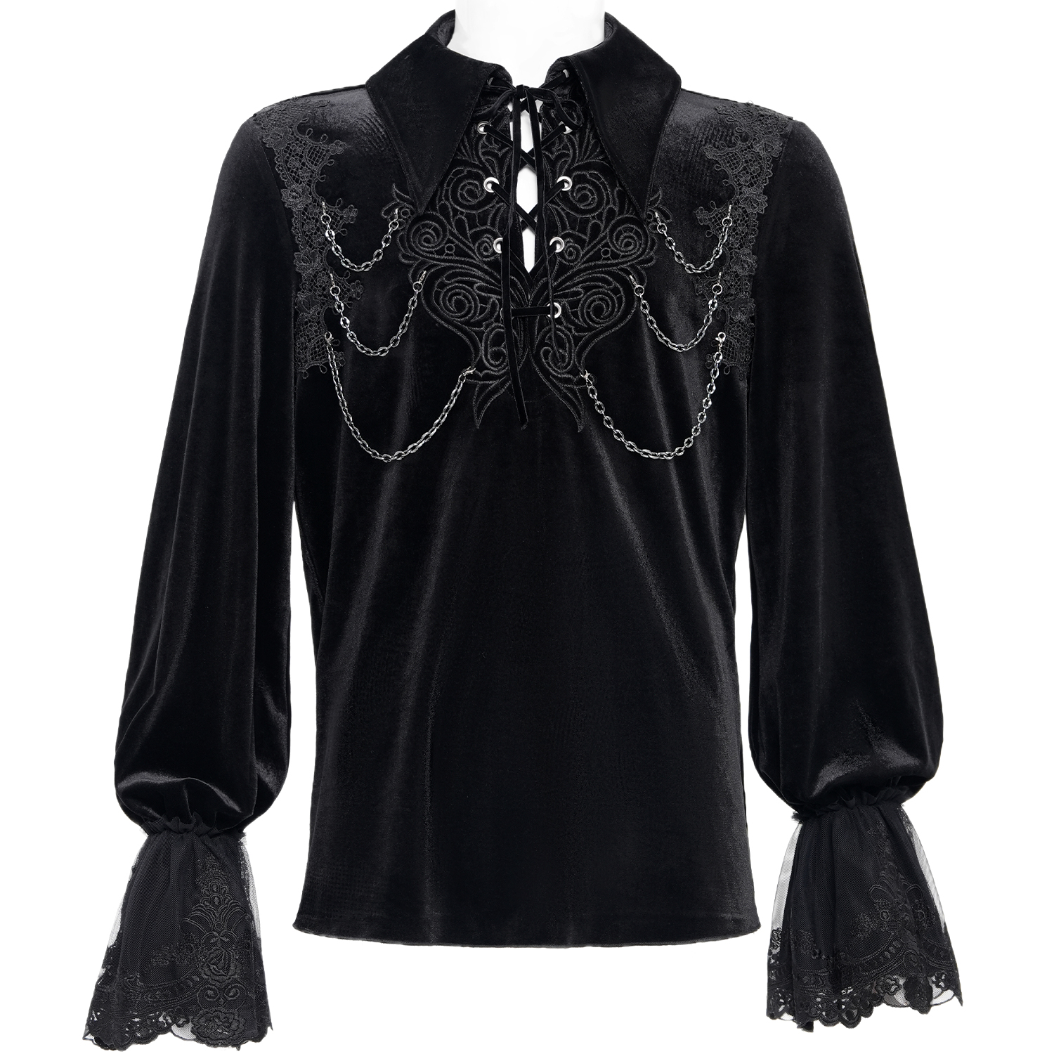 Chemise gothique à manches longues pour hommes • En polyester blanc doux, léger et semi-transparent • Dentelle noire à volants • Fermeture sur le devant par boutons personnalisés • Col mandarin...