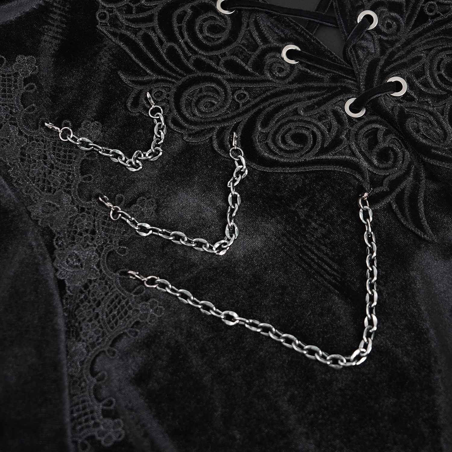 • En velours bordeaux à manches longues • Laçage au niveau de l'encolure avec broderies • Broderies sur le bord des manches • Chaînettes amovibles • Manches amples • Poignets en dentelle • Deux...