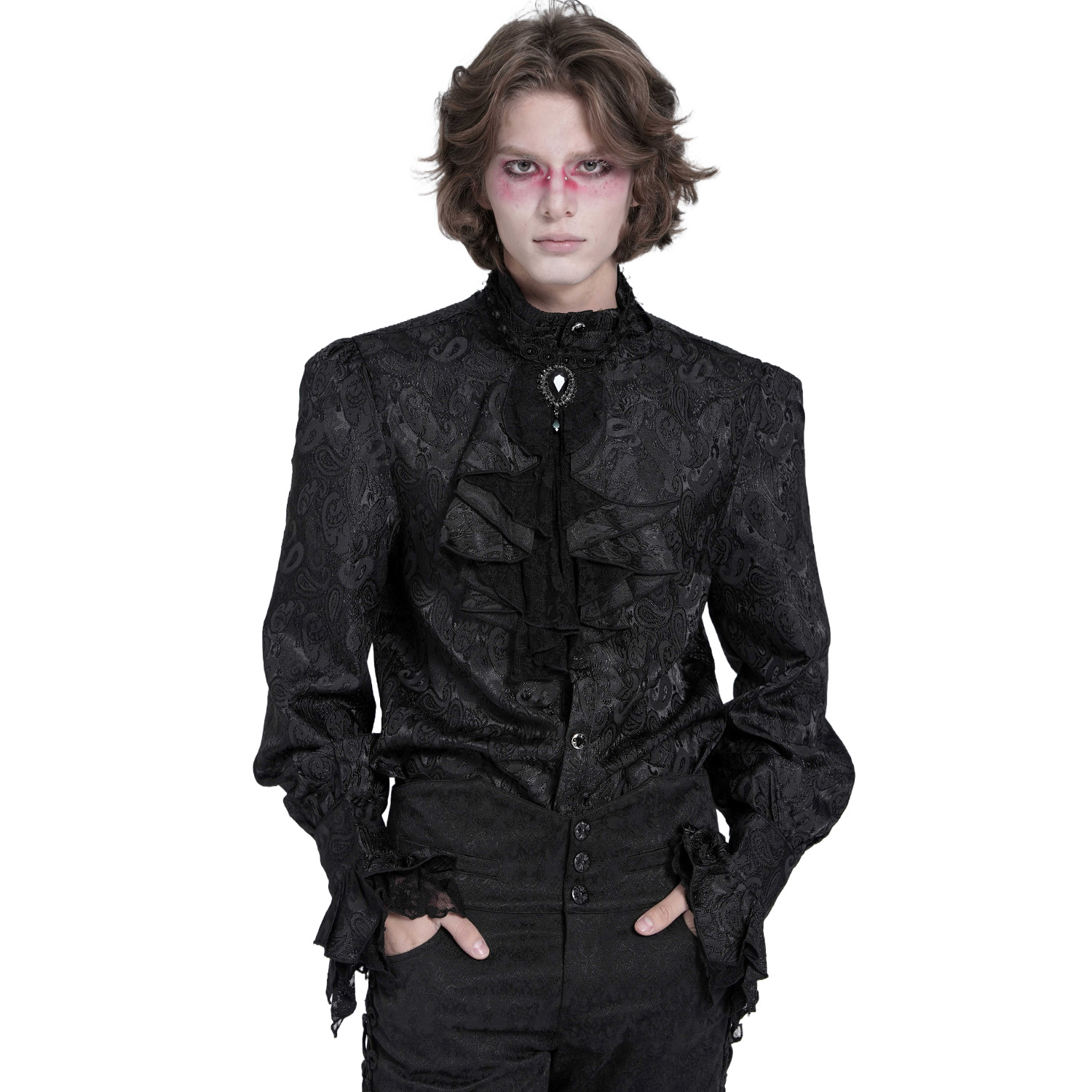 Chemise blanche à manches longues pour hommes de style gothique victorien et aristocrate avec jabot amovible. • Cette chemise est en tissu léger. • Imprimé damassé jacquard élaboré sur les manches...