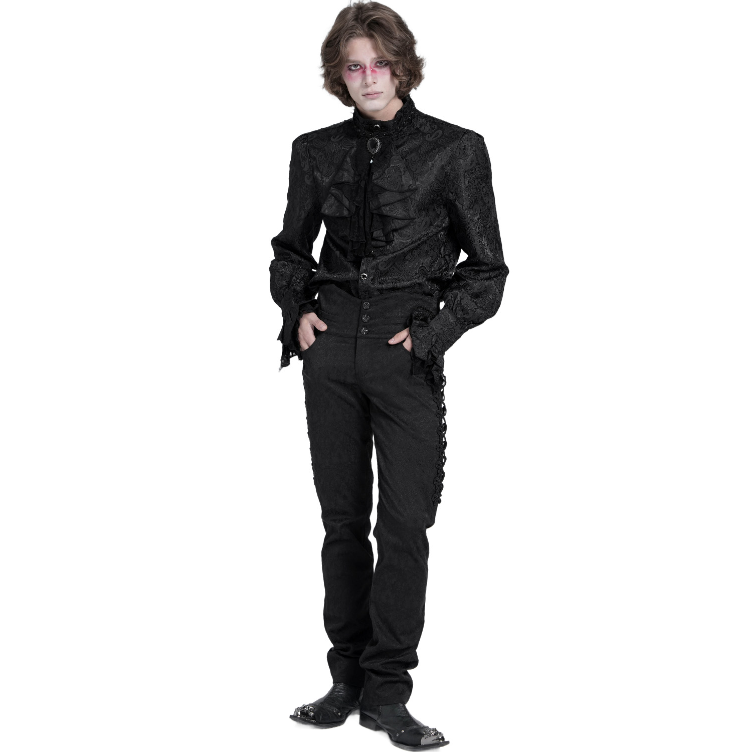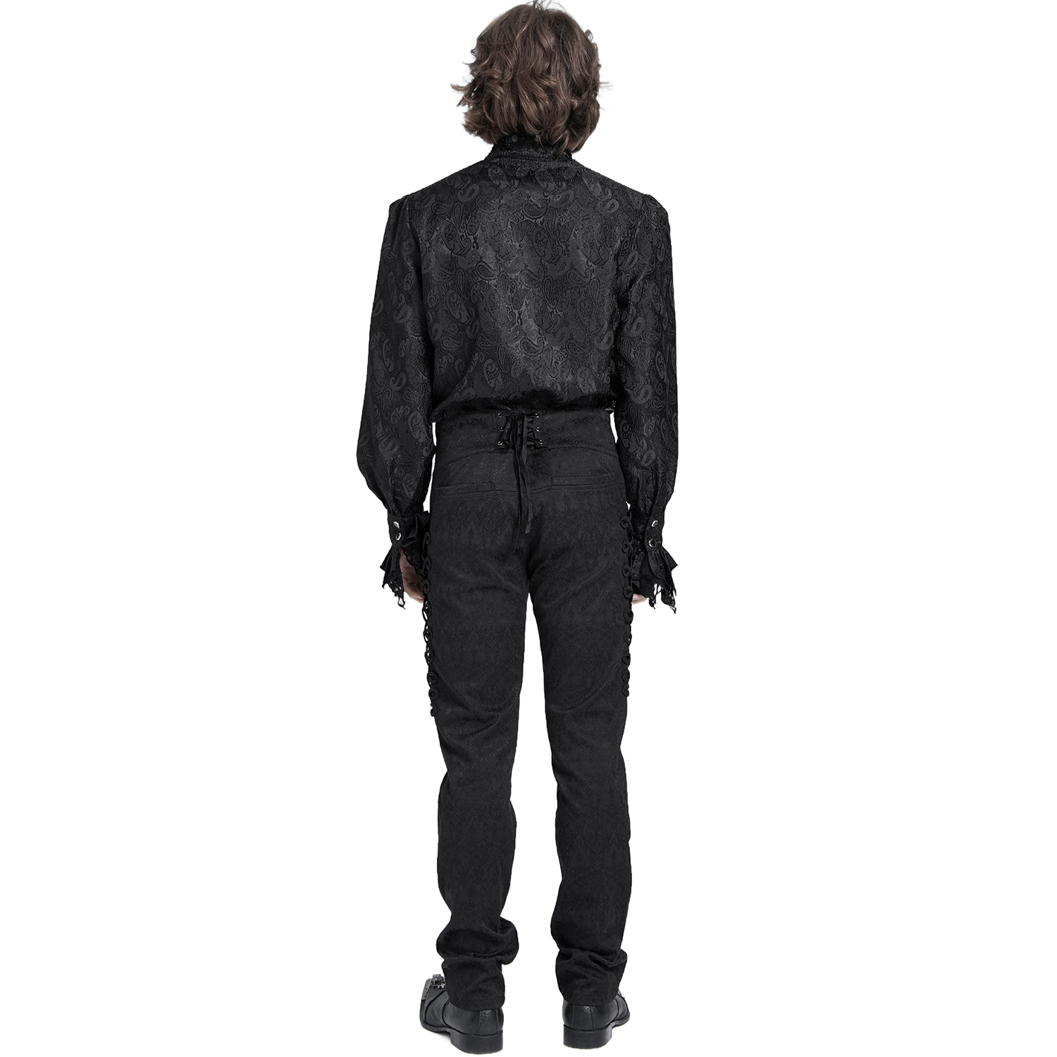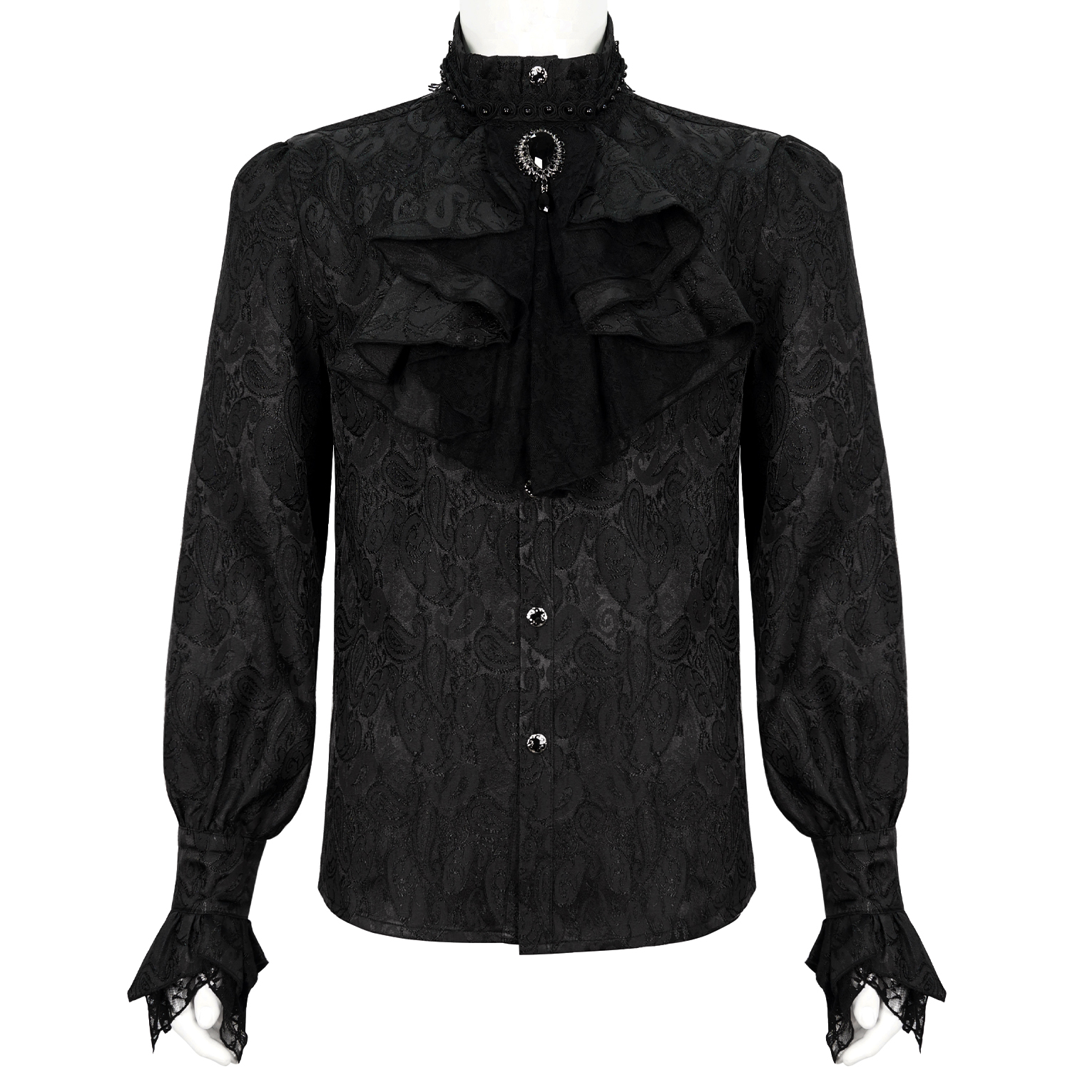 Chemise pour homme noire de style gothique victorien • En coton noir, doux et extensible • Jabot amovible • Boutonnage central sur le devant • Dentelle fine et détails tressés • Col pointu •...