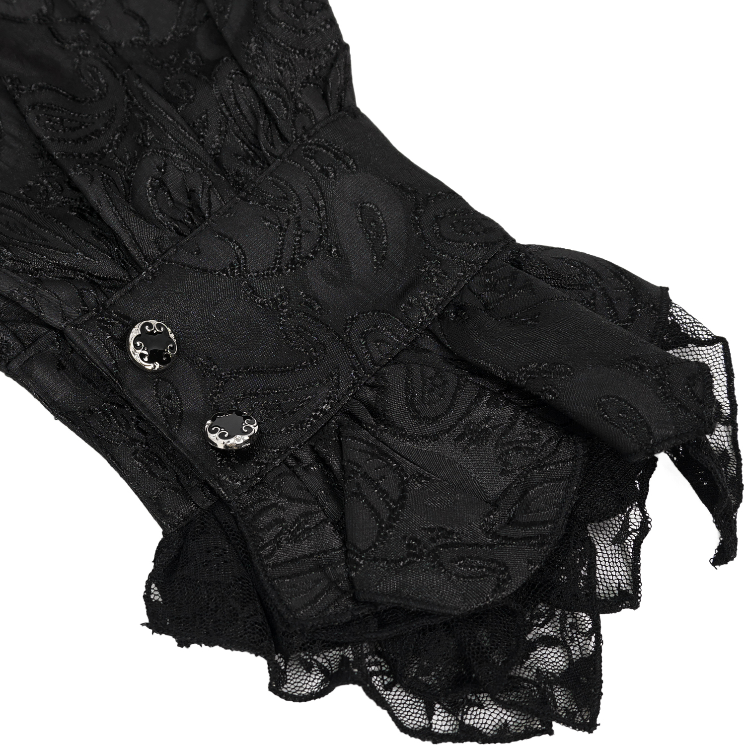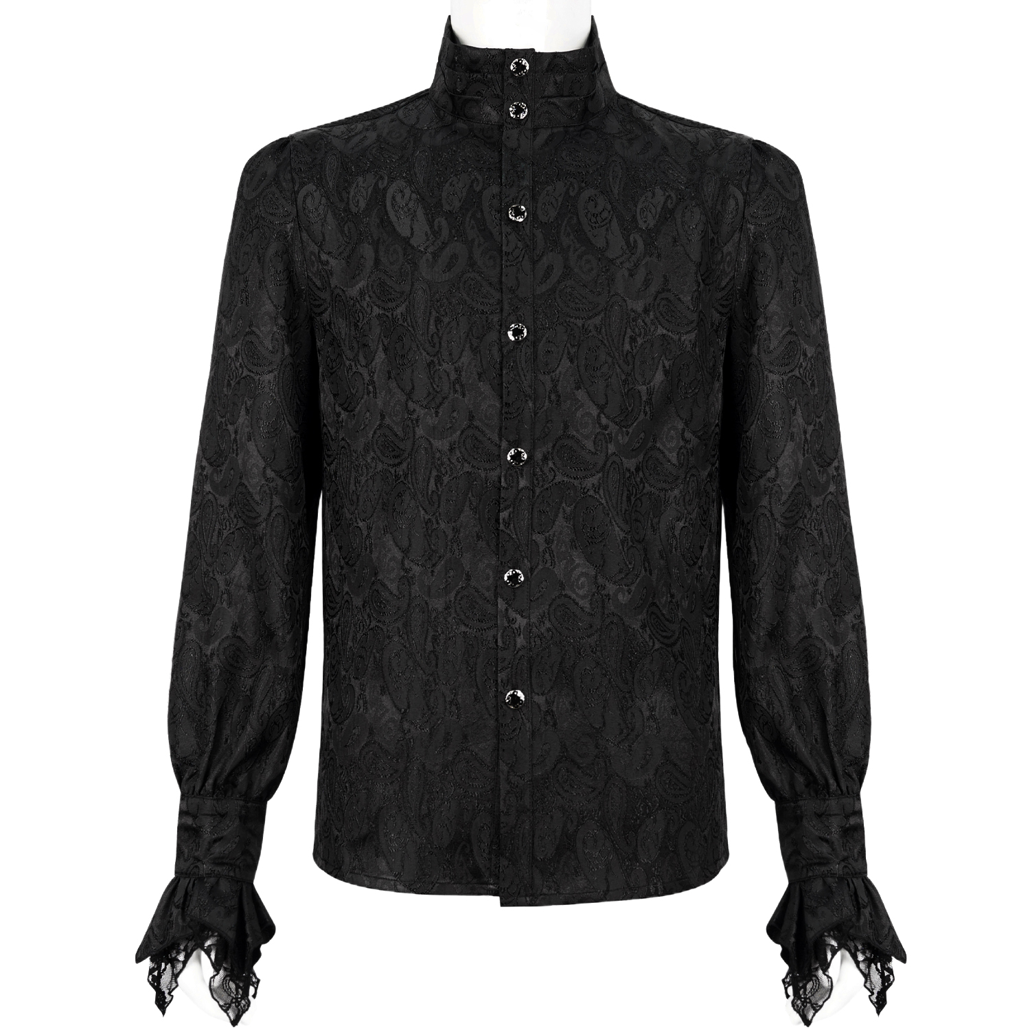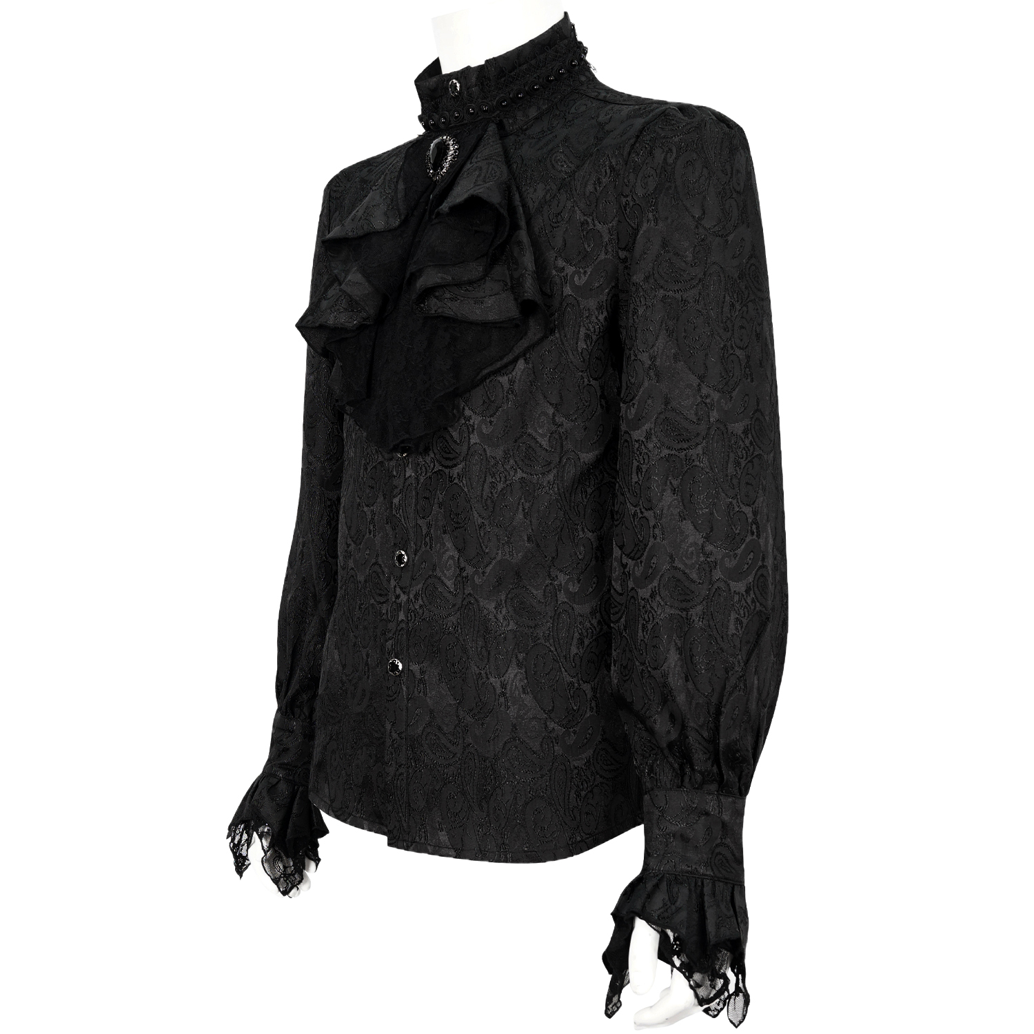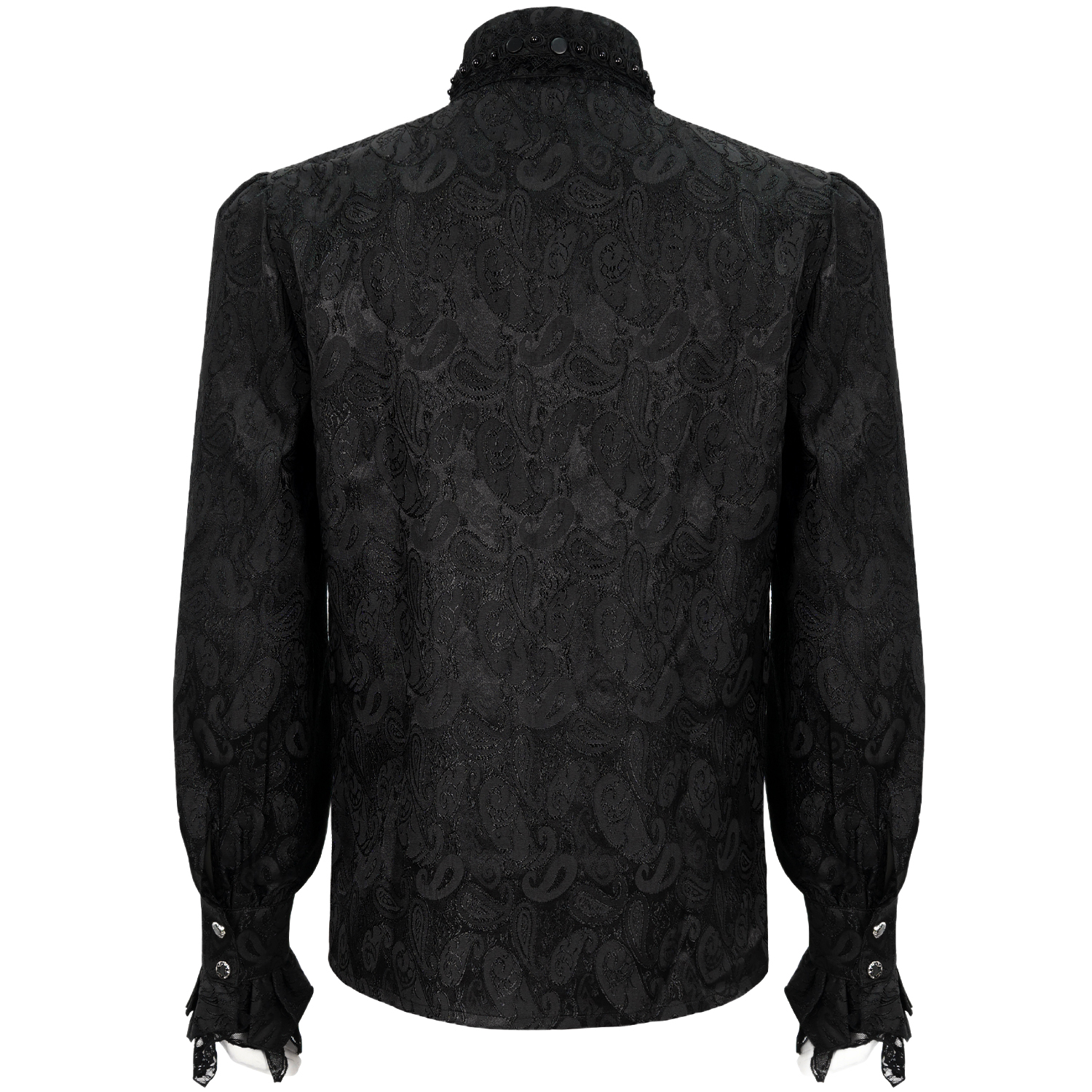 • Chemise gothique noire très originale • Encolure haute à volants • Volants sur le devant • Perles blanches sur les épaules • Manches bouffantes • Poignets ornés de dentelle • Boutons...