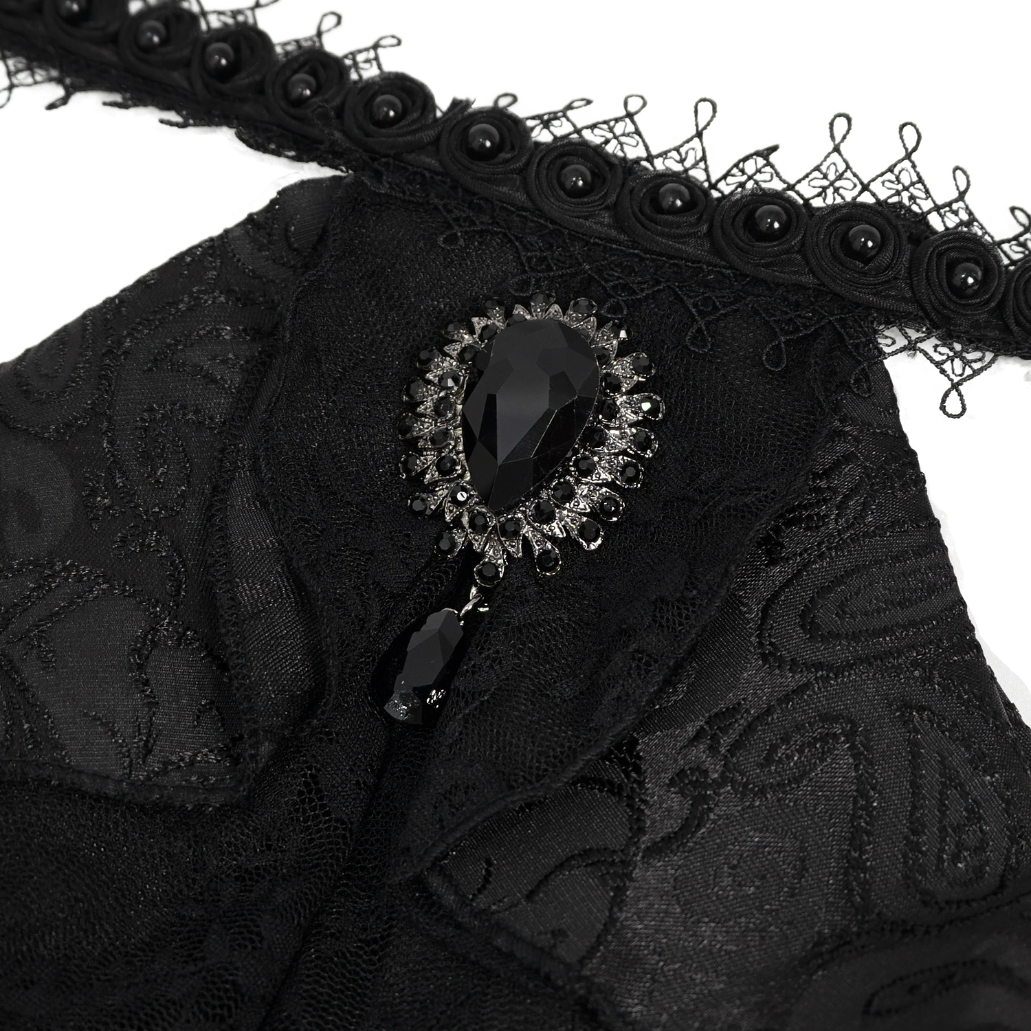 • Jabot amovible en dentelle tridimensionnelle noire avec des perles noires tout autour du cou