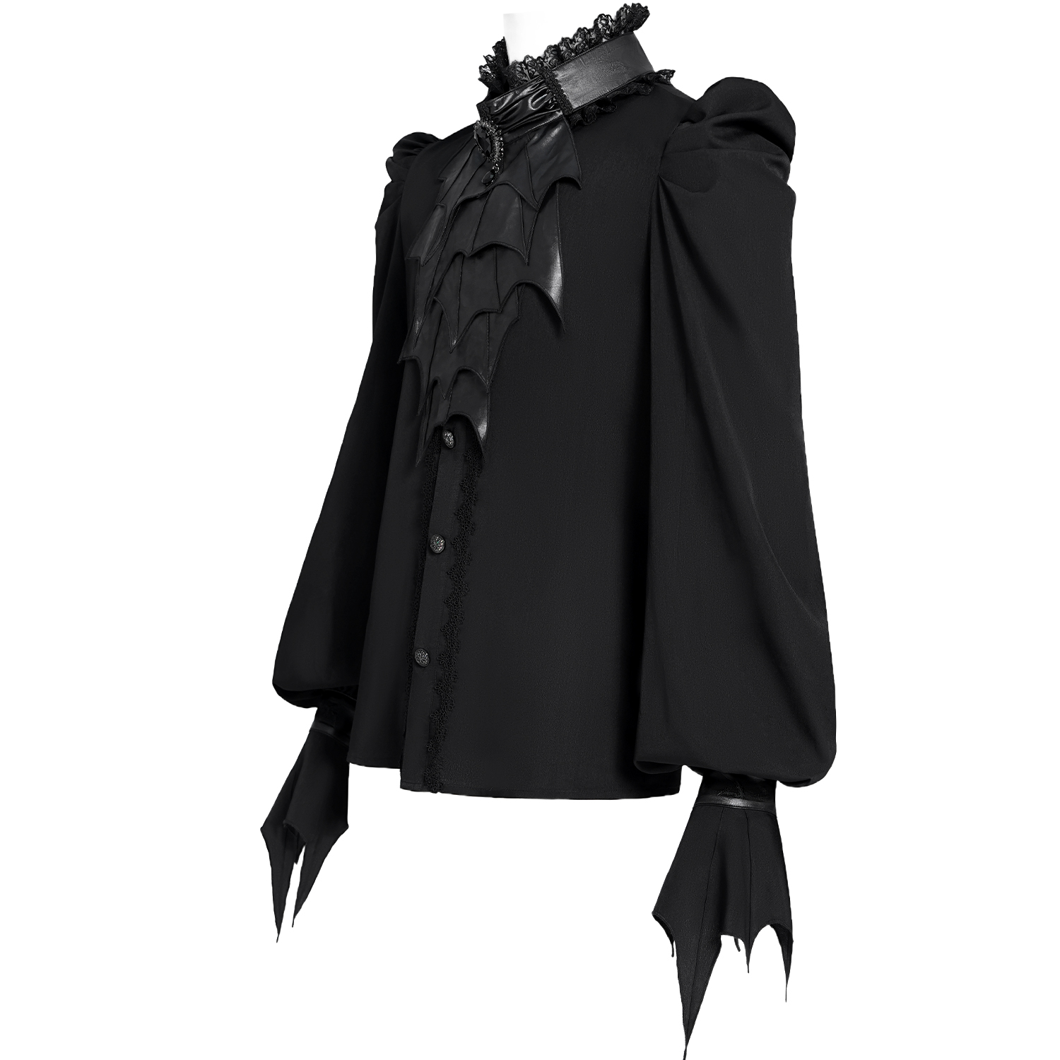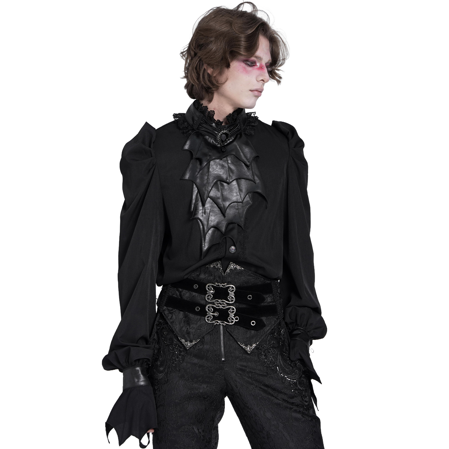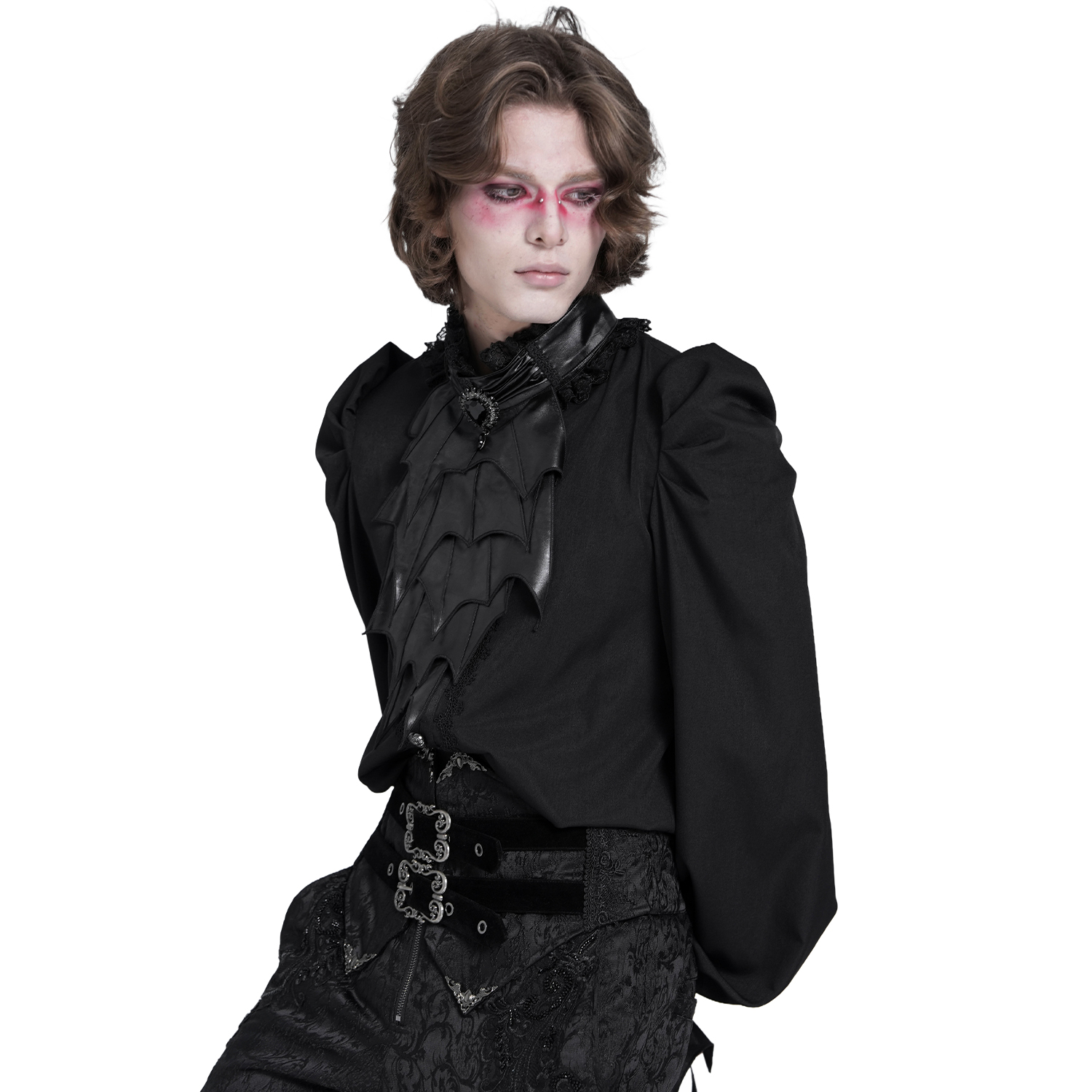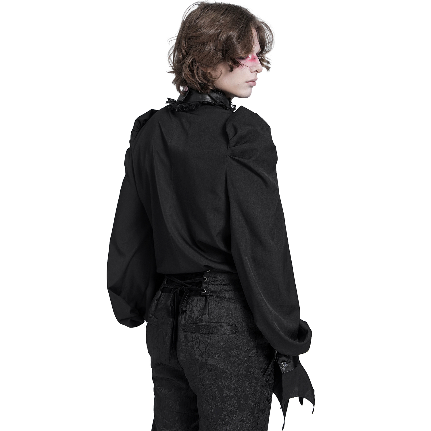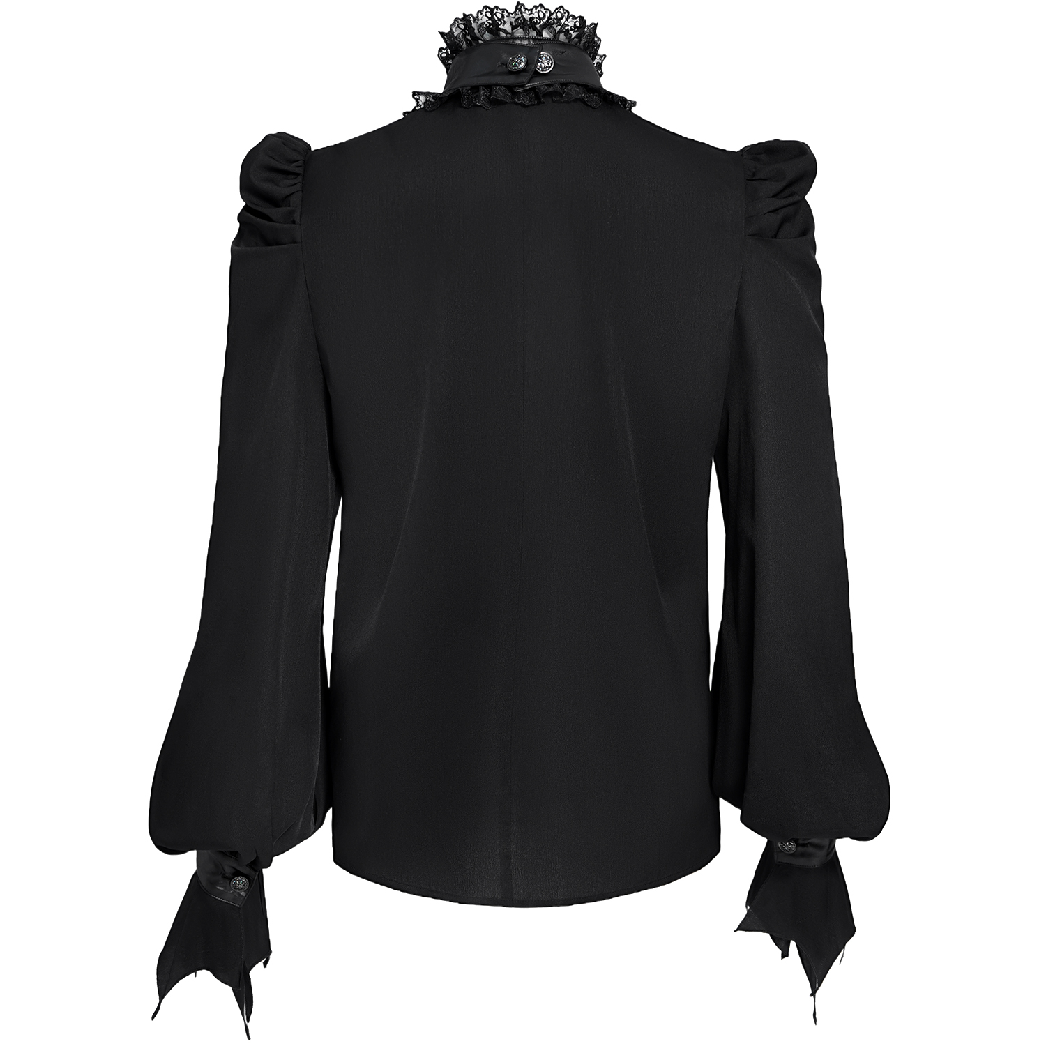 • Chemise gothique noire très originale • Encolure haute à volants • Volants sur le devant • Perles blanches sur les épaules • Manches bouffantes • Poignets ornés de dentelle • Boutons...