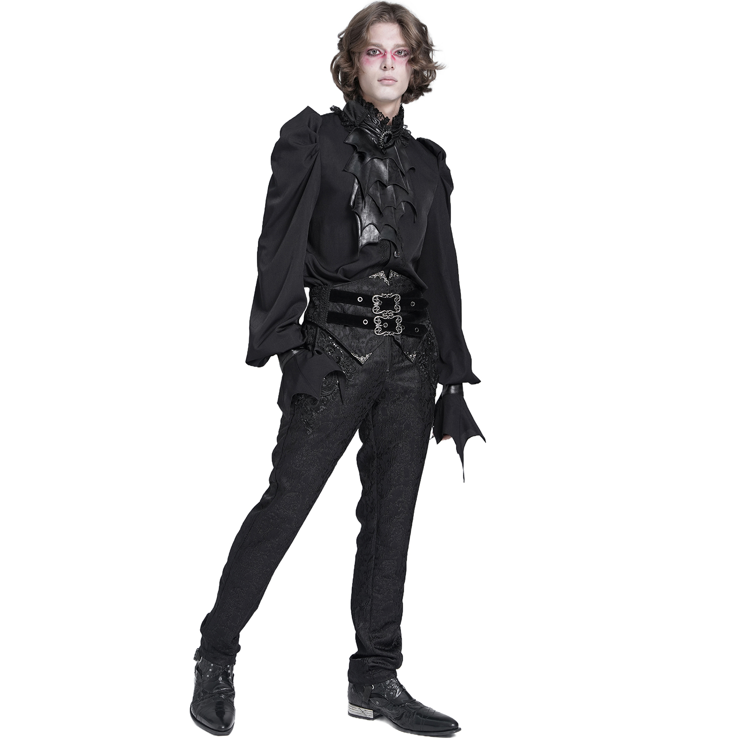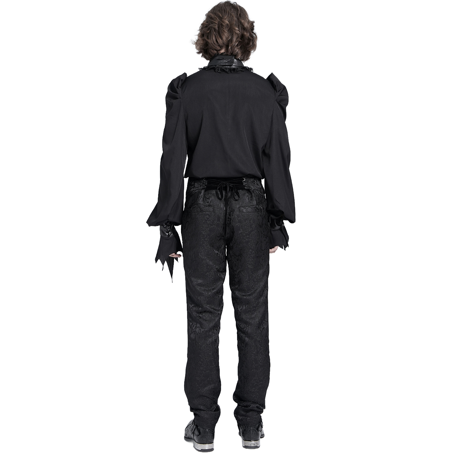 Chemise noire de style gothique victorien pour hommes • Boutons en relief couleur argent foncé • Poignets bordés de dentelles • Col haut bordé de dentelle à volants • Broderies de chaque côté sur...