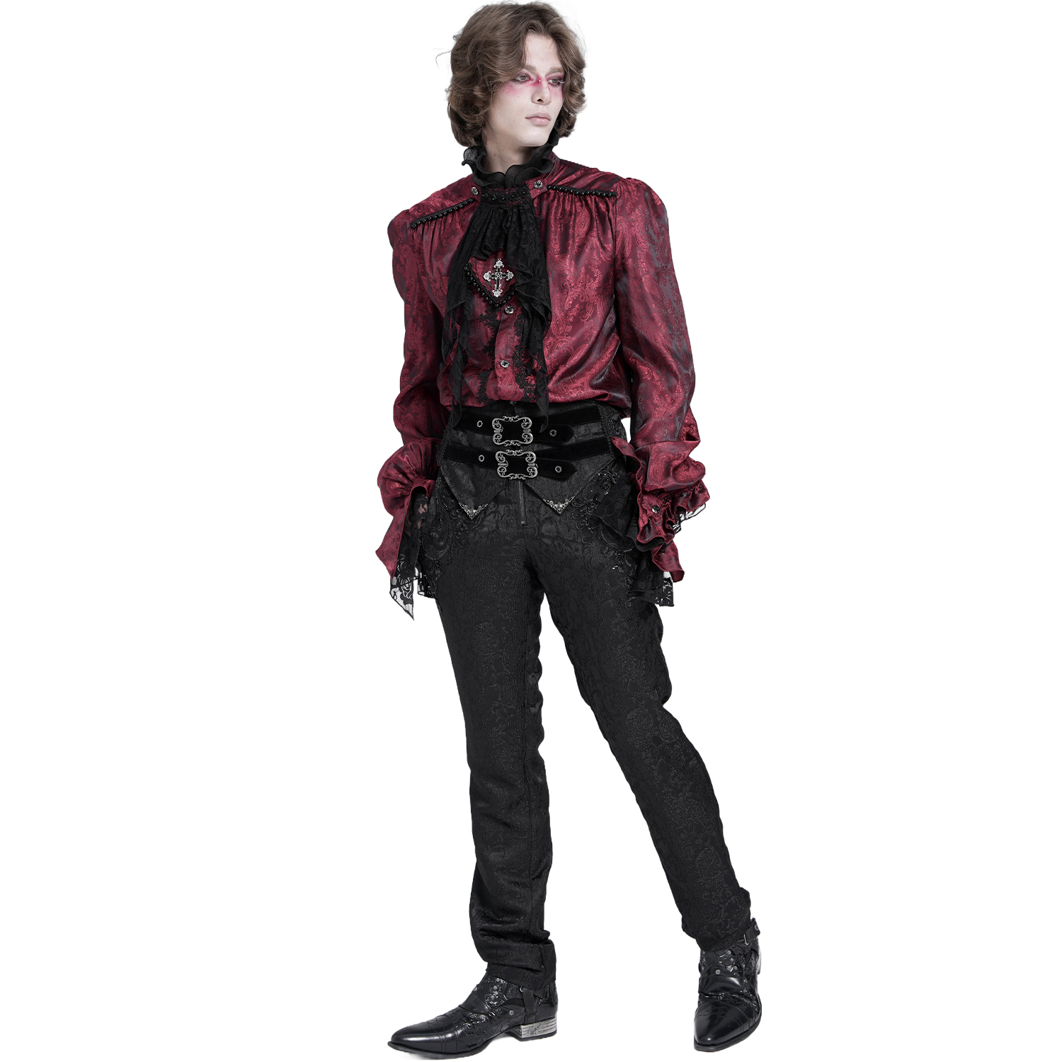 Chemise blanche de style gothique victorien pour hommes • Boutons en relief couleur argent foncé • Poignets bordés de dentelles • Col haut bordé de dentelle à volants • Broderies de chaque côté sur...