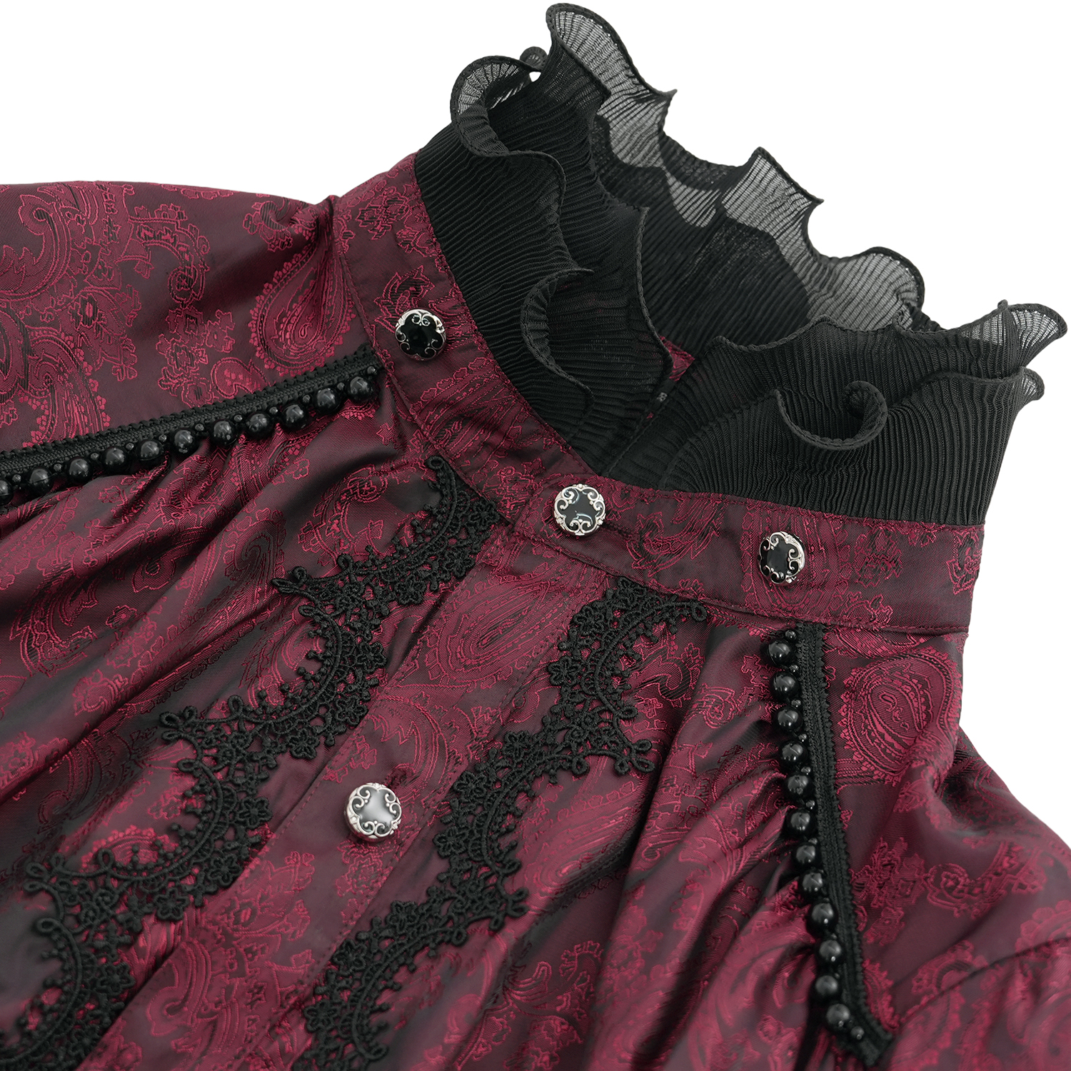 • Design plissé sur le devant avec broderies en forme de cercueil • Galon fleuri gothique brodé à la main sur le côté • Fermeture sur le devant avec des boutons gravés • Manches et col à volants...