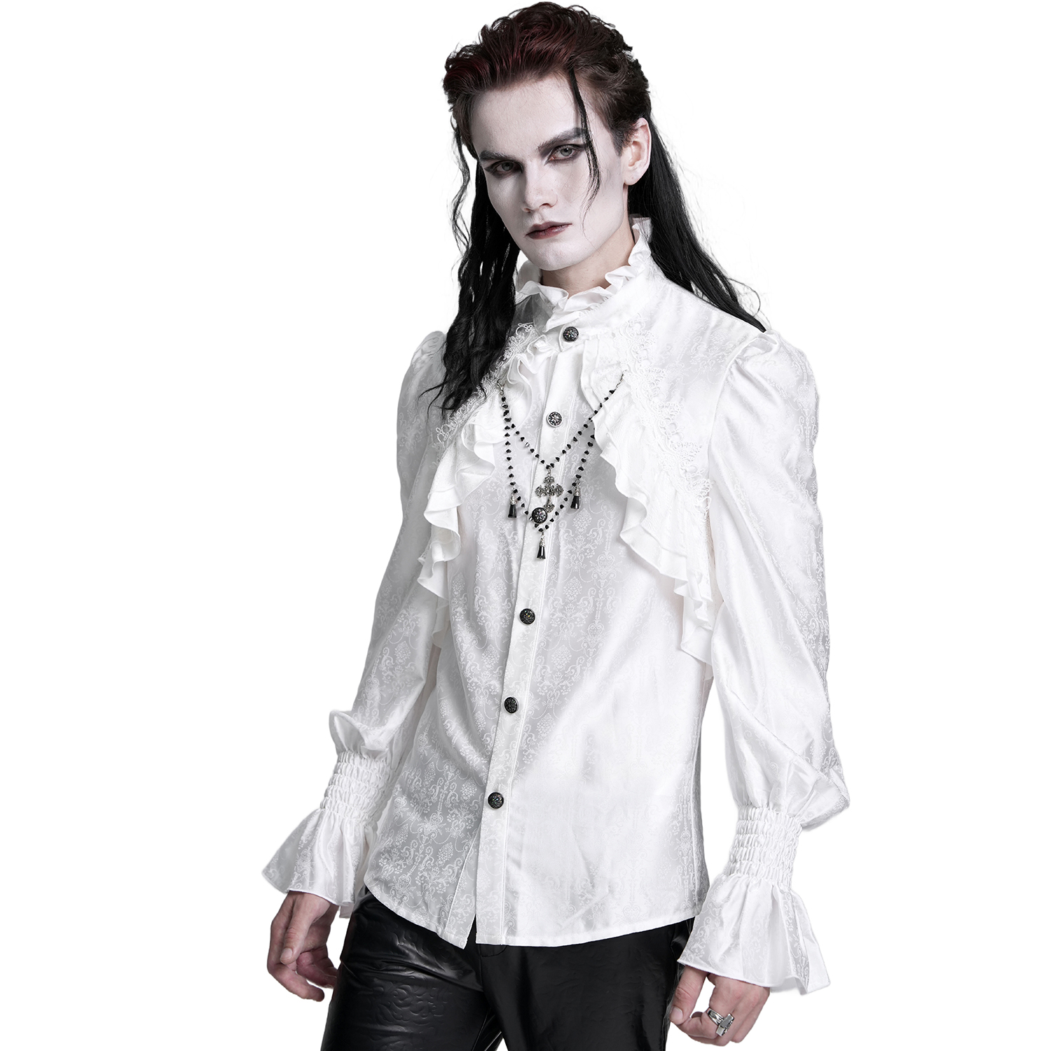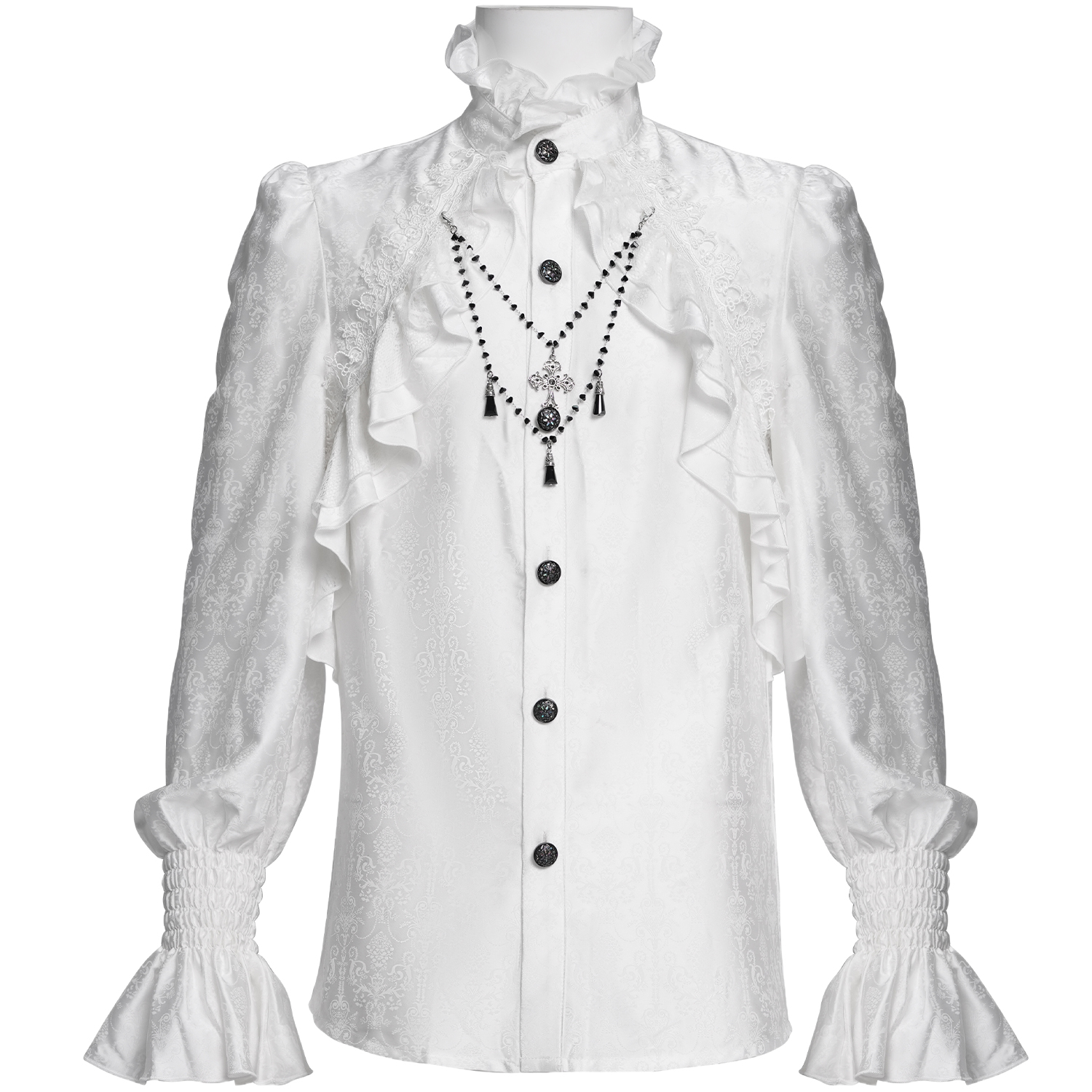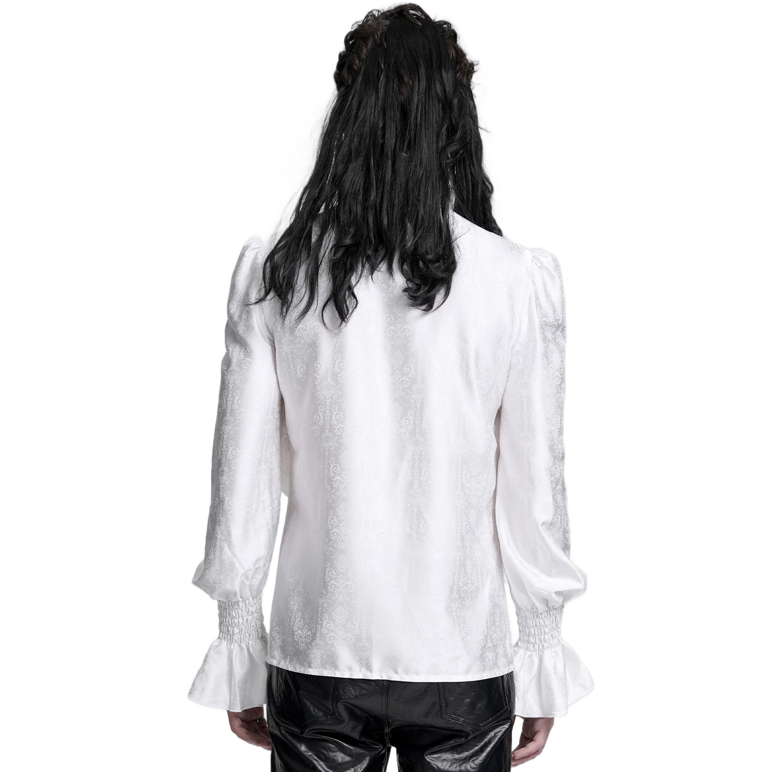 Chemise à jabot de style gothique pour hommes • En jacquard blanc • Poignets fermés par deux boutons métalliques • Col haut bordé de dentelle à volants • Cravate amovible • 96% Coton, 4% Élasthanne...