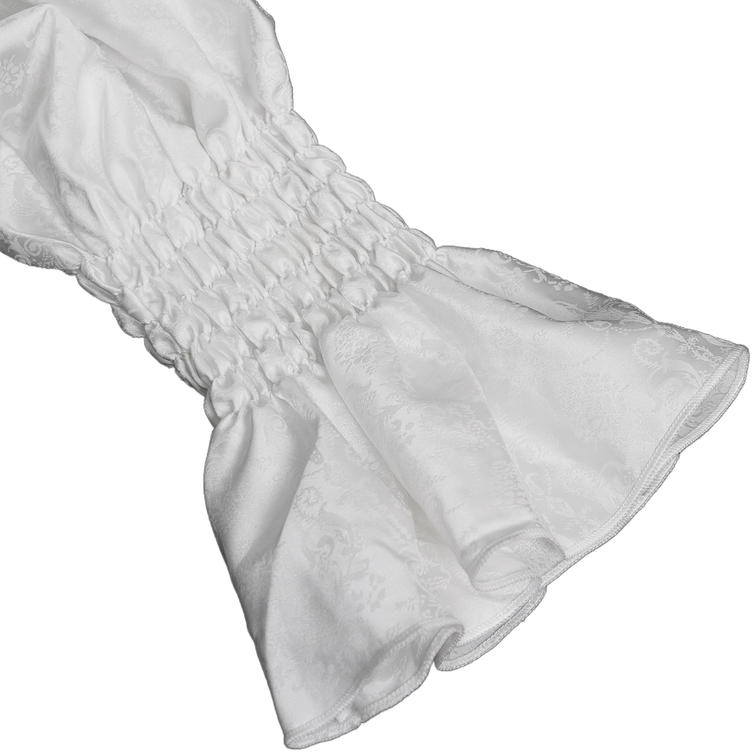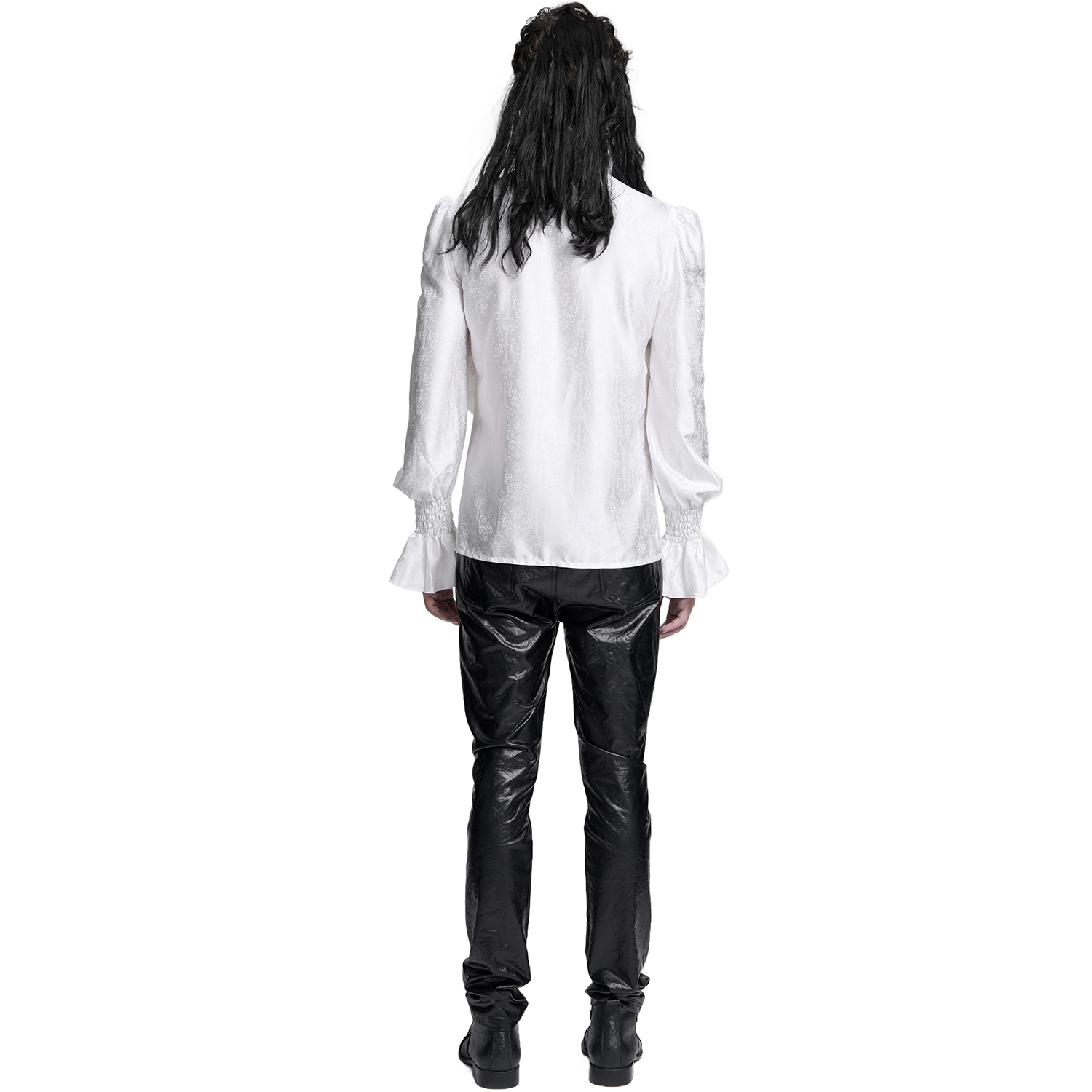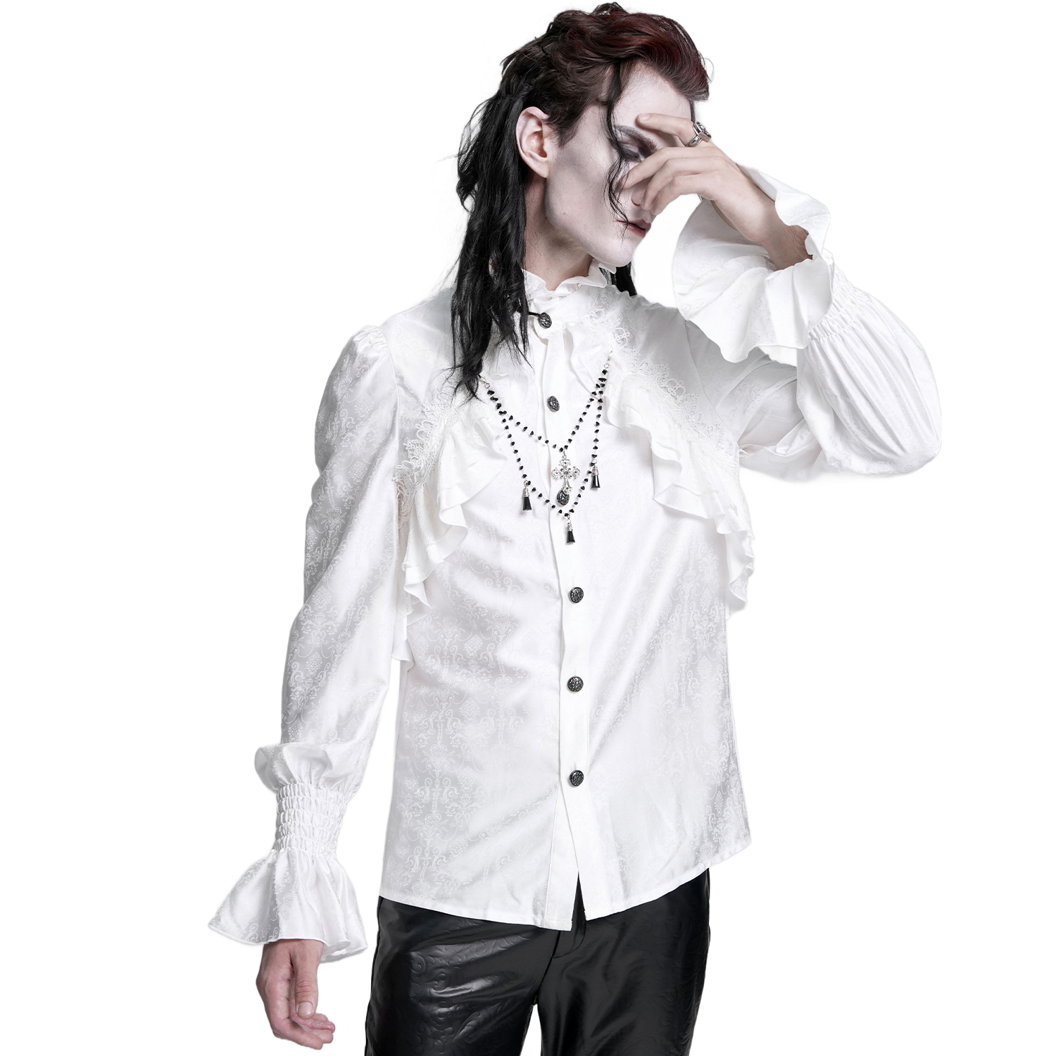 Chemise à jabot de style gothique pour hommes • En jacquard blanc • Poignets fermés par deux boutons métalliques • Col haut bordé de dentelle à volants • Cravate amovible • 96% Coton, 4% Élasthanne...