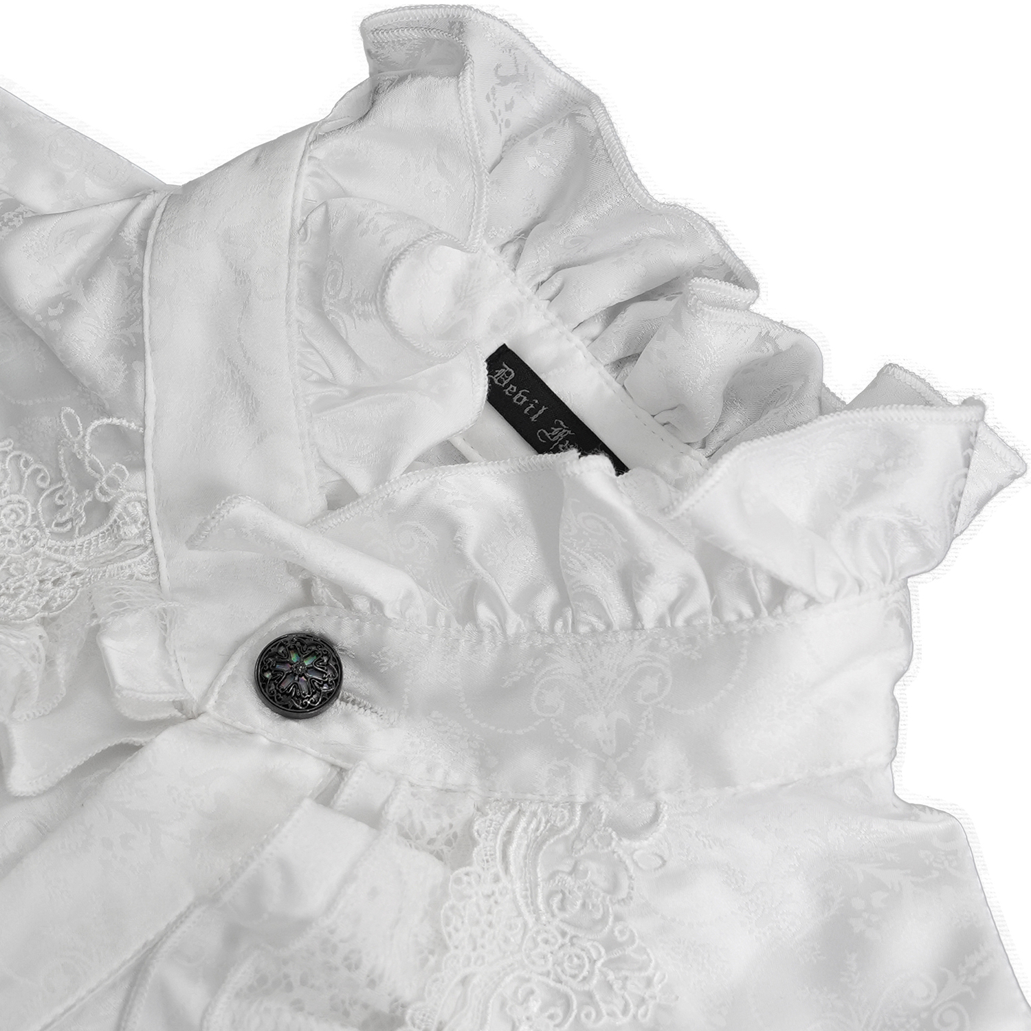 Chemise gothique à manches longues pour hommes • En polyester blanc doux, léger et semi-transparent • Dentelle noire à volants • Fermeture sur le devant par boutons personnalisés • Col mandarin...