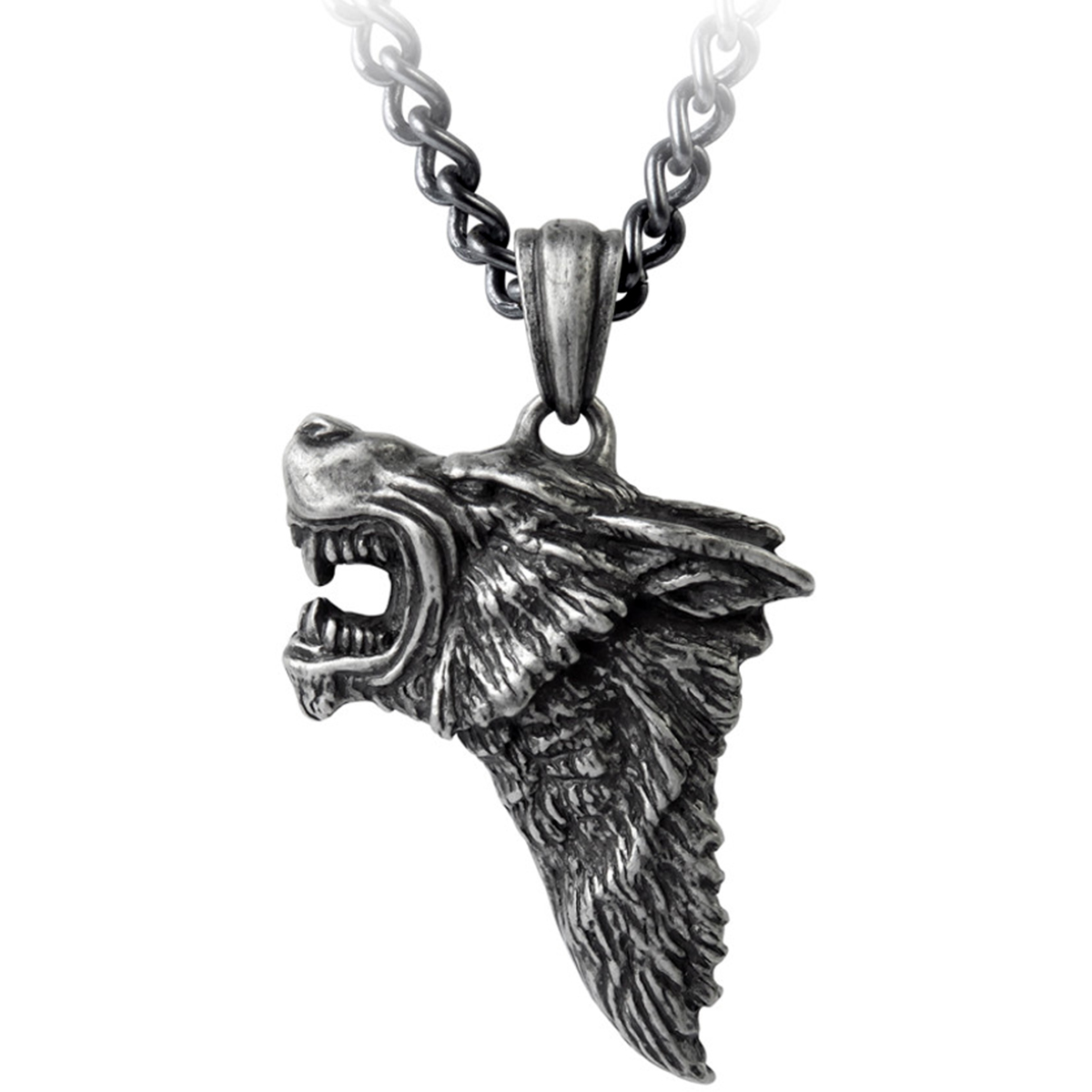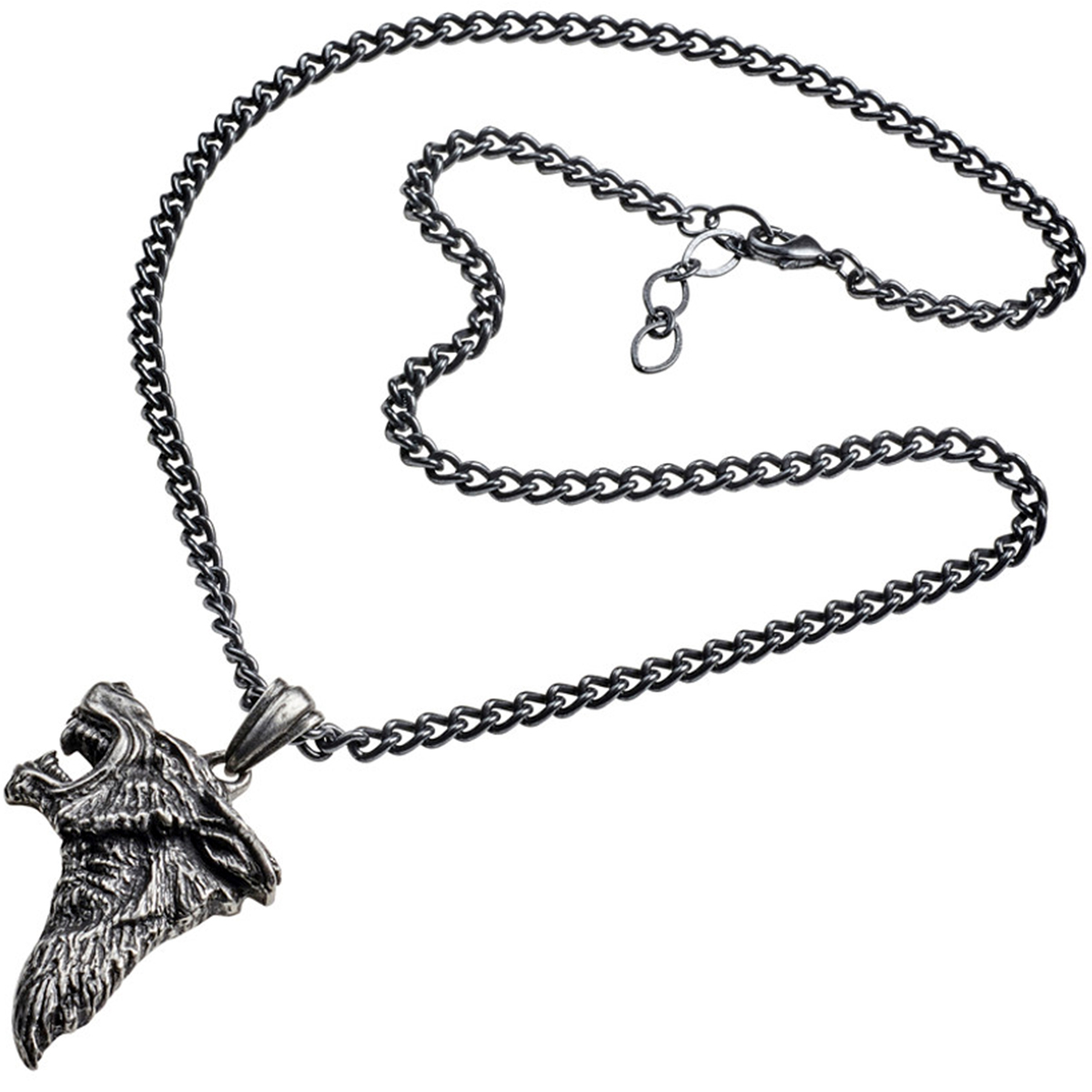• Un pendentif tête de loup en étain vieilli, hargneux, de profil.