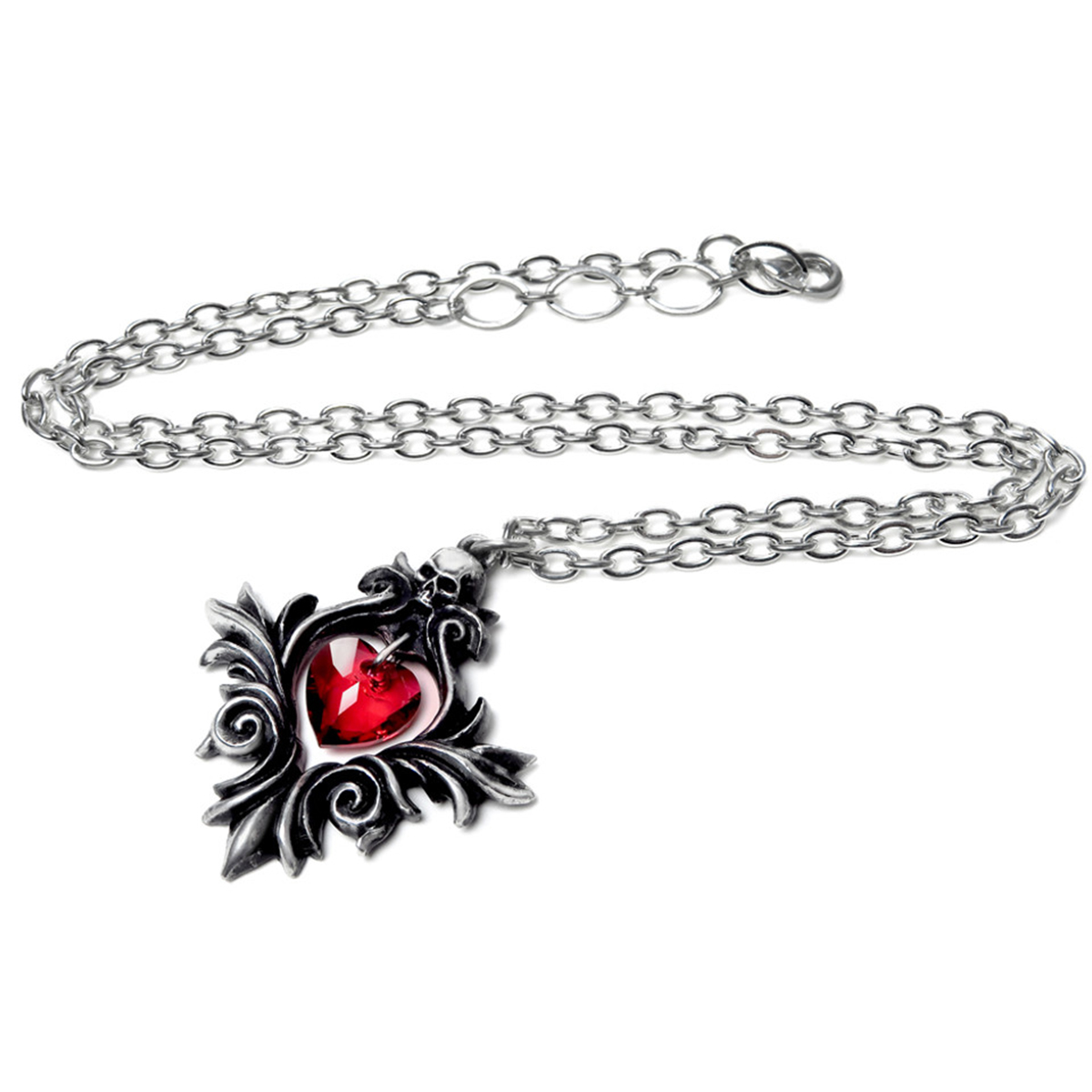• Un pendentif en étain antique de 40 mm de long avec un cadre baroque en volutes surmonté d'un petit crâne et avec un cœur en cristal autrichien rouge suspendu en son centre.