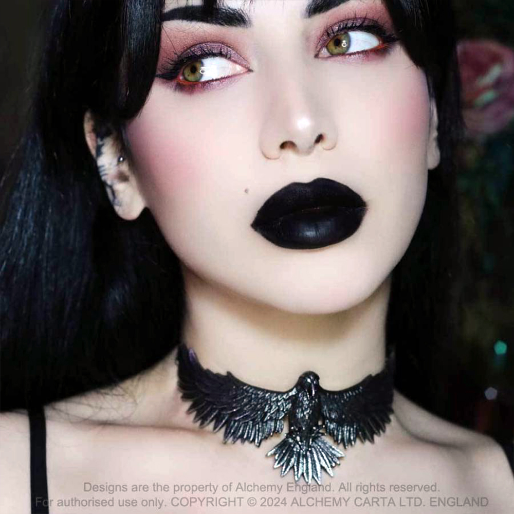 Ailes de la nuit guidant le porteur vers un havre sombre de plaisirs inconnus et de passions illicites. • Un tour de cou étroit en similicuir noir de 1 cm de large avec de l'étain vieilli, un cœur...