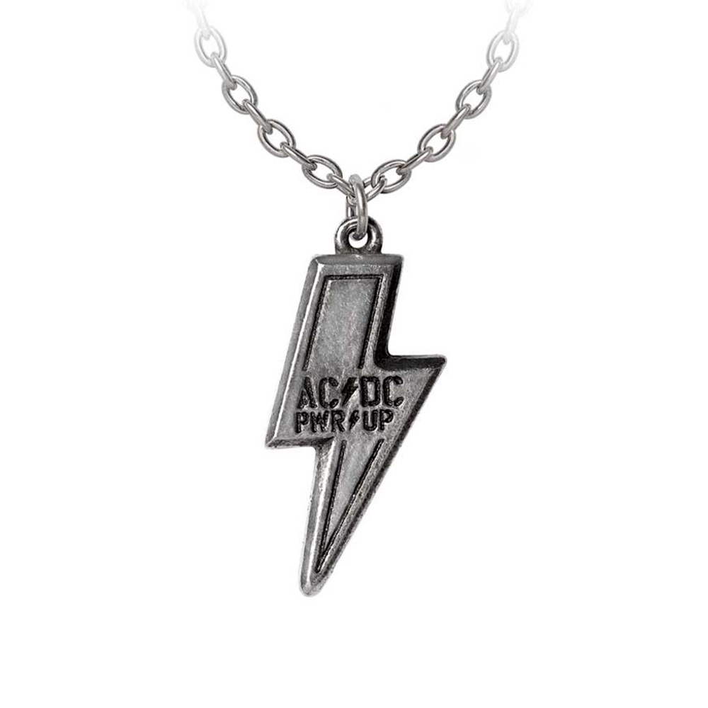 • Pendentif avec logo flash AC/DC en étain vieilli gravé du logo 'PWR UP'.
