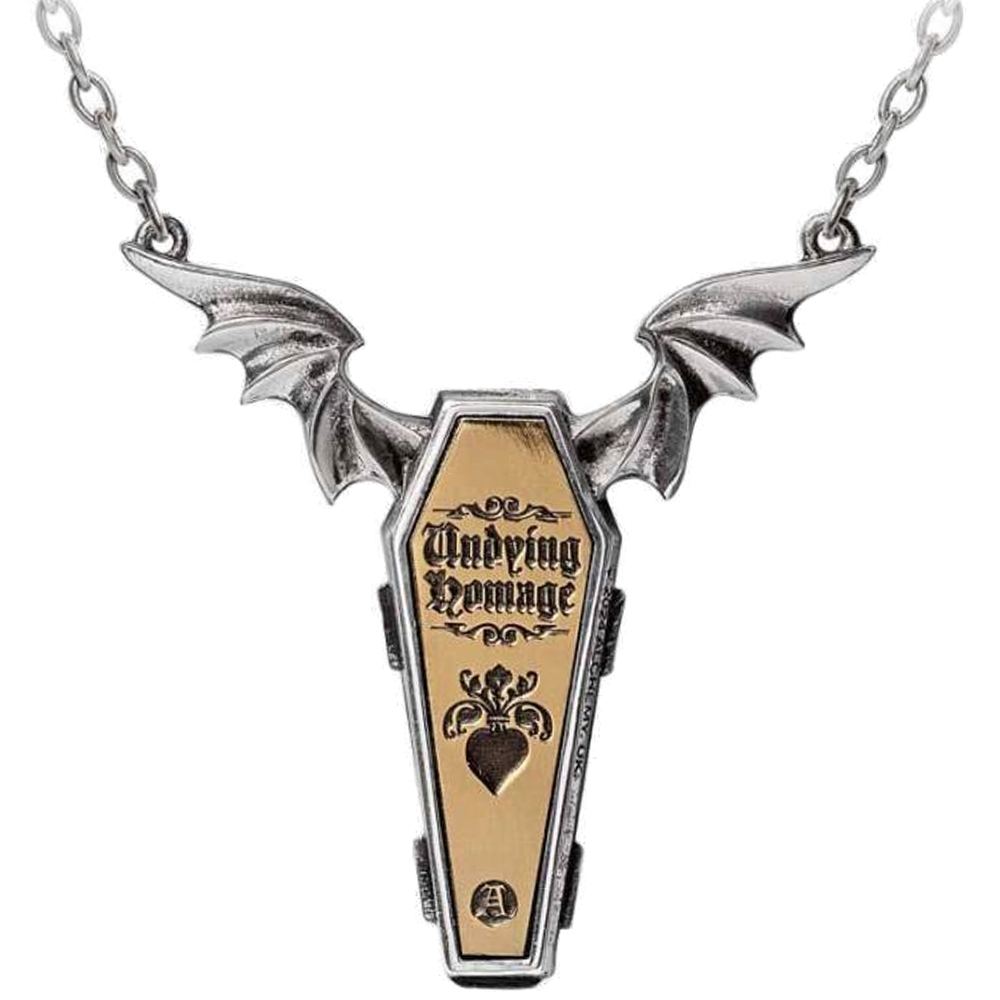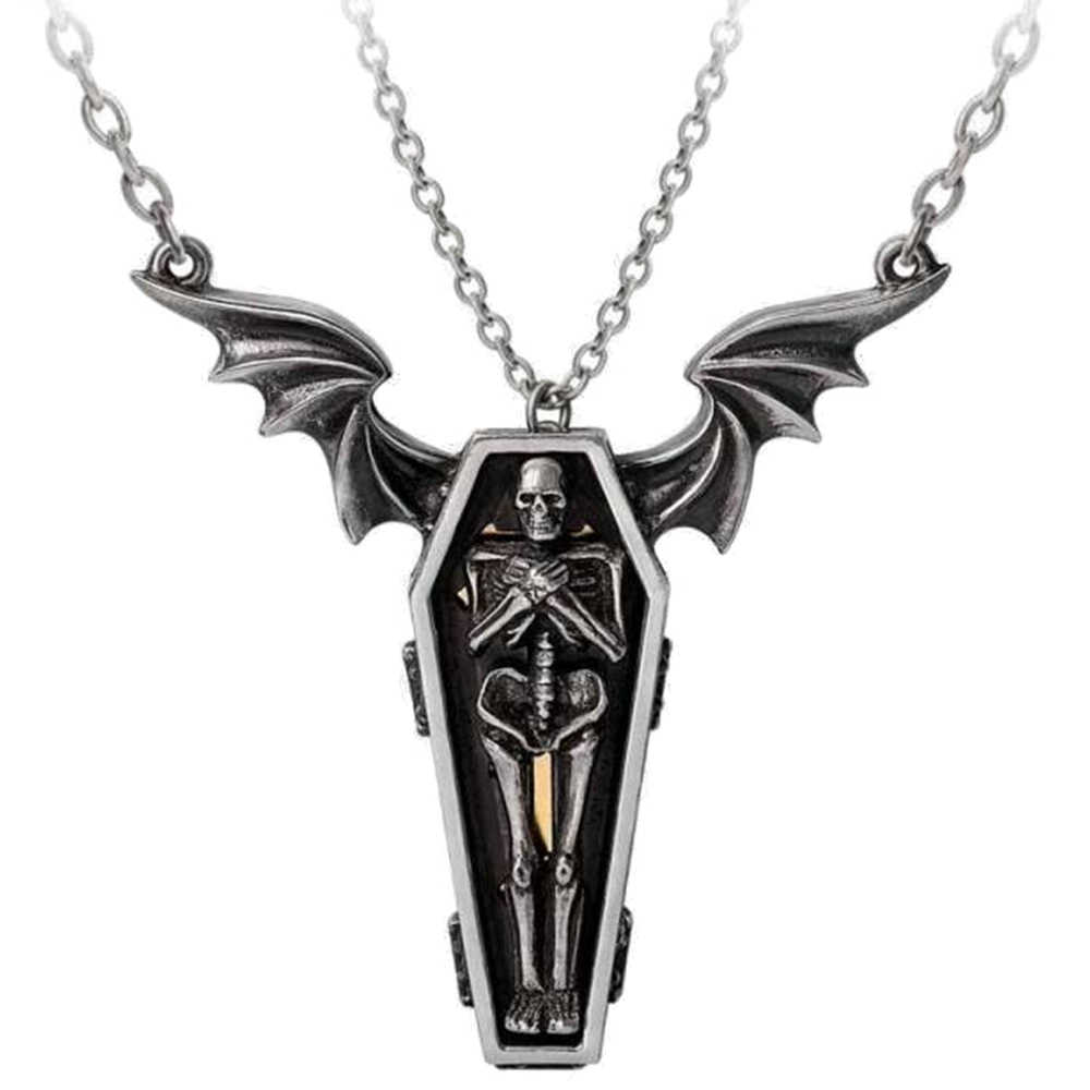 • Embrassez la profonde connexion que vous partagez avec votre partenaire grâce au superbe collier de couple en deux pièces 'Undying Homage' avec cercueil et squelette.
