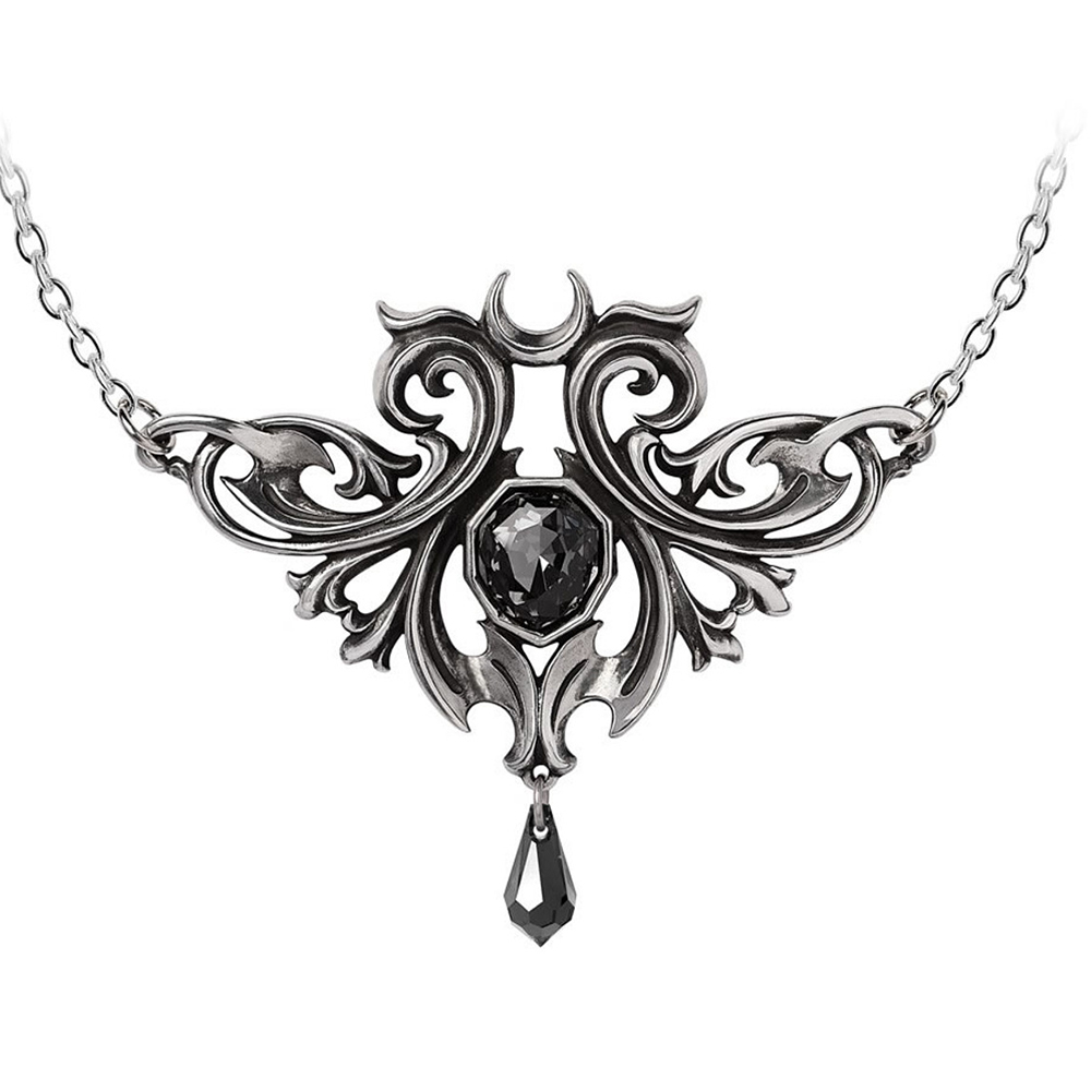 Un écheveau de chauves-souris voltige autour de ce profond et sinistre présage. • Un collier spectaculaire digne d'un roi ou d'une reine vampire avec la lune en émail rouge translucide et entouré...