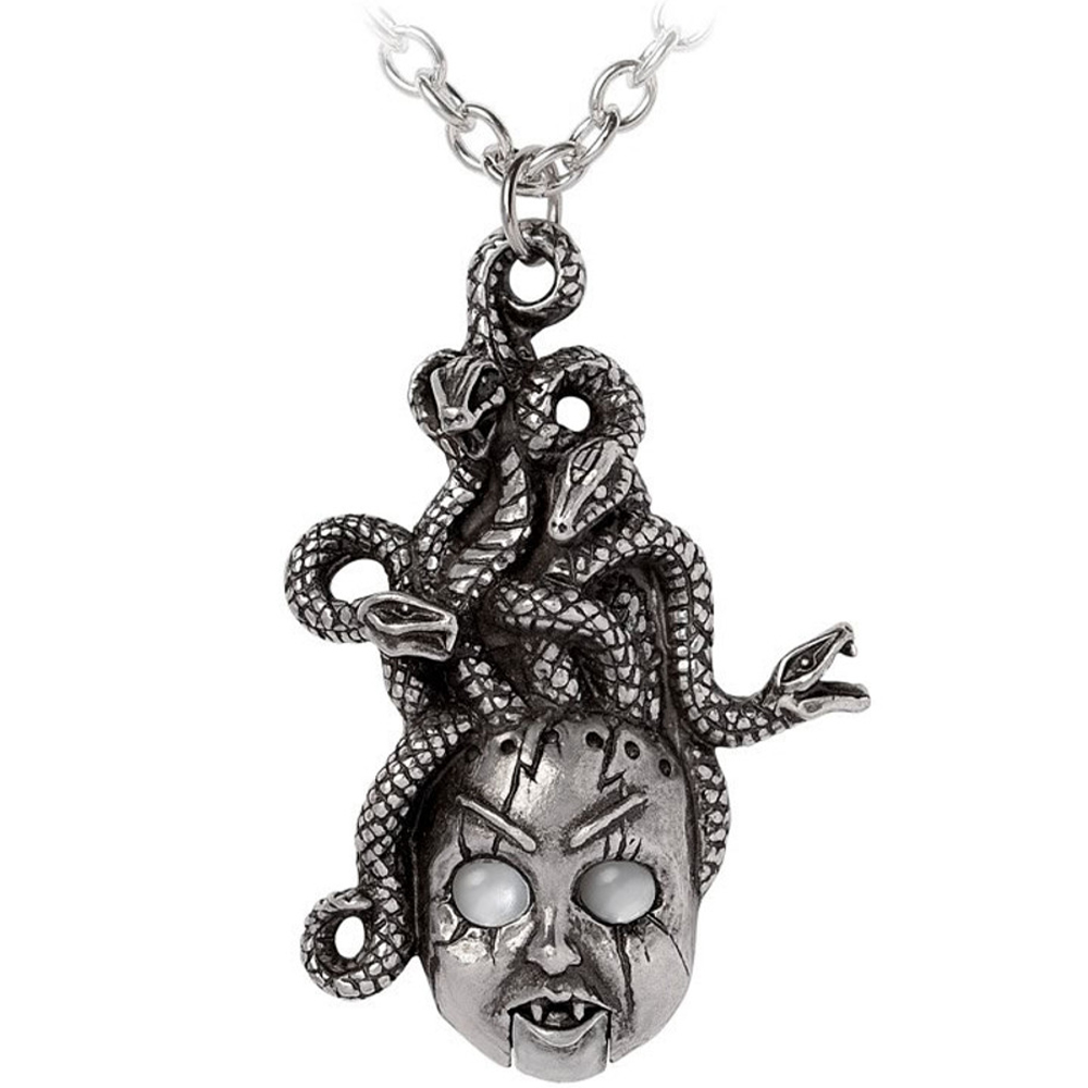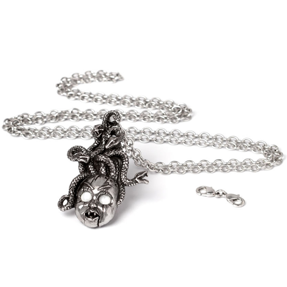 • Ce pendentif d'une beauté envoûtante représente une tête de poupée, étrangement réaliste et pourtant indéniablement troublante, avec un regard vide qui en dit long sur la noirceur intérieure.