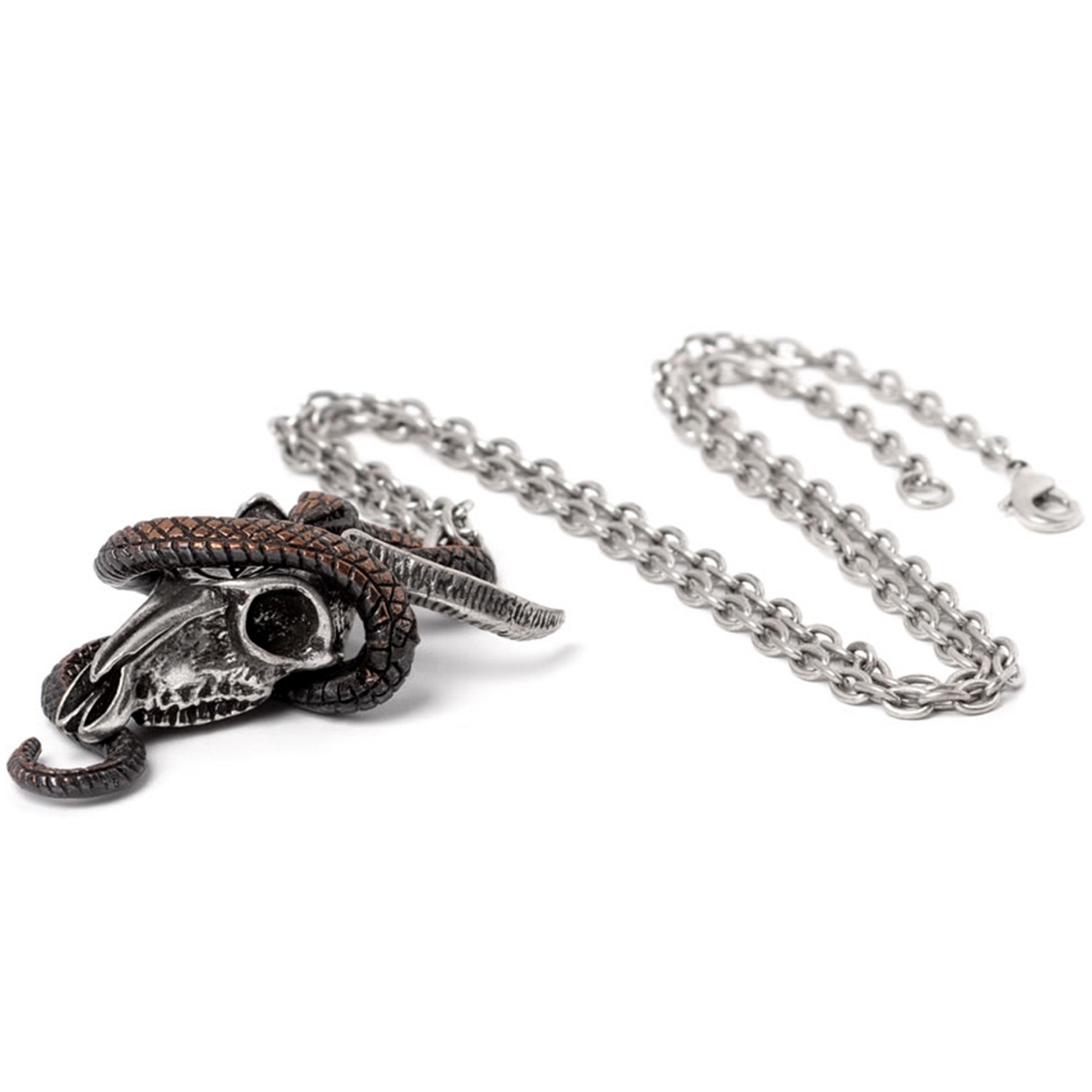 • Le crâne de bélier est coulé dans une teinte d'étain antique, avec un pentagramme audacieux en son centre, tandis qu'un serpent cuivré s'enroule autour du crâne, représentant la transformation et la renaissance.