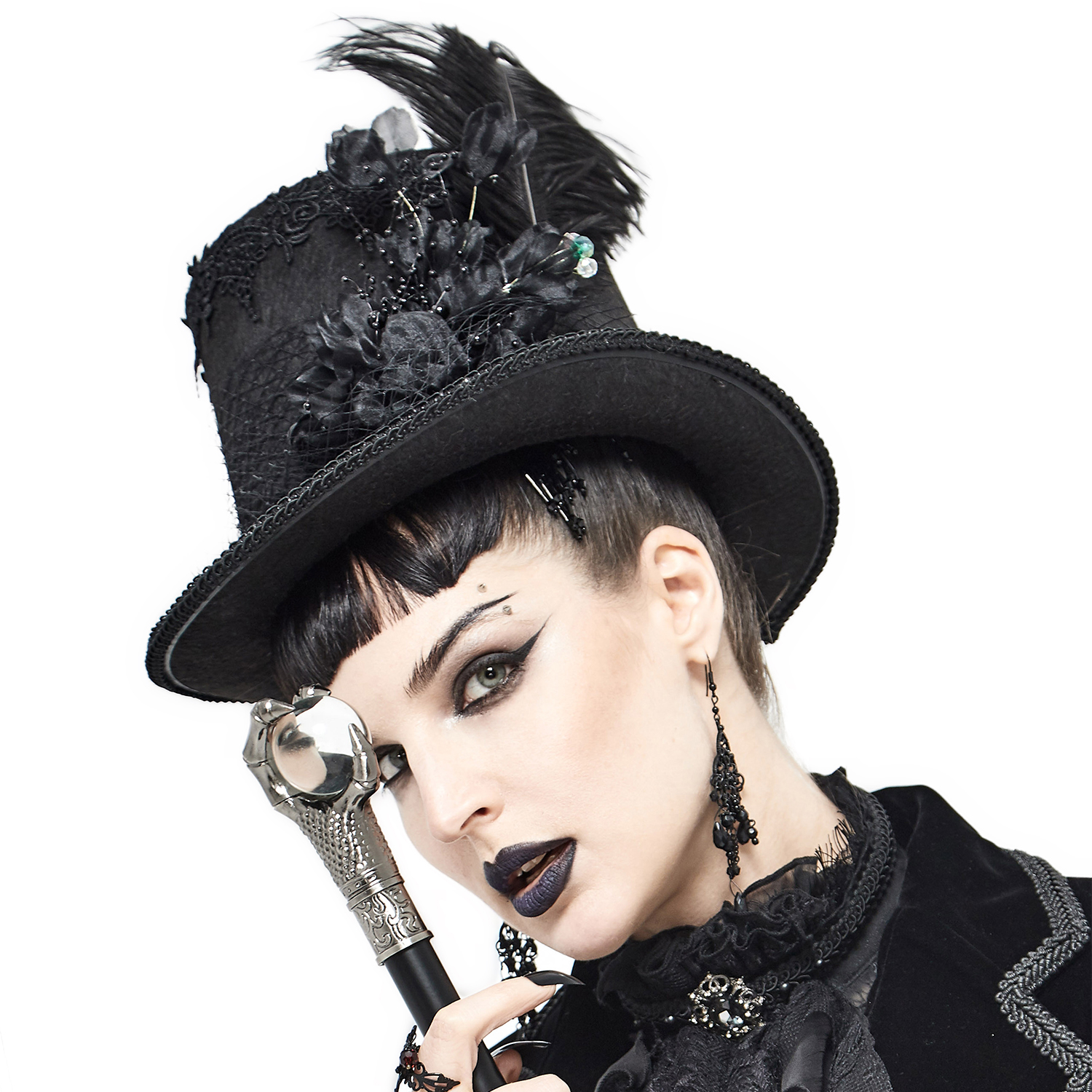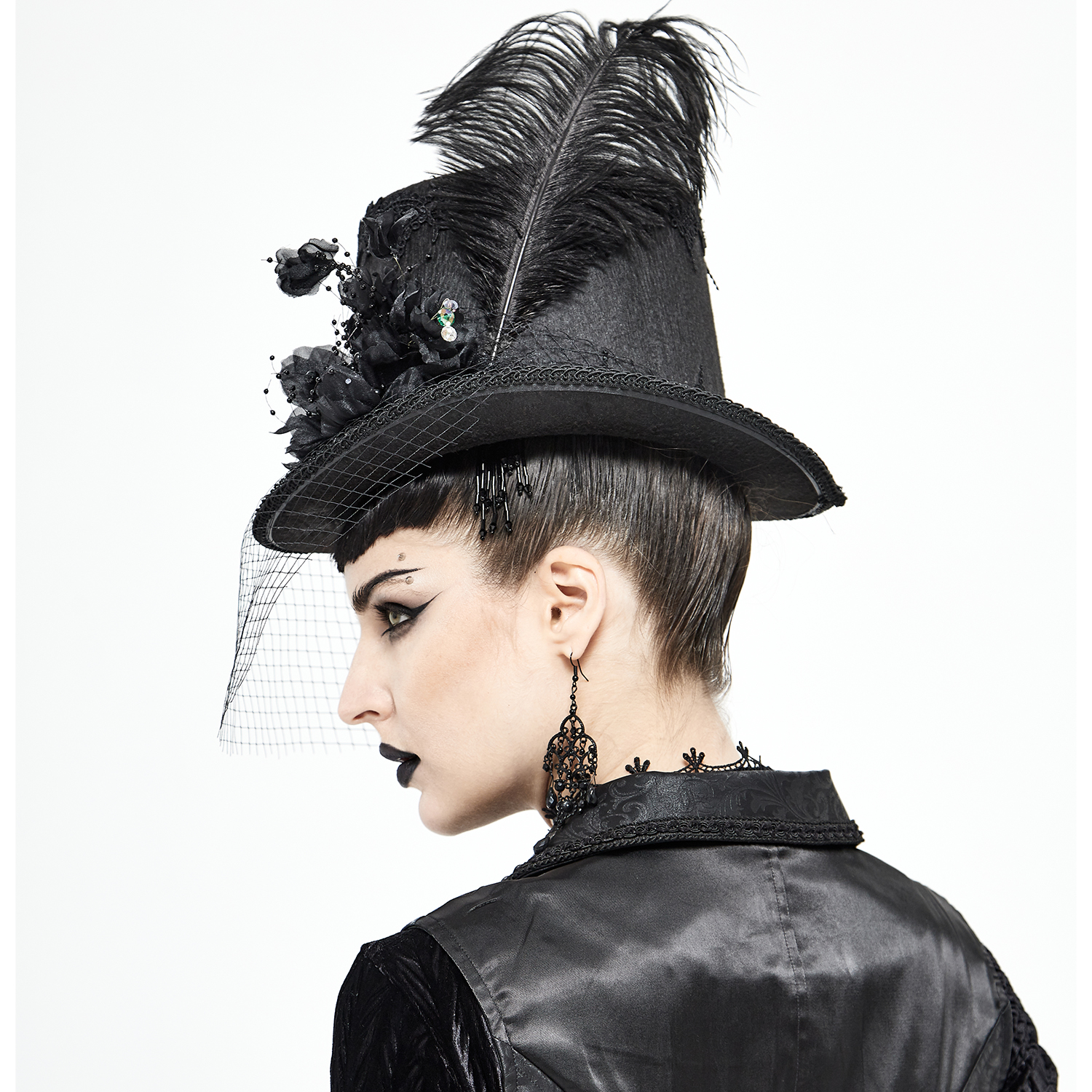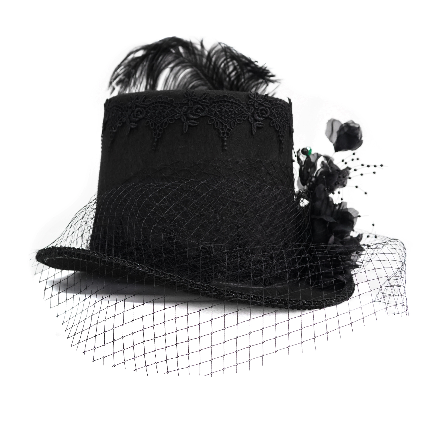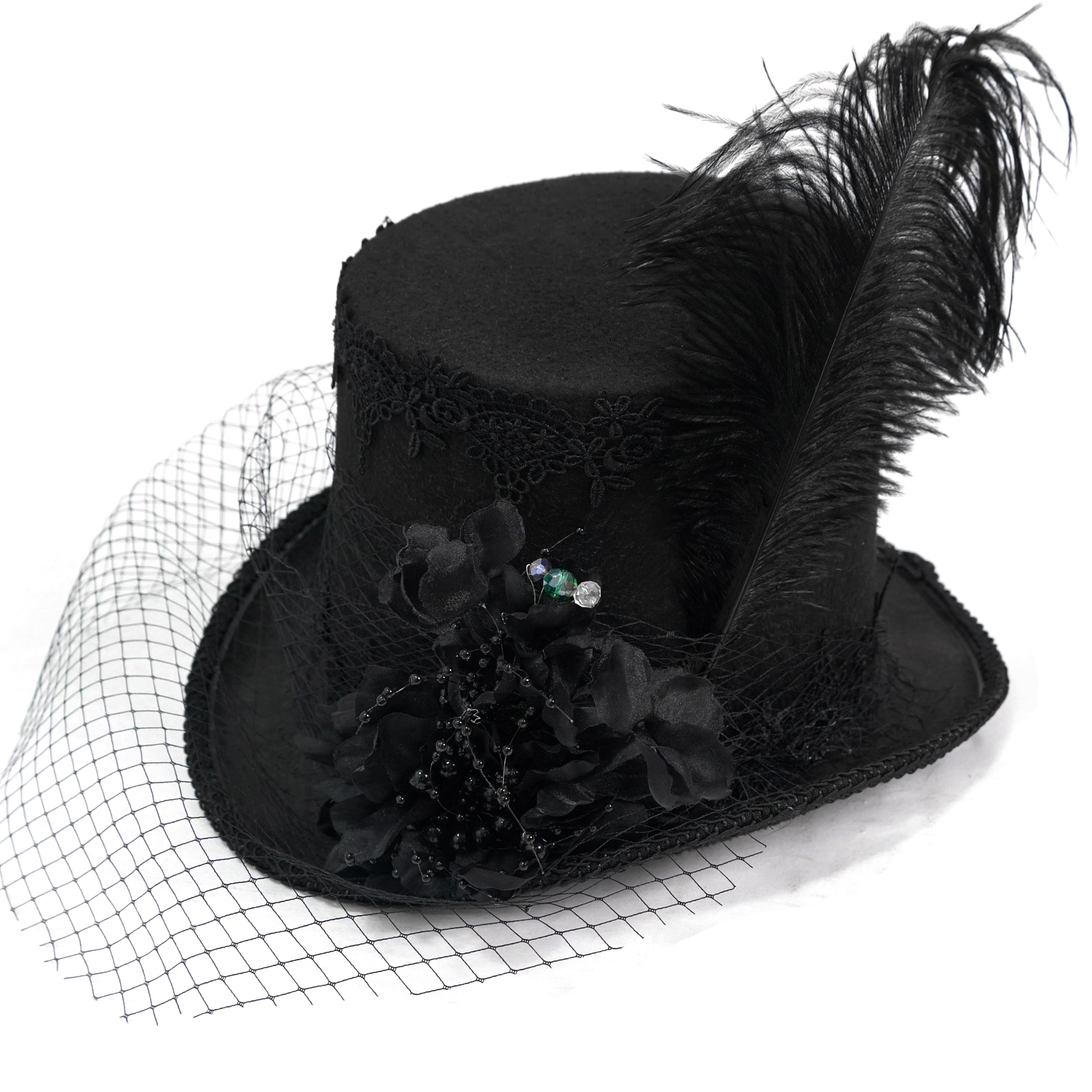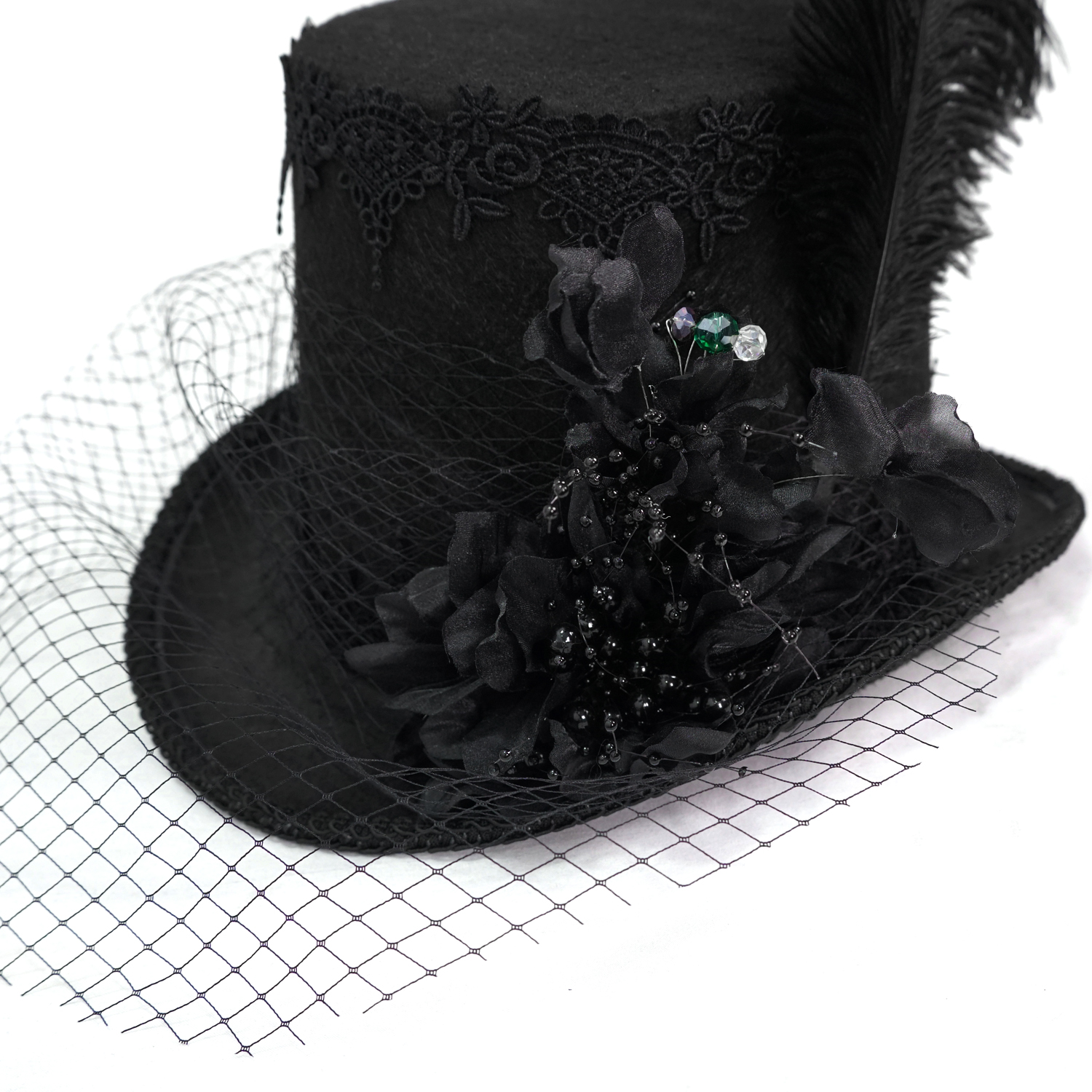 Chapeau haut de forme en feutre noir • Orné d'une large bordure en dentelle • Bordure tressée • Fleurs en tissu 3D avec perles noires et colorées • Voile en résille pouvant être rabaissée sur le...