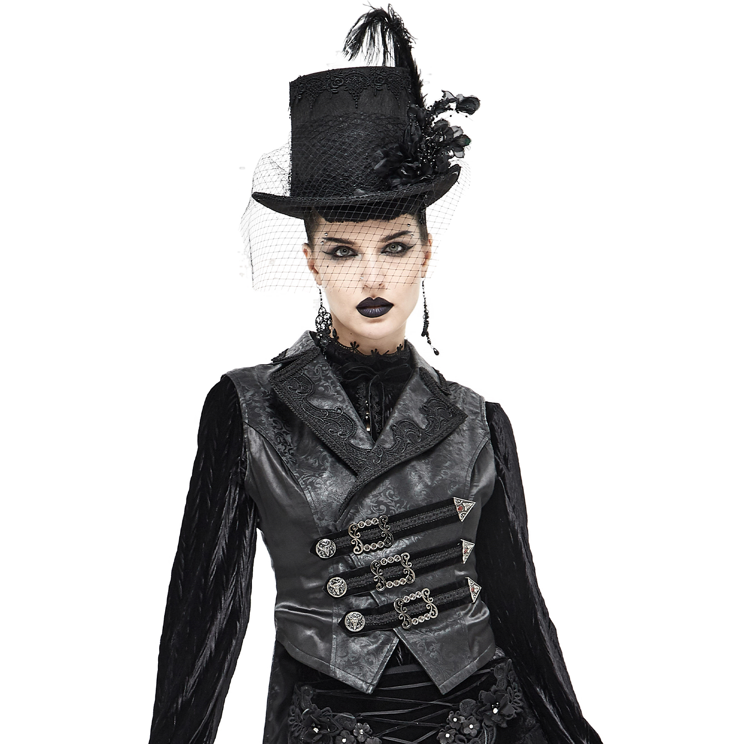• Long voile en fine dentelle noire • Coiffe ornée de fleurs 3D brodées et de perles scintillantes • Pierres noires suspendues au-dessus du front • Croix métallique sur le haut de la tête • Sangle...