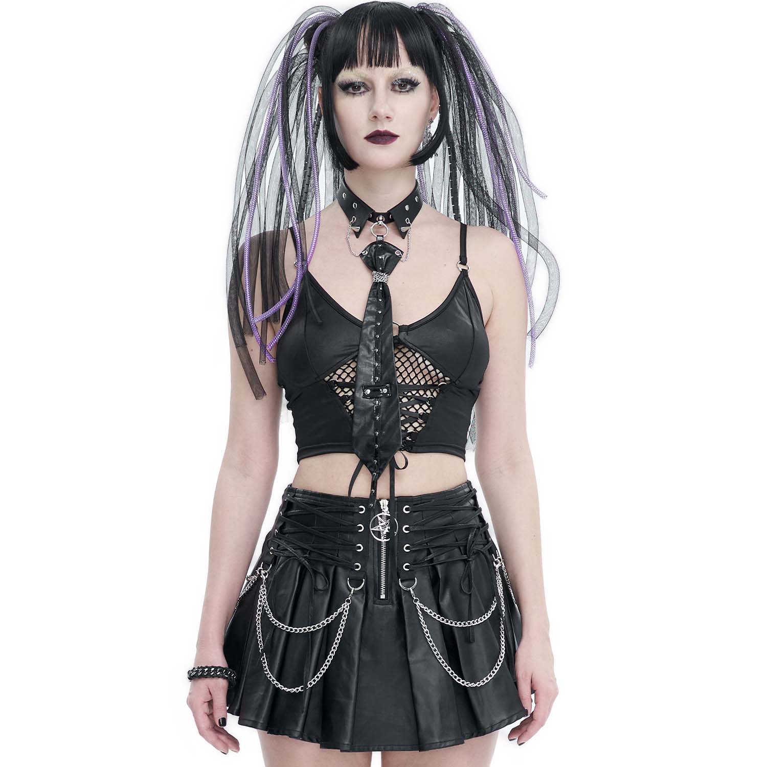 • En simili cuir • Chaînes métalliques avec œillets • Spikes coniques • Fermeture éclair cachée réglable au centre du dos. • 36% Simili Cuir, 36% Coton, 28% Polyester By Devil Fashion...