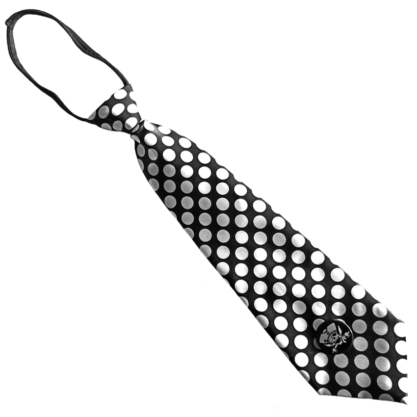 Des rayures noires et blanches audacieuses recouvrent cette cravate satinée. • Également agrémentée d'un badge et d'épingles de sûreté. • S'enfile facilement grâce à une fermeture à glissière, pour...