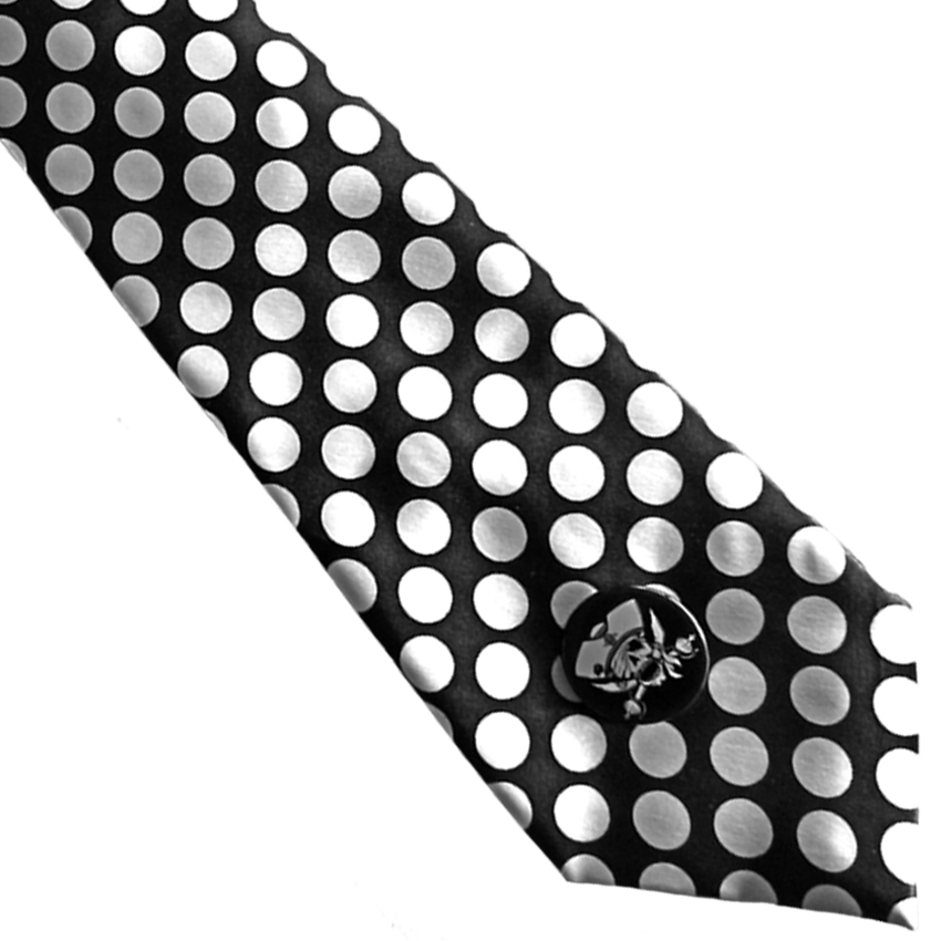 Cravate satinée noire à pois blancs.