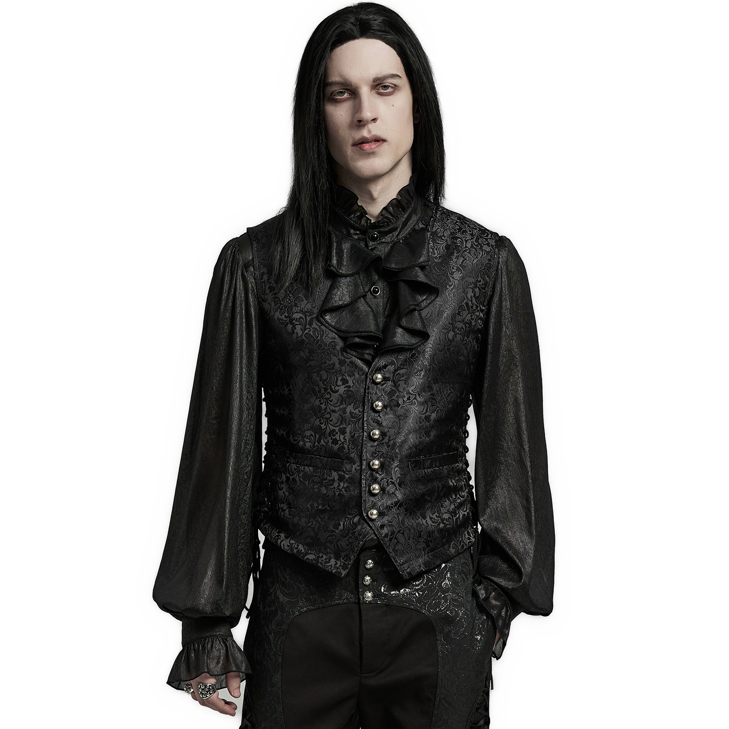 Gilet boutonné noir de style classique gothique victorien avec col en V, boutons noirs estampés et col en velours noir. • 59% Polyester, 41% Rayonne By Punk Rave GUIDE DES TAILLES EN...